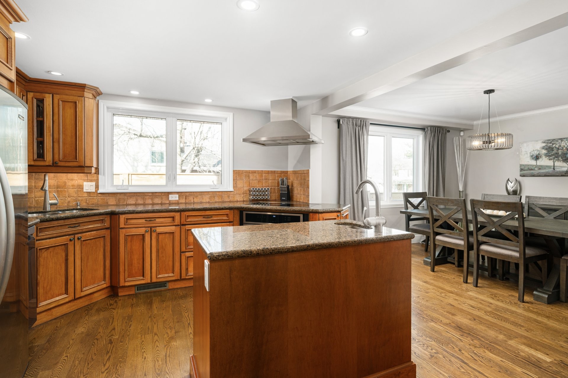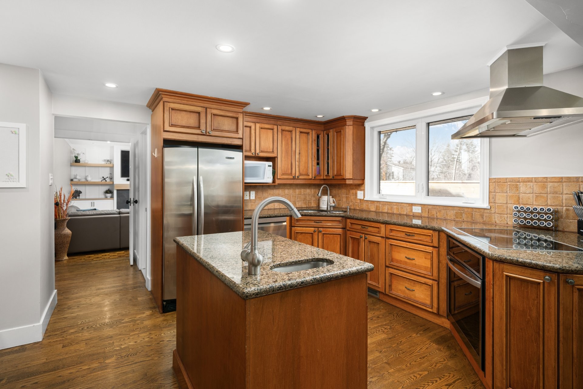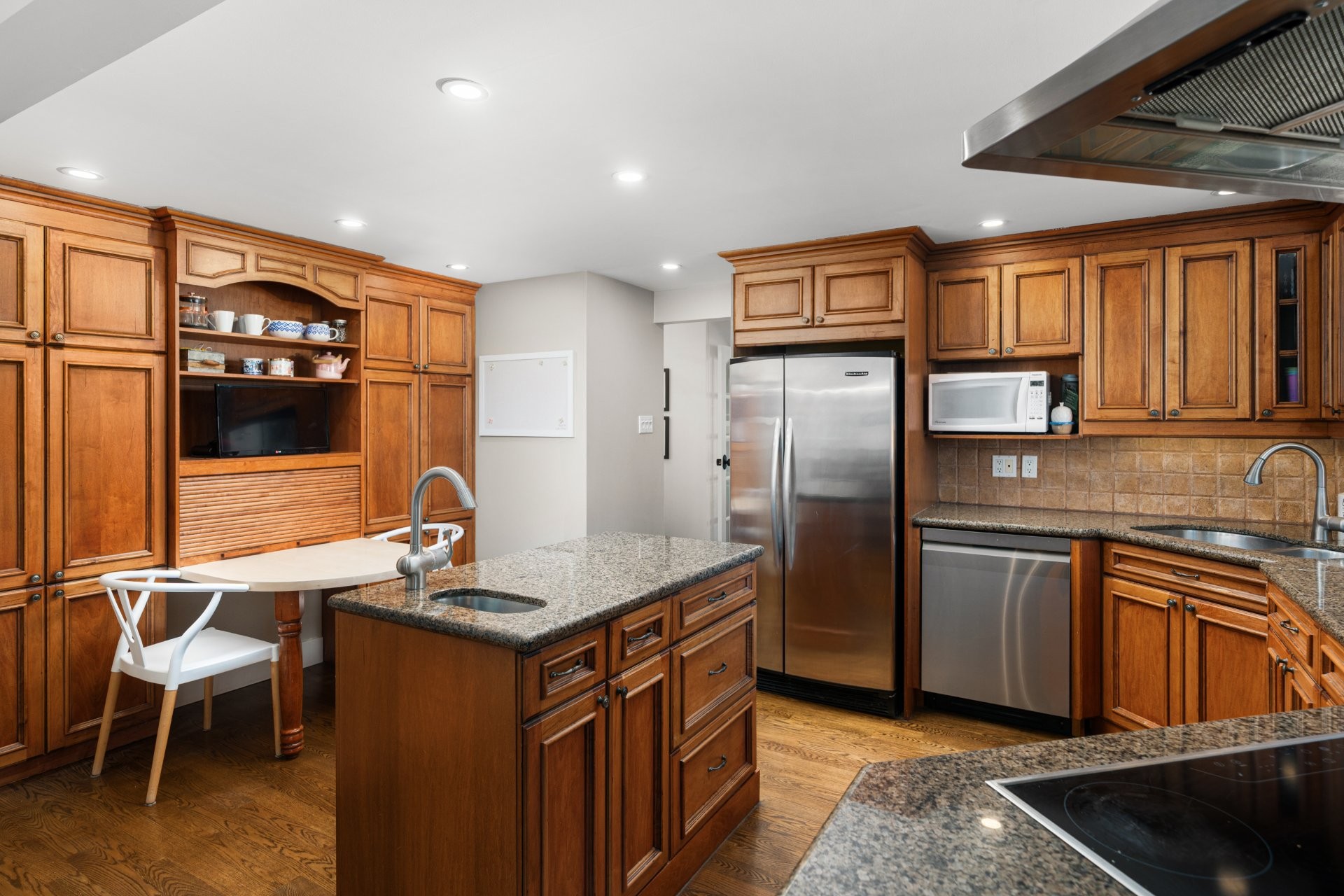The kitchen is a testament to quality craftsmanship, featuring solid wood cabinetry, durable granite countertops, and a functional center island with a second prep sink. While maintaining a classic feel, it is impeccably well-maintained and provides a spacious hub for daily life.