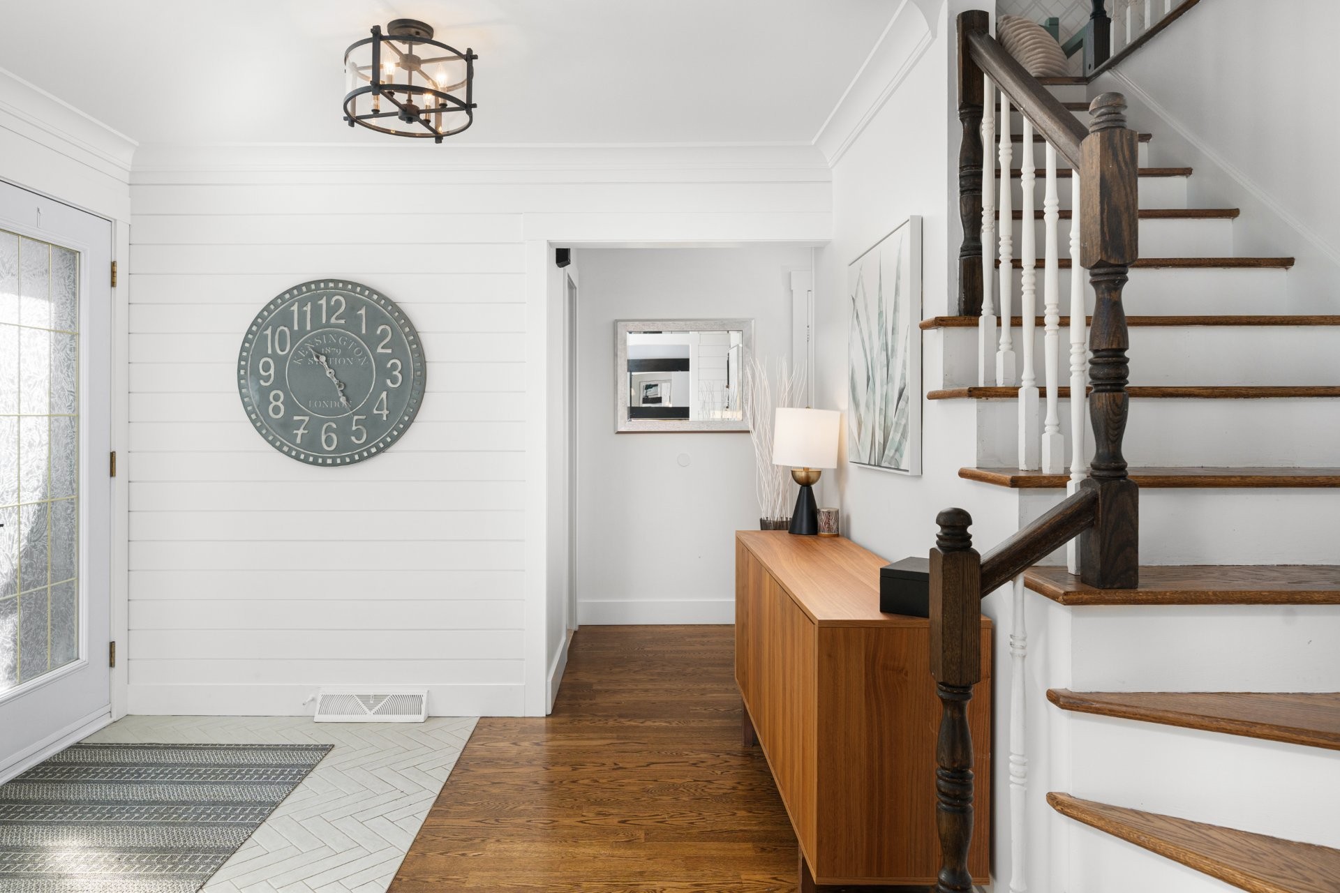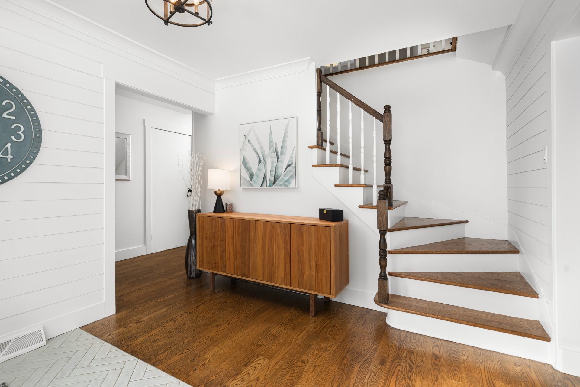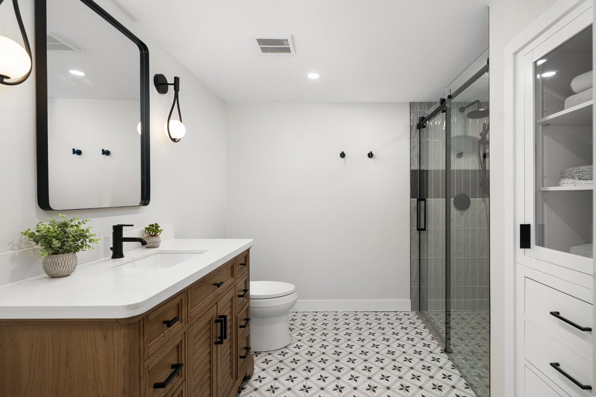 The fully renovated basement adds valuable living space, including a large playroom, a fifth bedroom or home office equipped with a convenient Murphy bed, and a stylish full bathroom with heated floors.