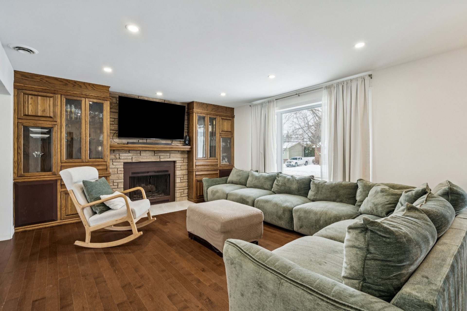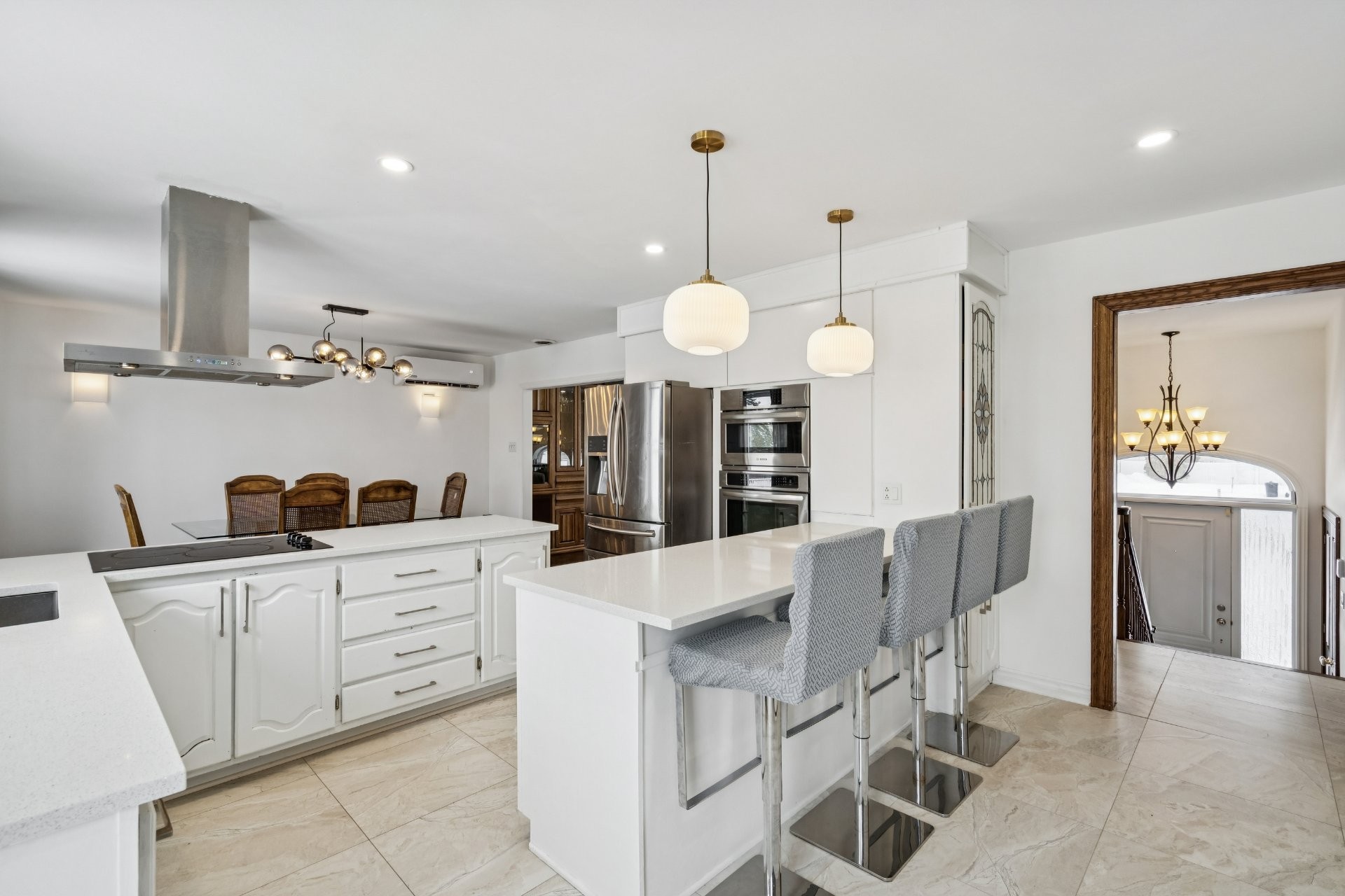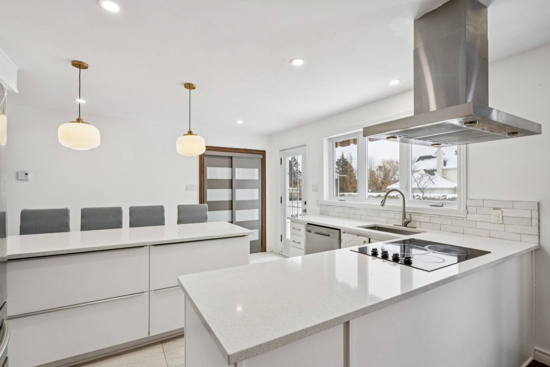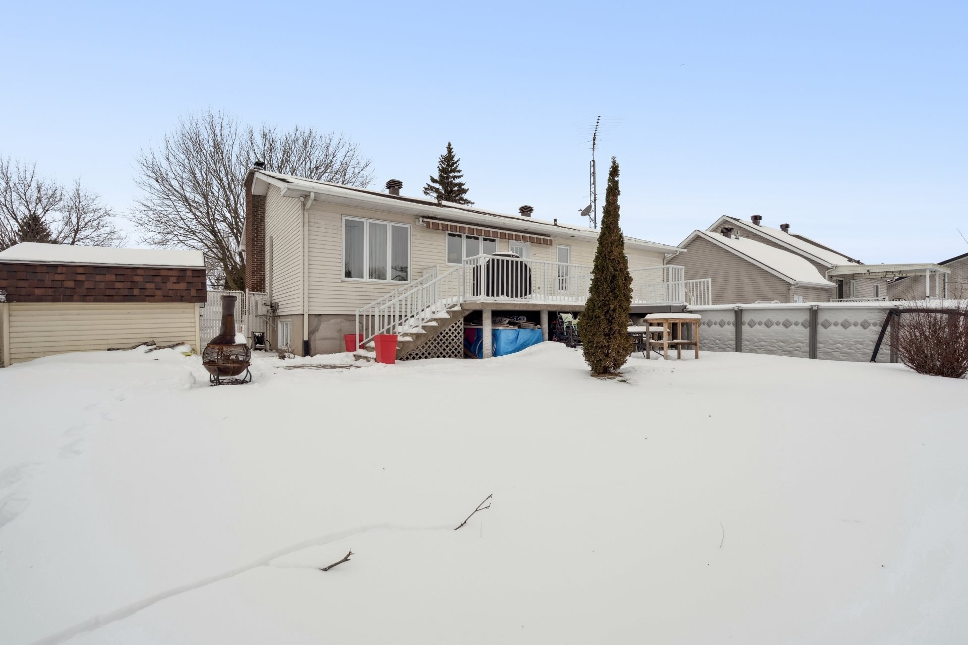 Dishwasher, built-in oven and microwave, induction cooktop, both heat pumps, IKEA storage unit in the basement bedroom, above-ground pool and pool heater (both functional, sold without warranty; the pool liner requires replacement), as well as the blinds in the primary bedroom and the main-floor bathroom.