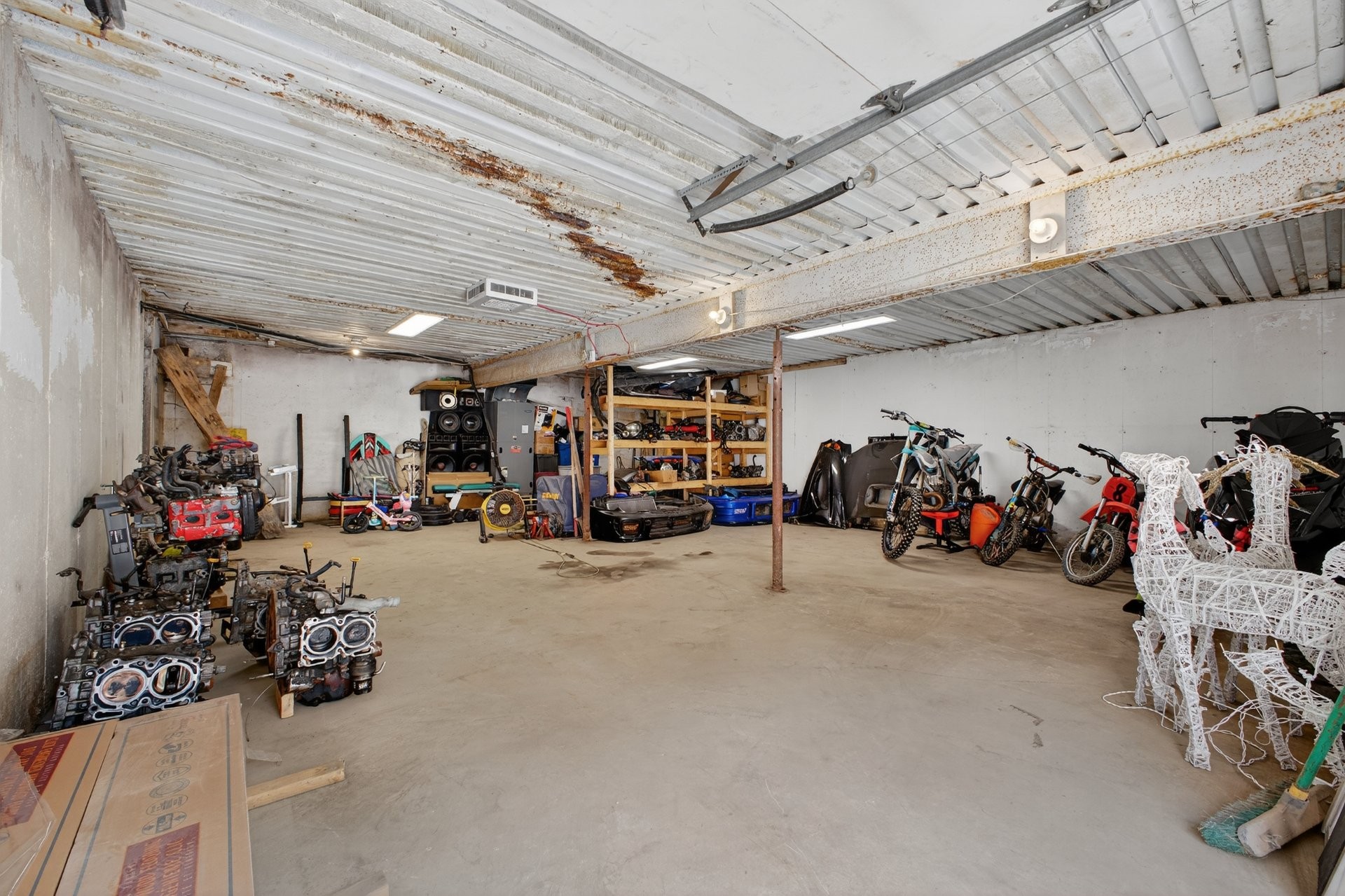 Window covering in kids room, fridge and chest freezer in basement, mirror above bar cart, outdoor furniture, Washer & dryer. Pellet stove in detached garage.