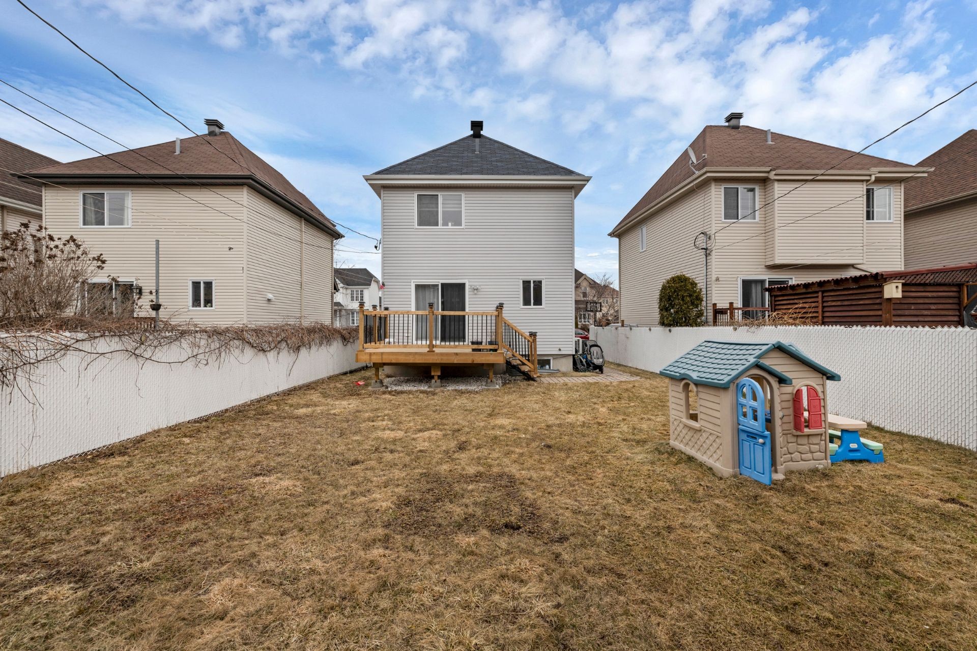 Spacious two-storey detached house in Vaudreuil-Dorion. Bright and welcoming, with hardwood floors throughout, central vacuum system, wall-mounted heat pump. Main level features a living room and dining room sharing a decorative accent wall. The dining room has a patio door to the fully fenced backyard. Main level also includes a powder room. A side entrance provides access to the backyard, which includes a shed and new patio. Second floor has two bedrooms and large bathroom with separate shower. Finished basement includes family room and laundry. Located in a sought-after neighborhood, the house offers comfort and practicality.