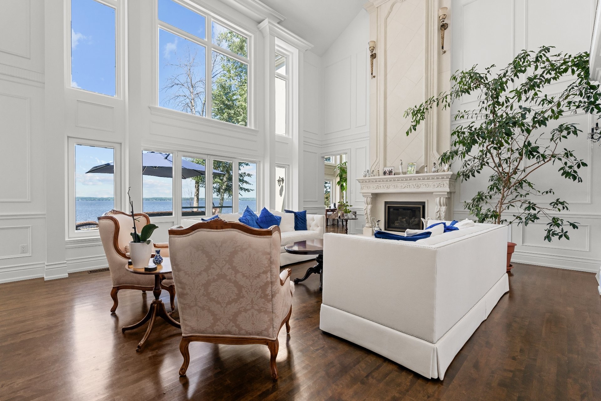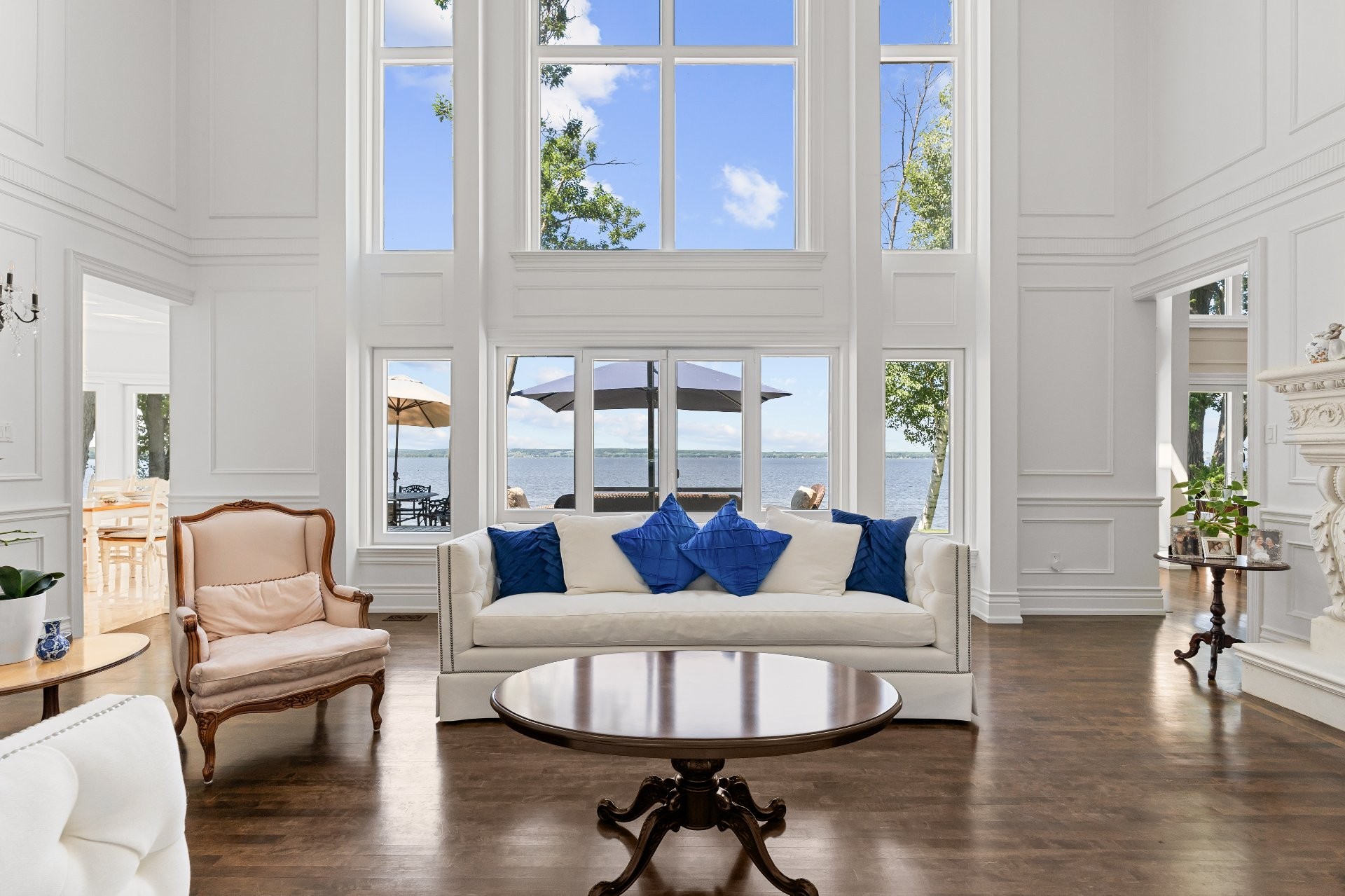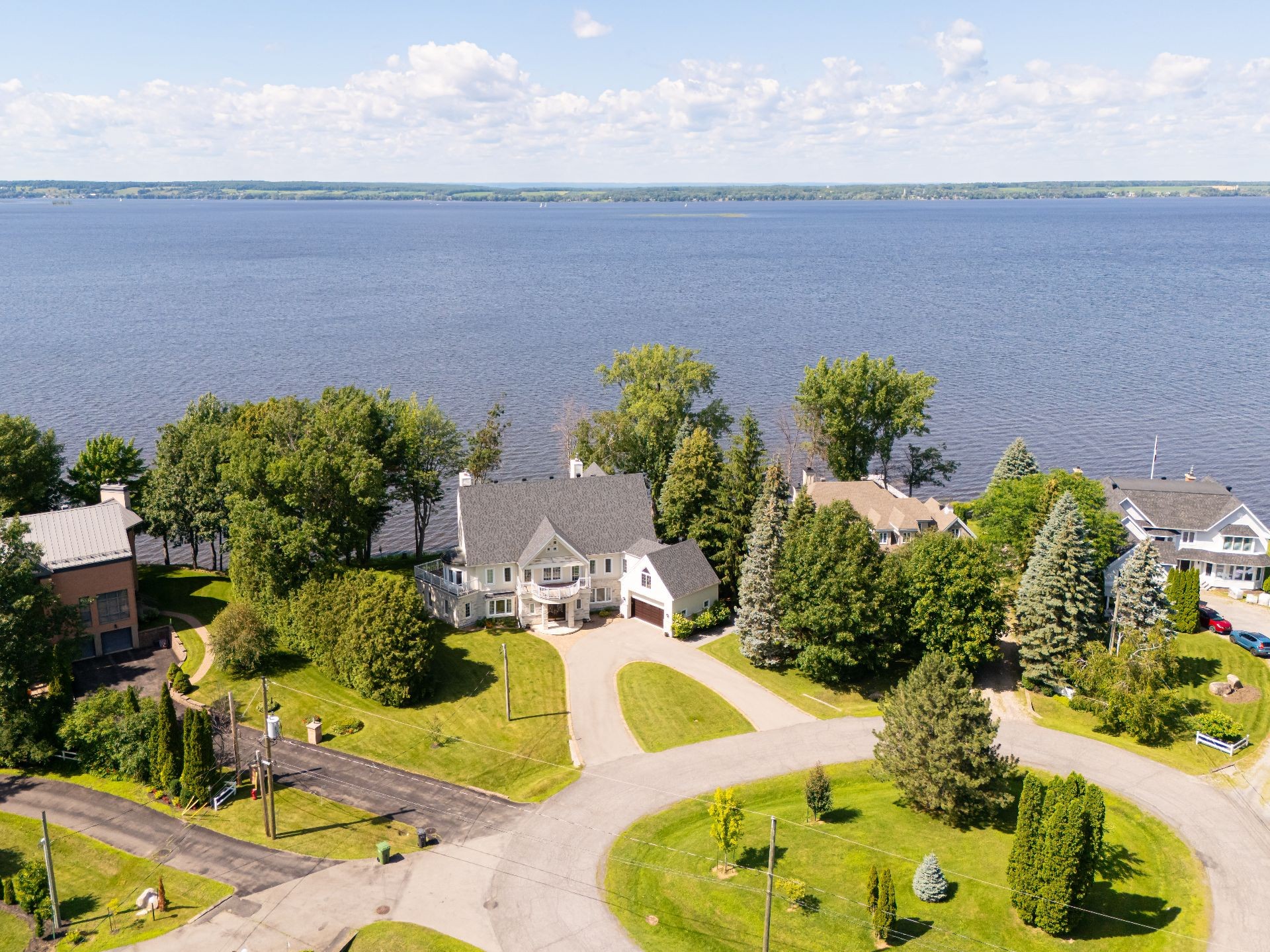 This private cul-de-sac waterfront estate offers 5,000+ sq. ft. of luxury living with balconies throughout and water views from nearly every room. The grand main living area boasts soaring 20+ ft ceilings, complemented by 3 family rooms, a stunning chef's kitchen, and hand-crafted finishings executed with precision. Relax in the finished basement or savor breathtaking sunsets from your private dock or from your primary bedroom! Take advantage of being a part of the exclusive Hudson Club amenities such as a private beach, gorgeous pool, and tennis courts. A rare chance to own elegant waterfront living at finest! You will not be disappointed!