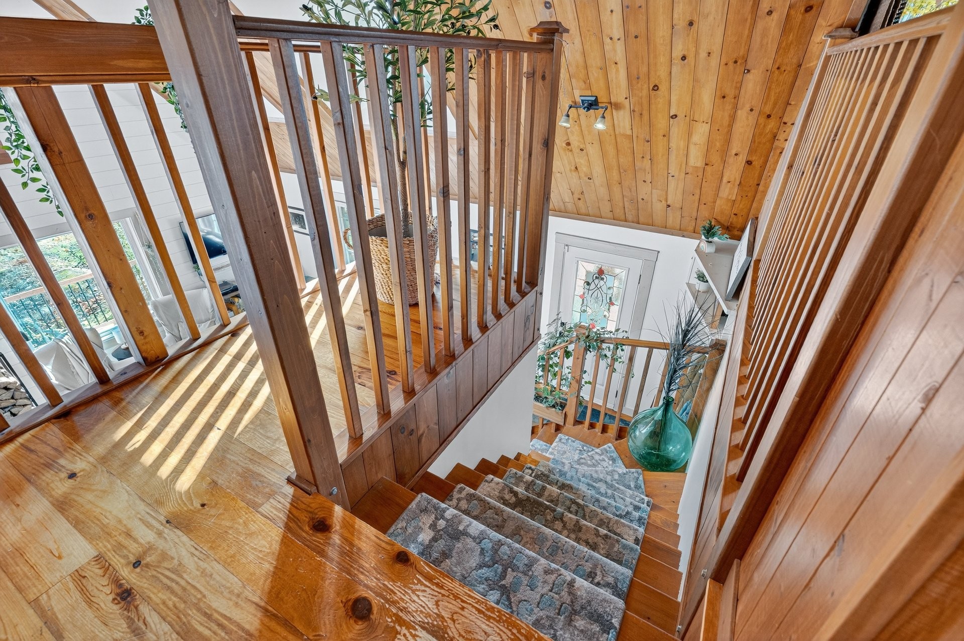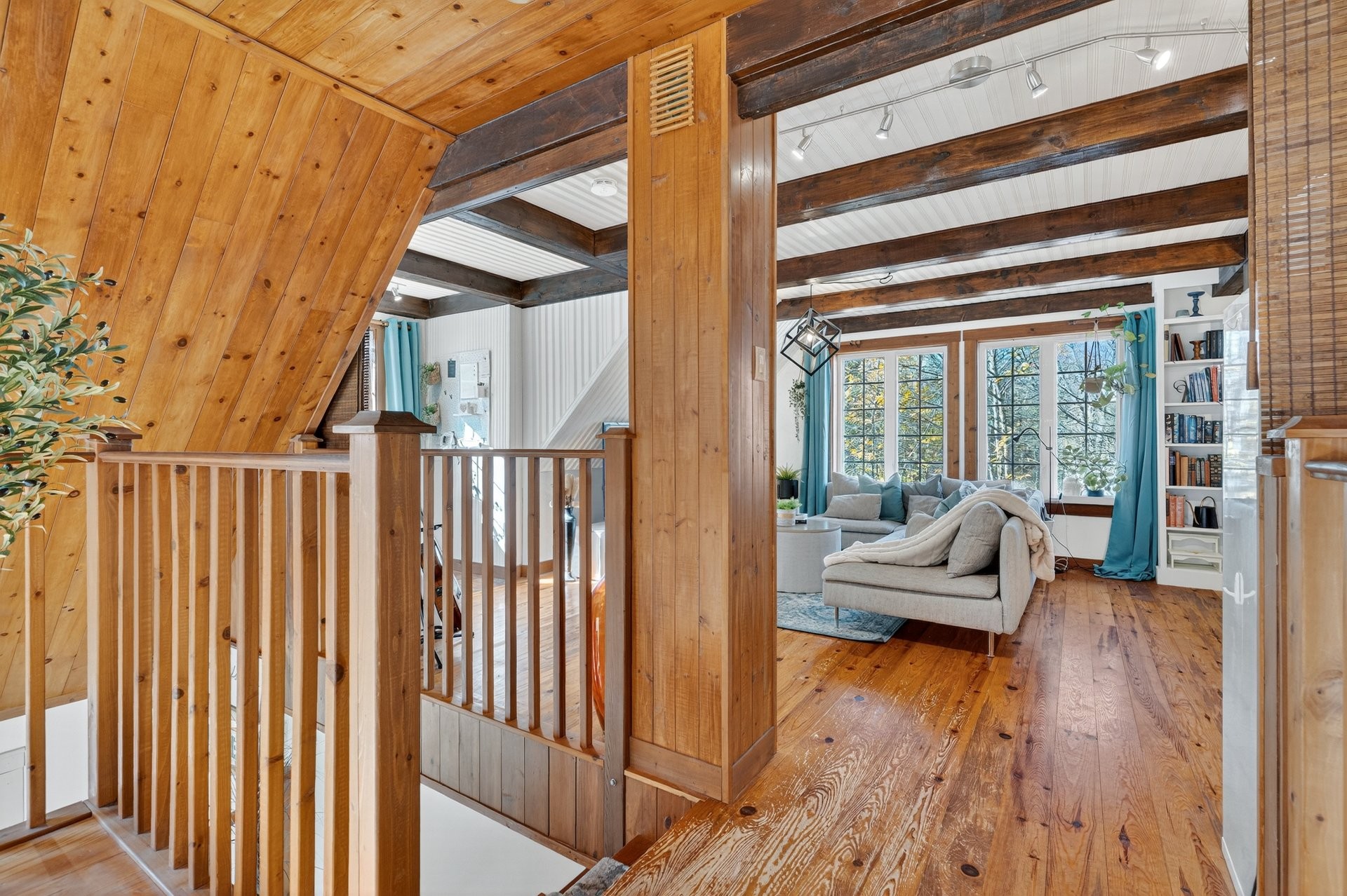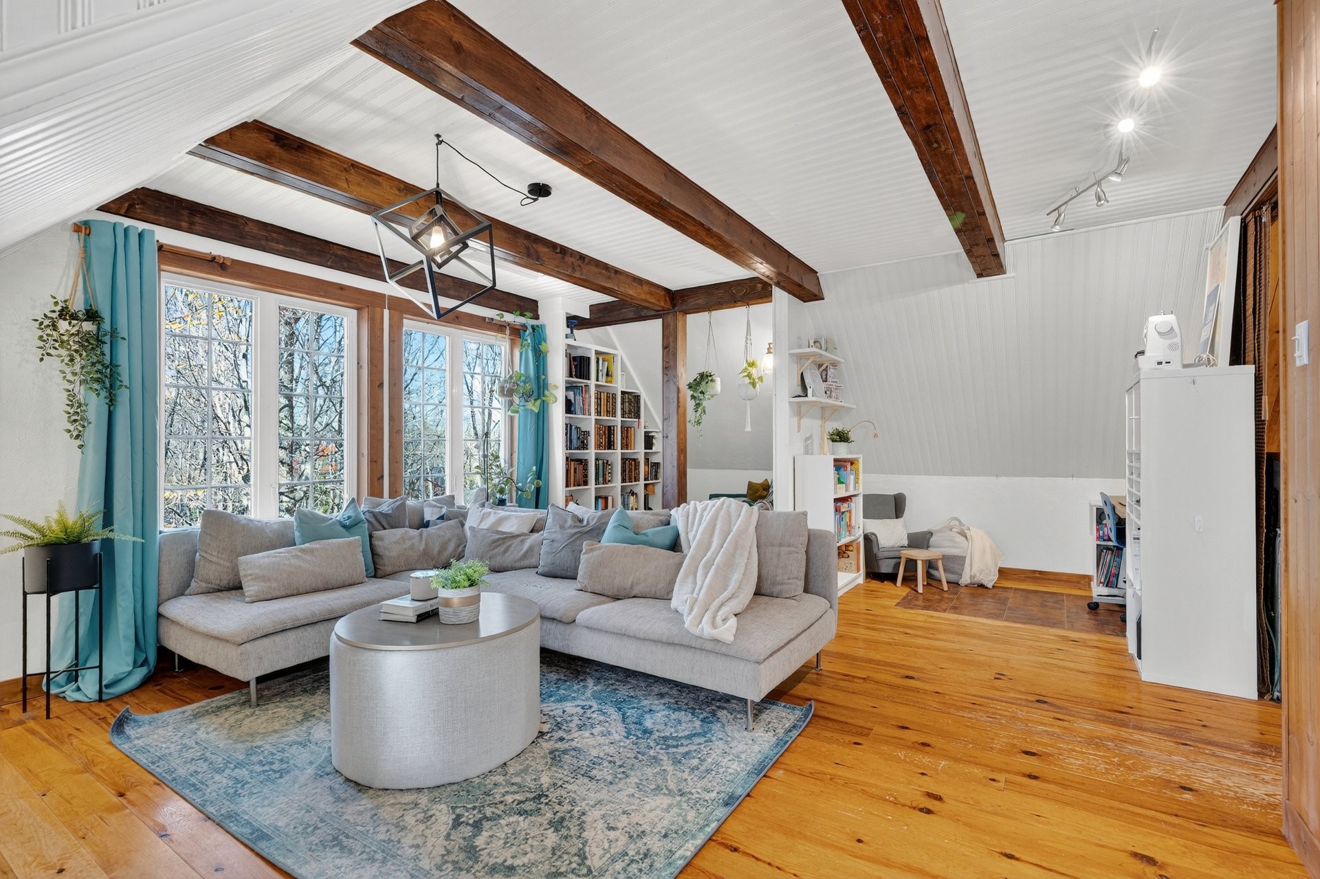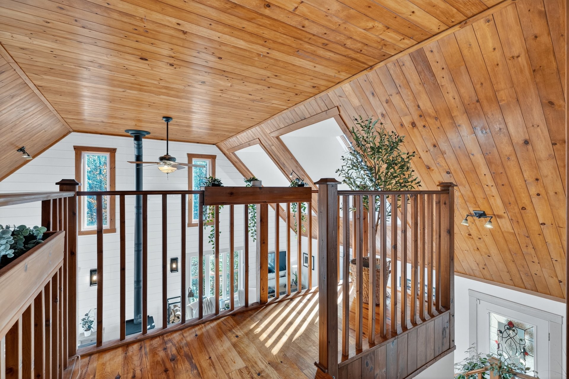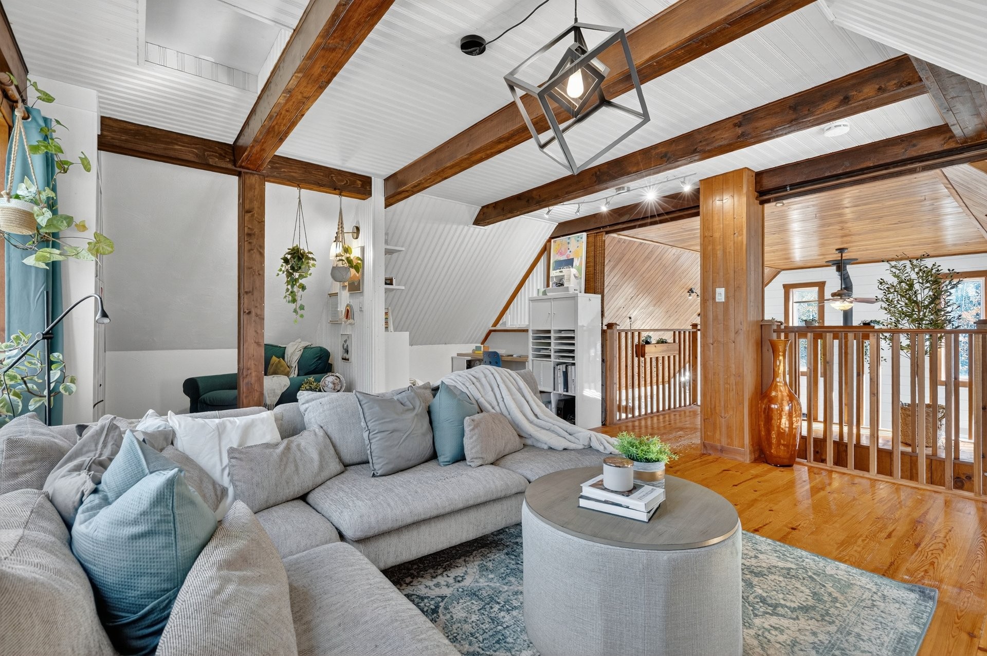 The home greets you with warmth and natural light, cathedral ceilings, exposed beams, and beautiful hardwood floors create an inviting atmosphere. The living areas flow seamlessly into one another, perfect for both family living and entertaining. Upstairs, three generous bedrooms include a private 24' x 14' mezzanine suite, ideal as a primary bedroom, guest retreat, or creative workspace. Two full bathrooms serve the home, one of which was completely renovated in 2023 with modern finishes.