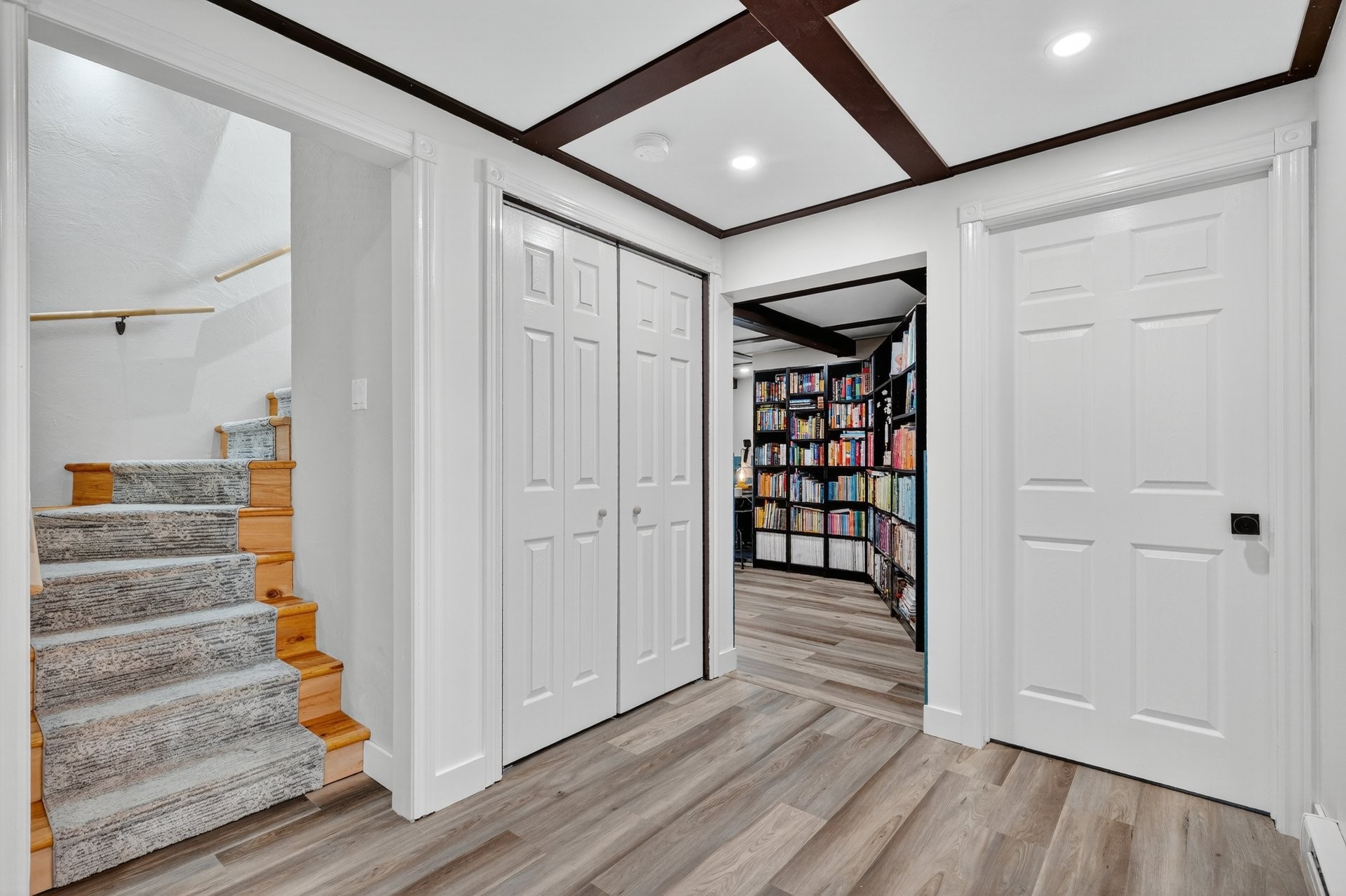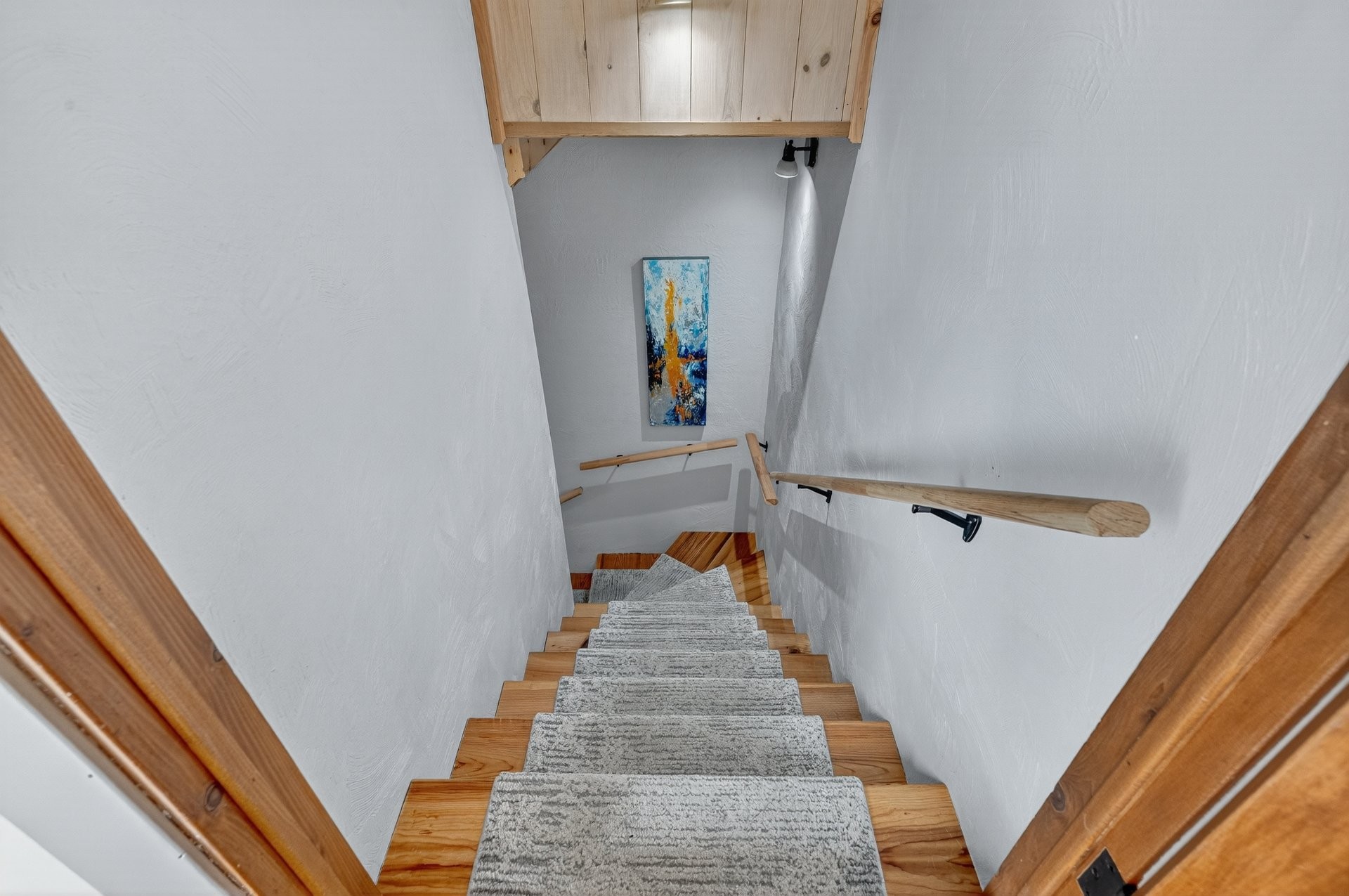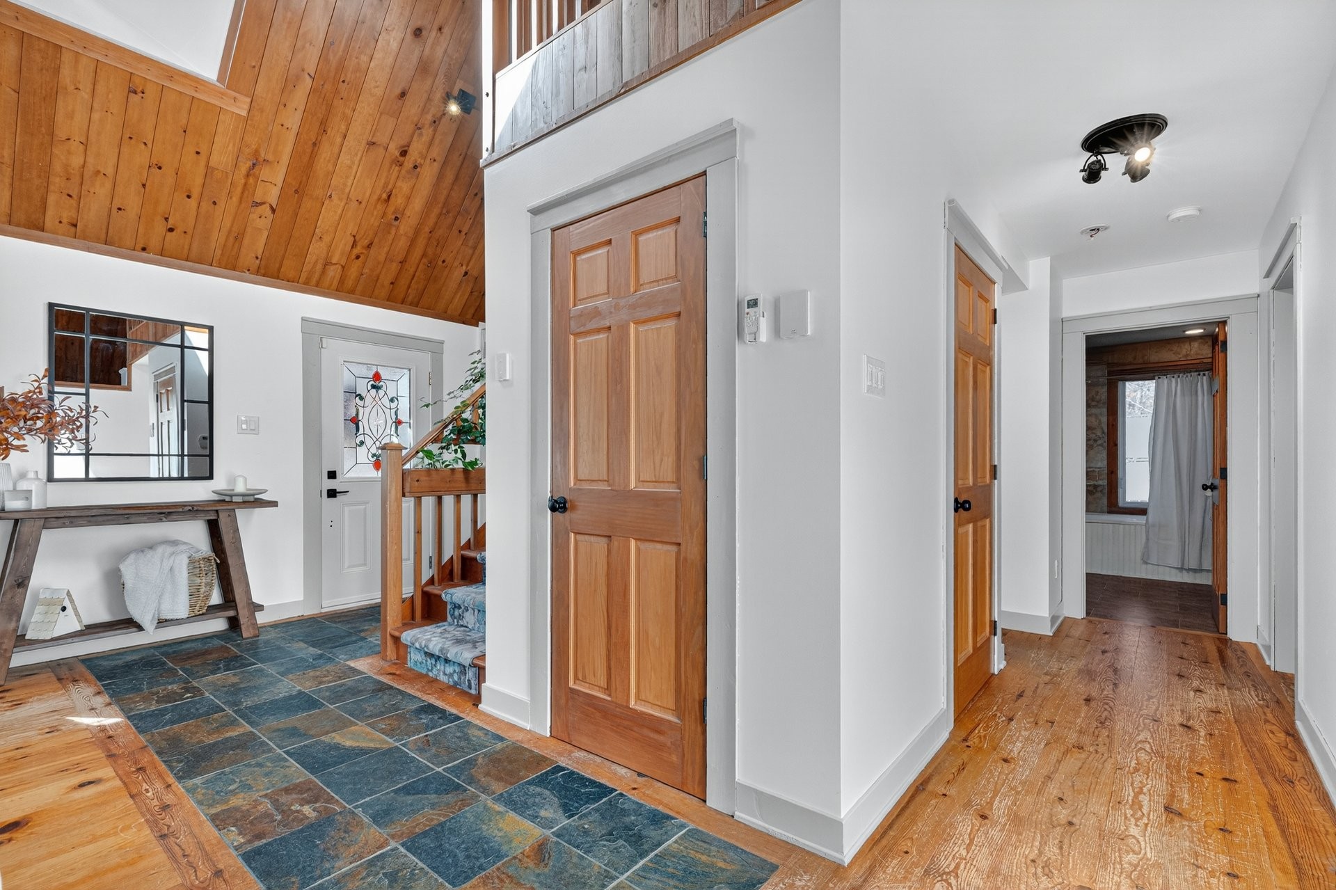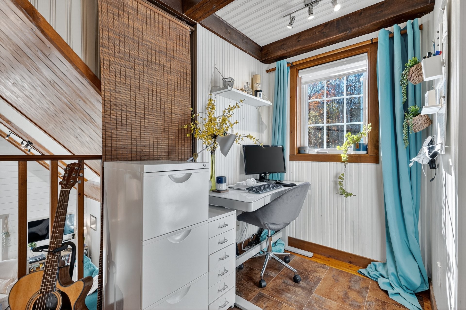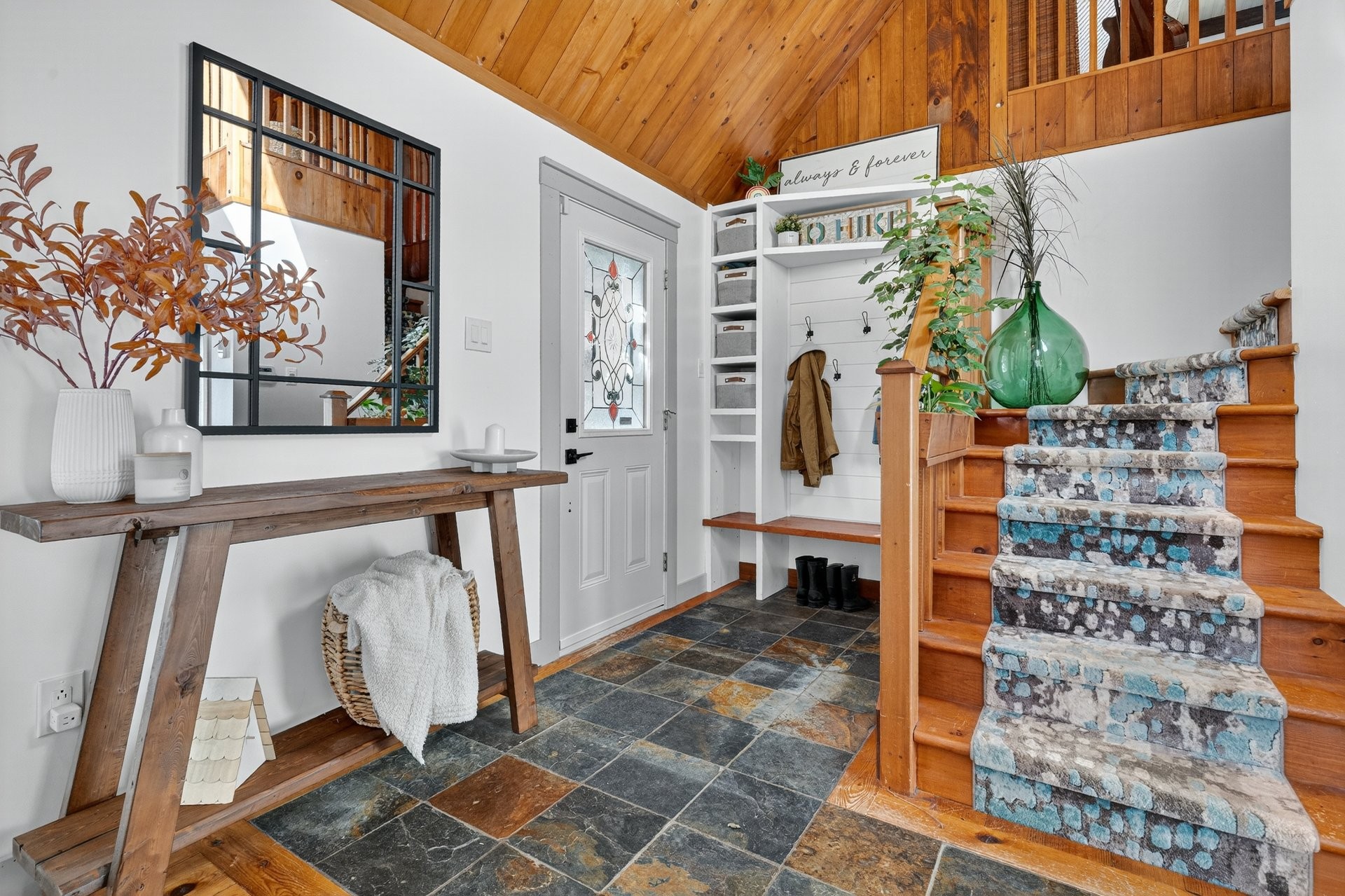 The home greets you with warmth and natural light, cathedral ceilings, exposed beams, and beautiful hardwood floors create an inviting atmosphere. The living areas flow seamlessly into one another, perfect for both family living and entertaining. Upstairs, three generous bedrooms include a private 24' x 14' mezzanine suite, ideal as a primary bedroom, guest retreat, or creative workspace. Two full bathrooms serve the home, one of which was completely renovated in 2023 with modern finishes.