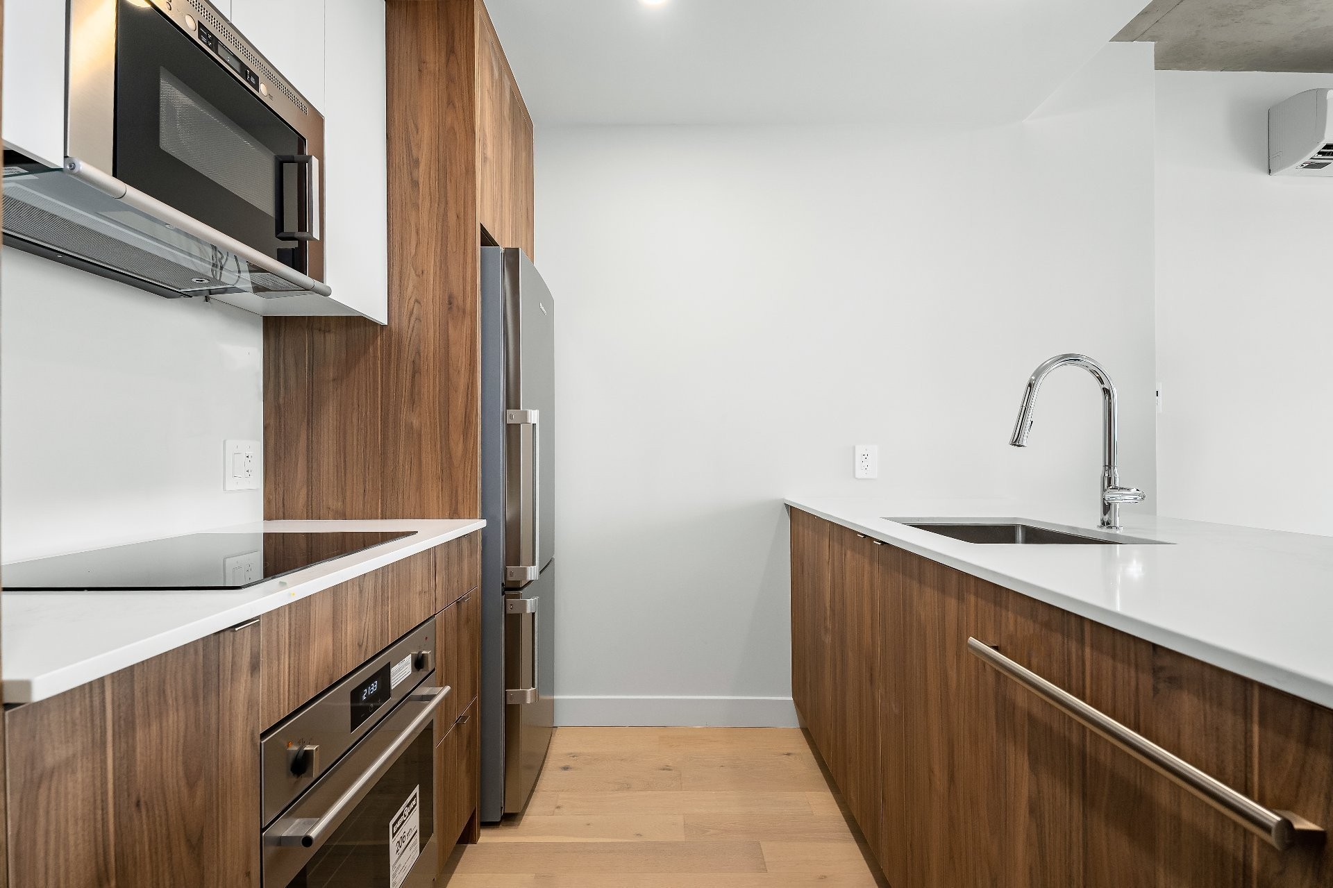 The unit features large windows that fill the space with natural light, a modern kitchen with high-end appliances and quartz countertops, a sleek bathroom, and a spacious bedroom with a walk-in closet. Additional amenities include a wall-mounted AC, a private balcony, an indoor parking space, and a storage locker for your belongings.