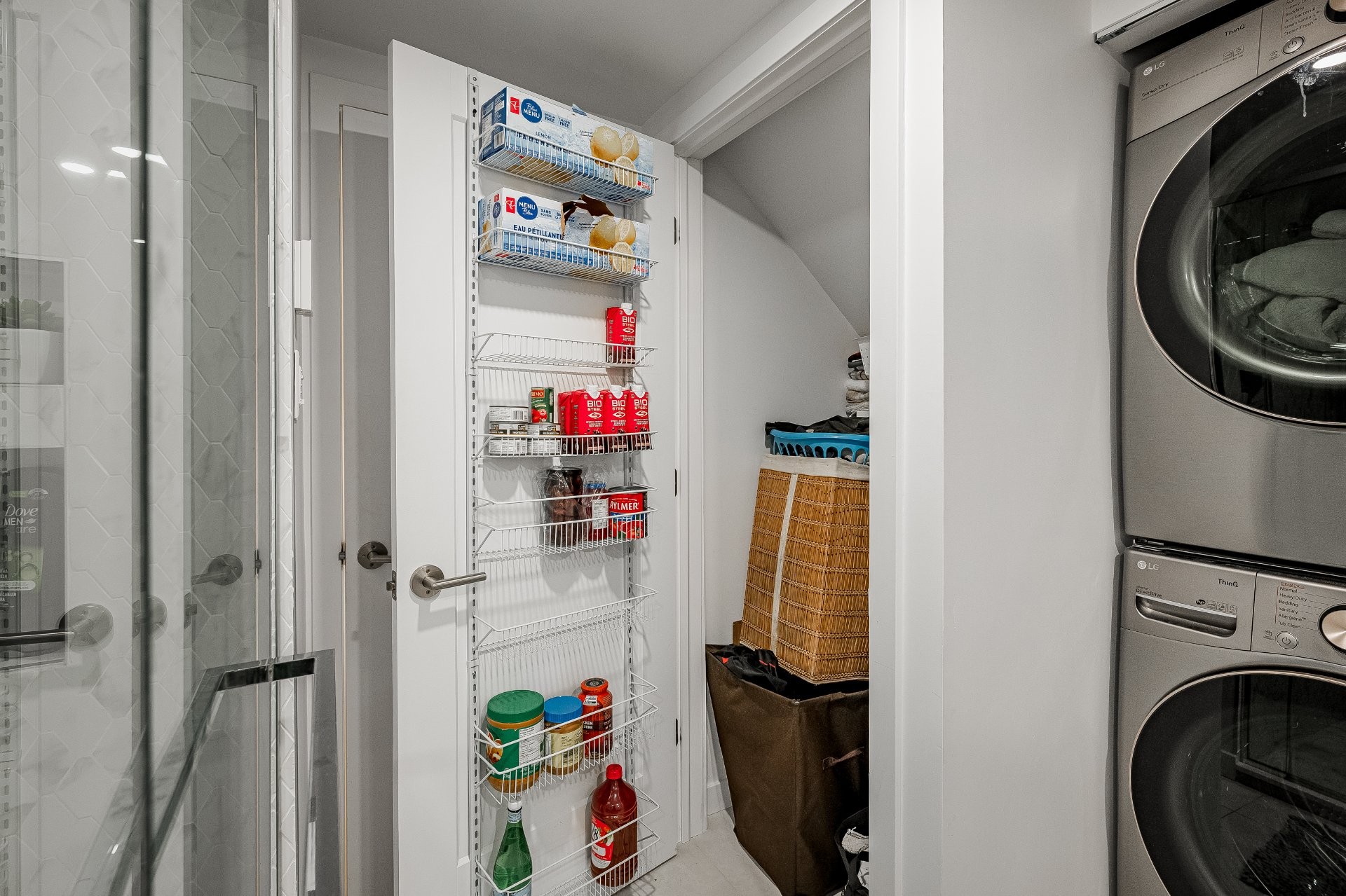 Refrigerator, stove, hood vent, dishwasher, washing machine, dryer, heat pump, light fixtures, blinds, and pantry shelves.