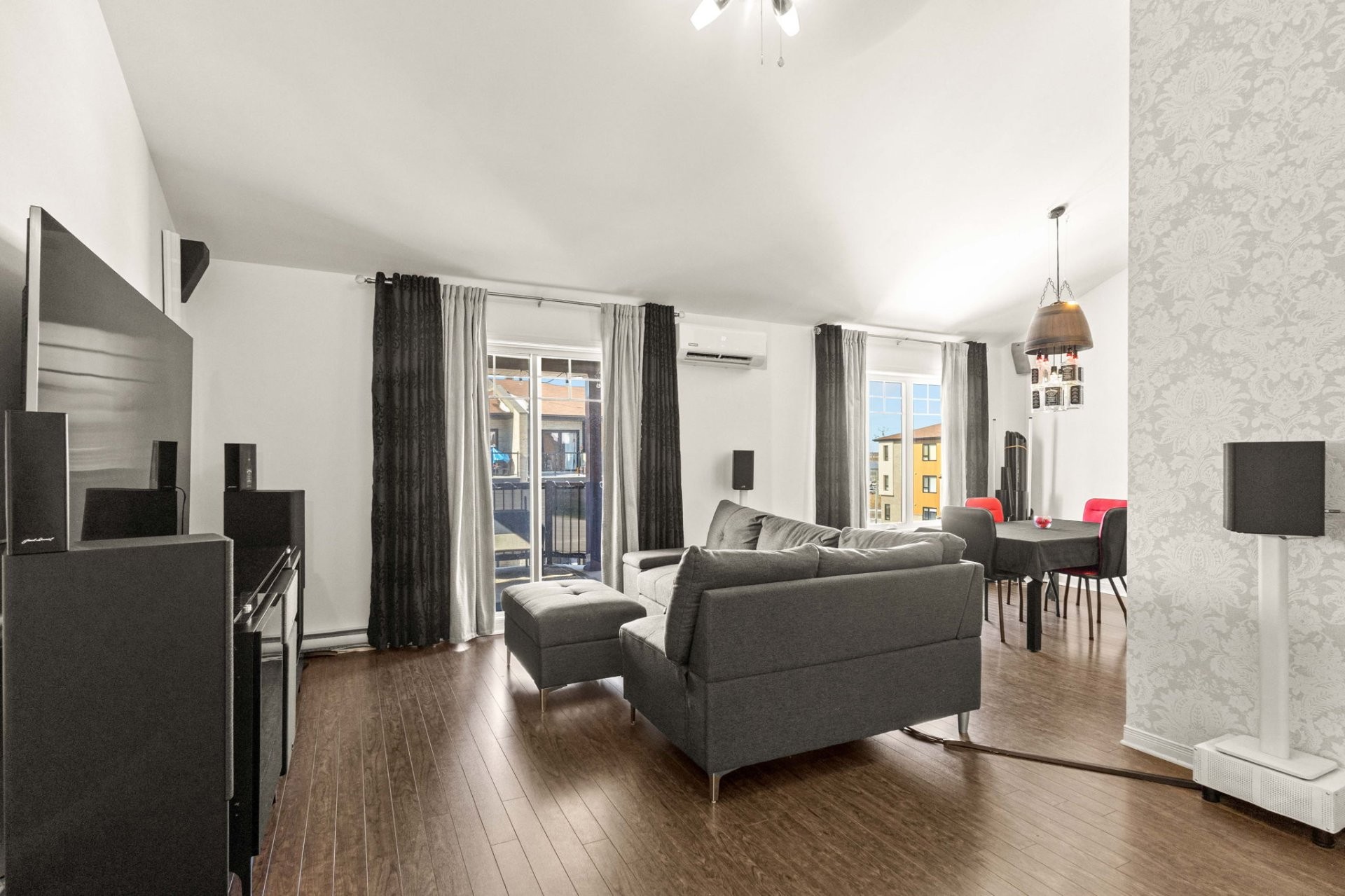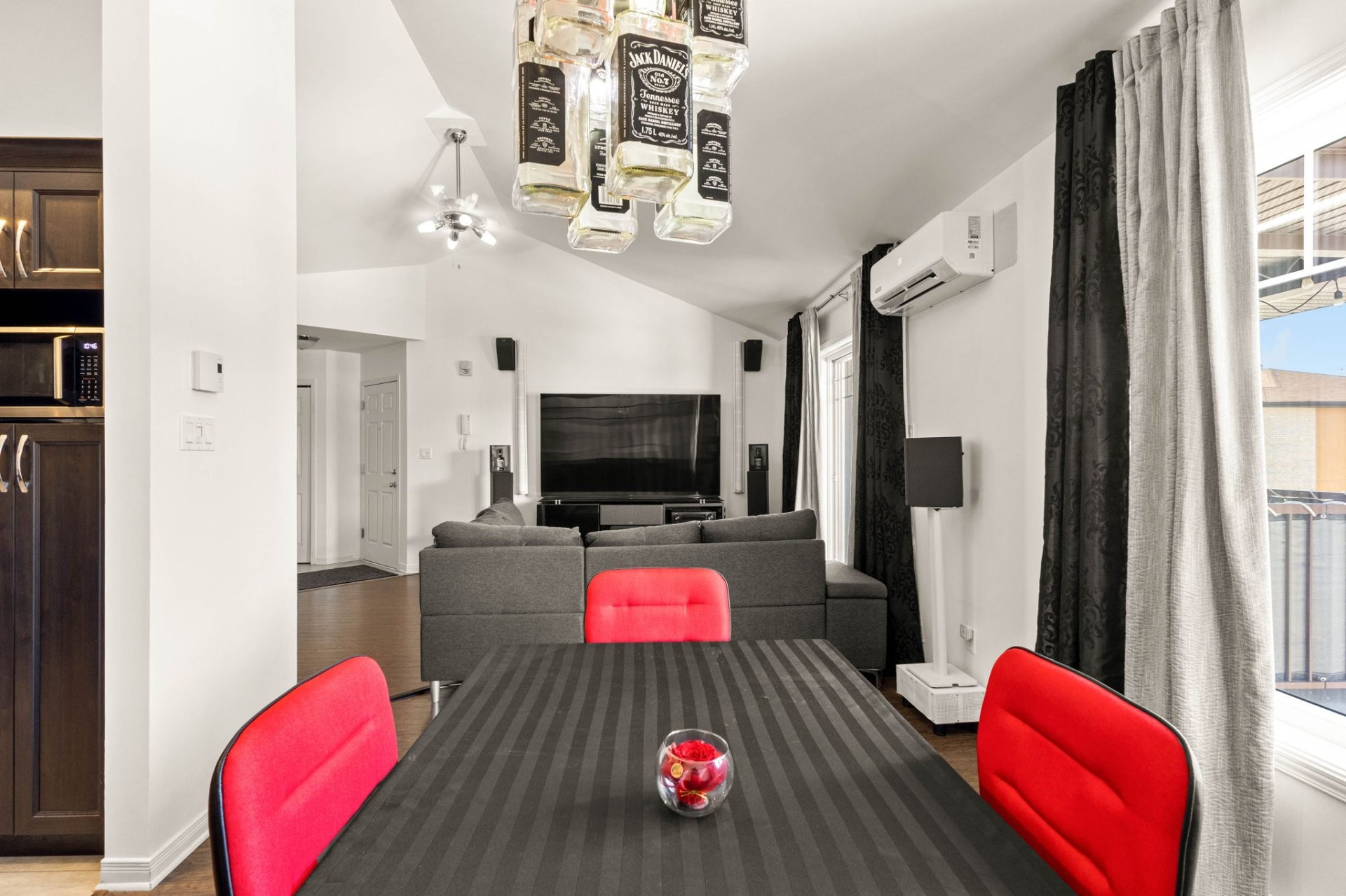 As soon as you enter, you'll be greeted by a welcoming living area bathed in natural light, enhanced by elegant cathedral ceilings that extend across the living room, dining room, and kitchen. The space features a harmonious open-concept layout, creating a warm and airy atmosphere that is perfect for both daily living and entertaining.