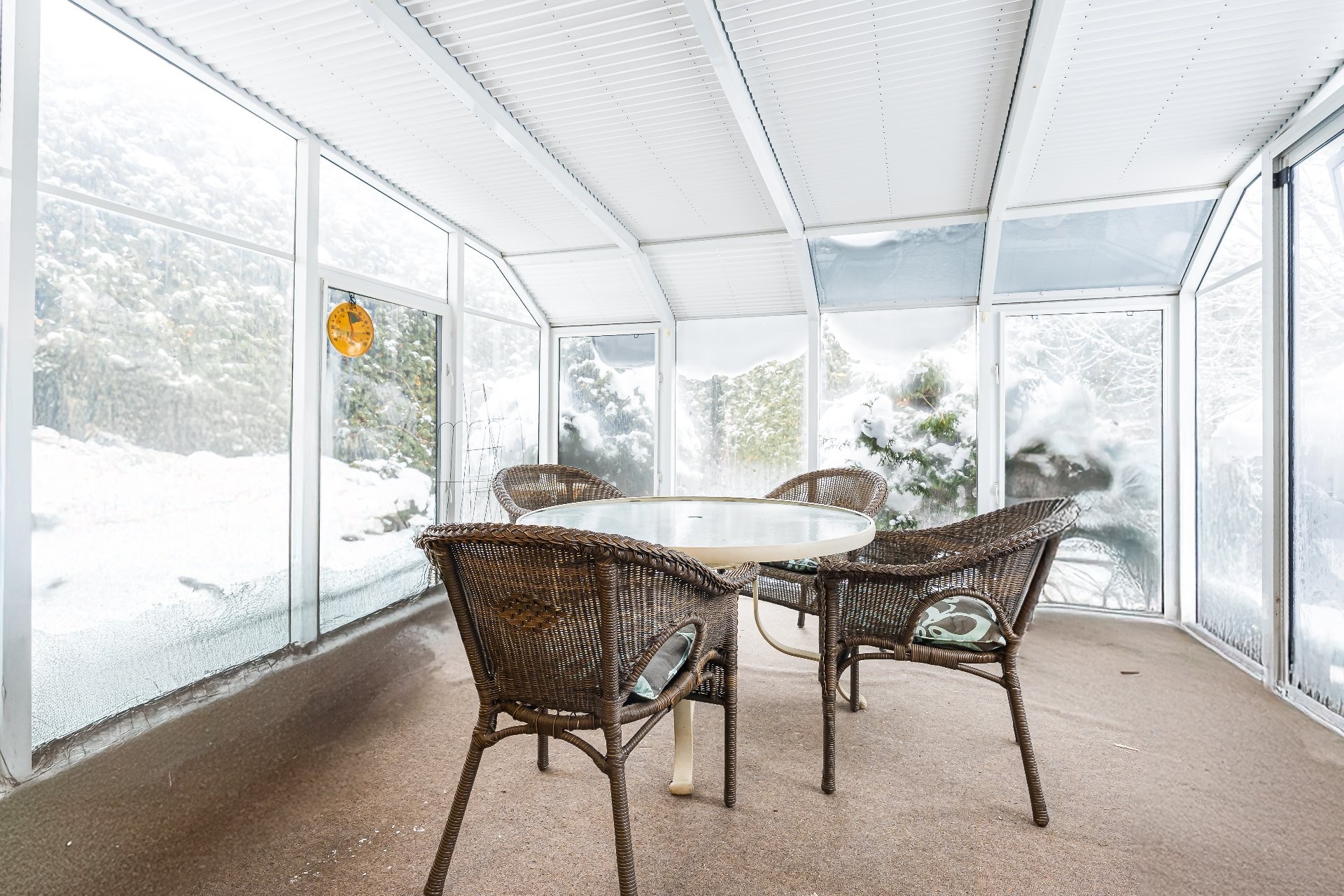 Outside, unwind in your beautifully landscaped garden, framed by a cedar hedge and mature trees, providing exceptional privacy in a peaceful, quiet setting. A wall-mounted air conditioning system efficiently cools the entire home, ensuring year-round comfort.
