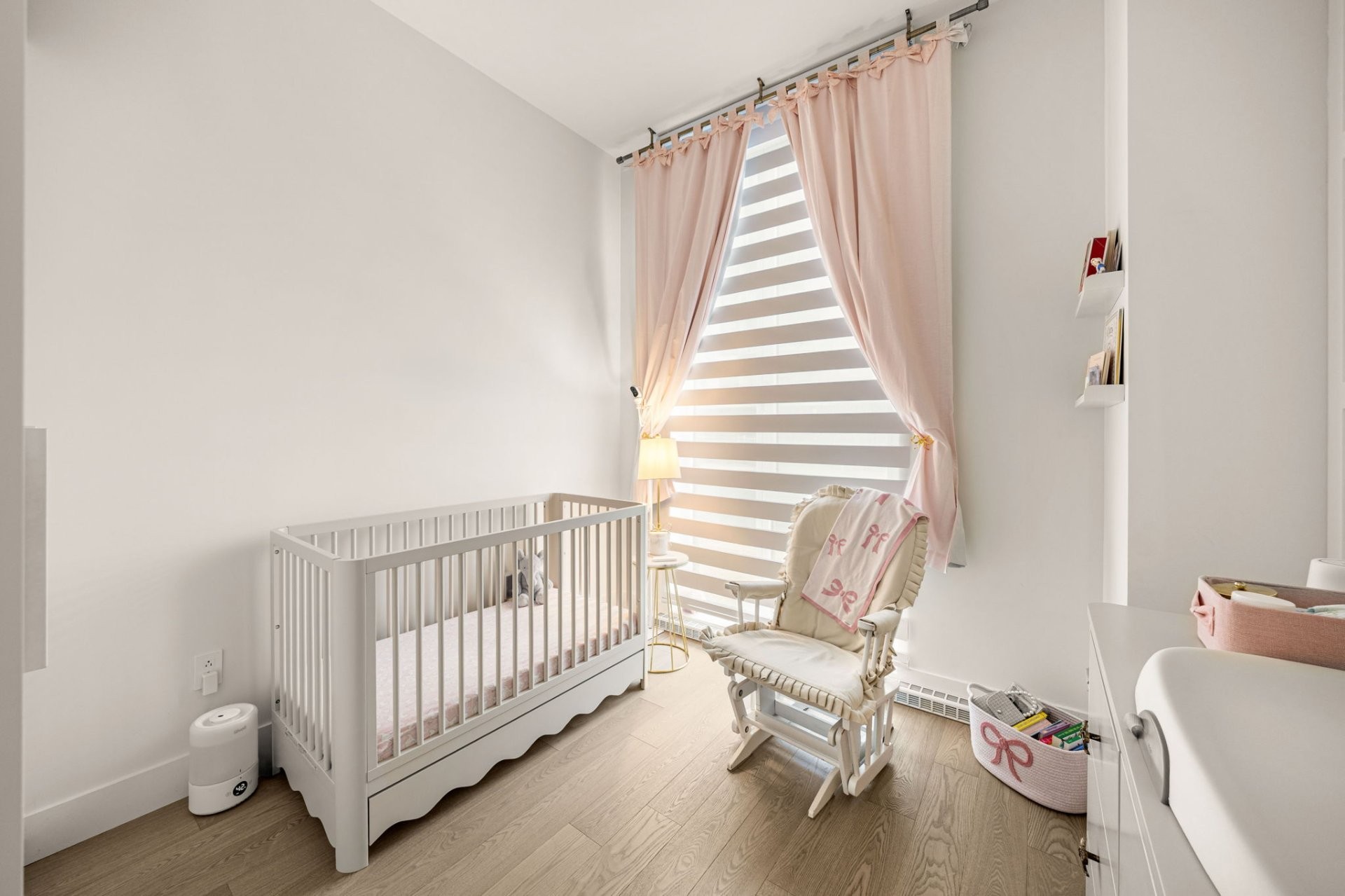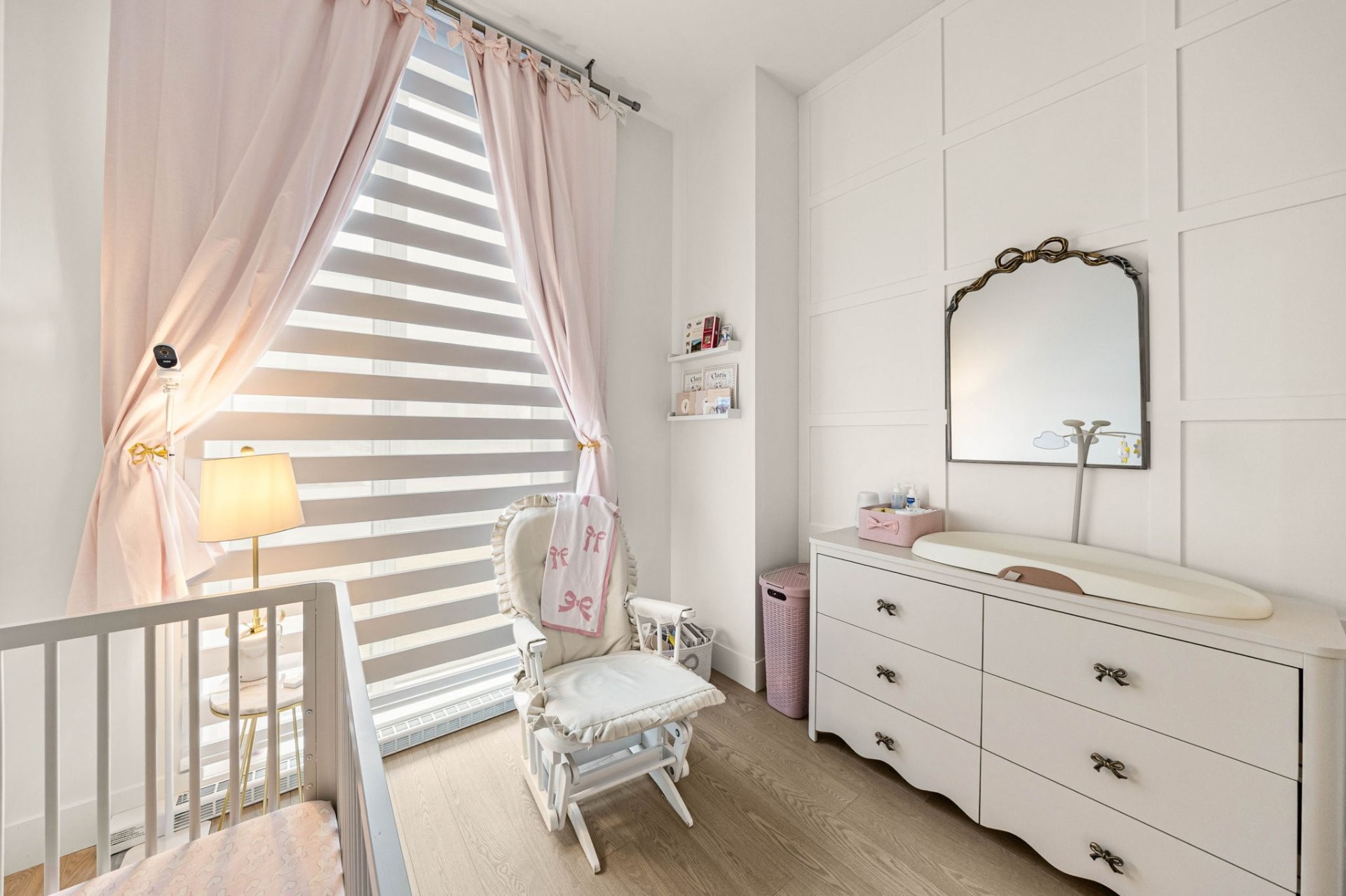 Pink curtains, washer, dryer, and TV bracket.