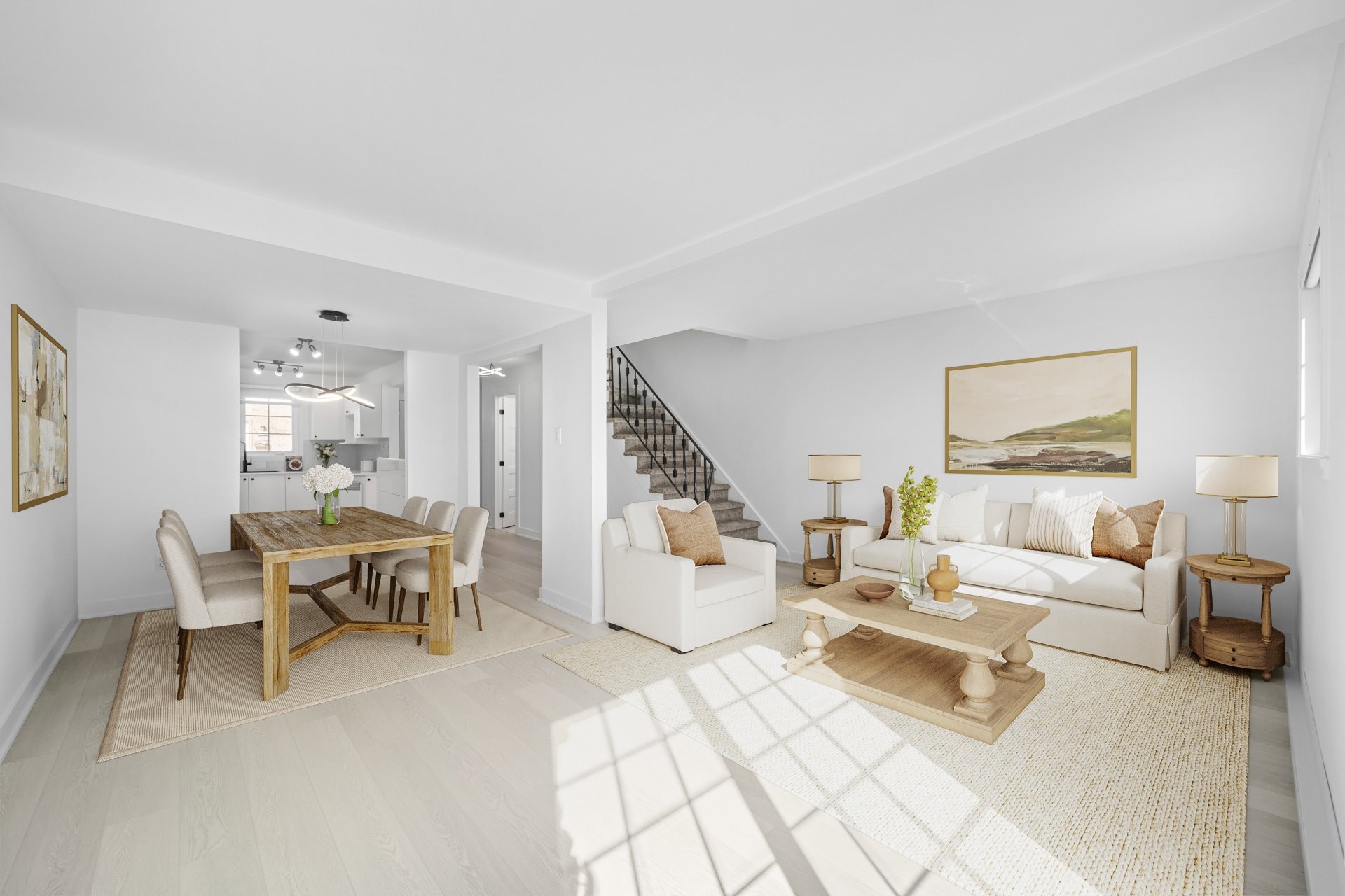 The main floor features an inviting open-concept layout with a spacious living and dining area, perfect for entertaining. The redesigned kitchen boasts sleek quartz countertops and ample storage, while large windows bring in plenty of natural light. From the living space, step outside to your fully fenced, south-facing private backyard - ideal for relaxing or hosting friends and family. A stylish powder room is conveniently located near the entrance.