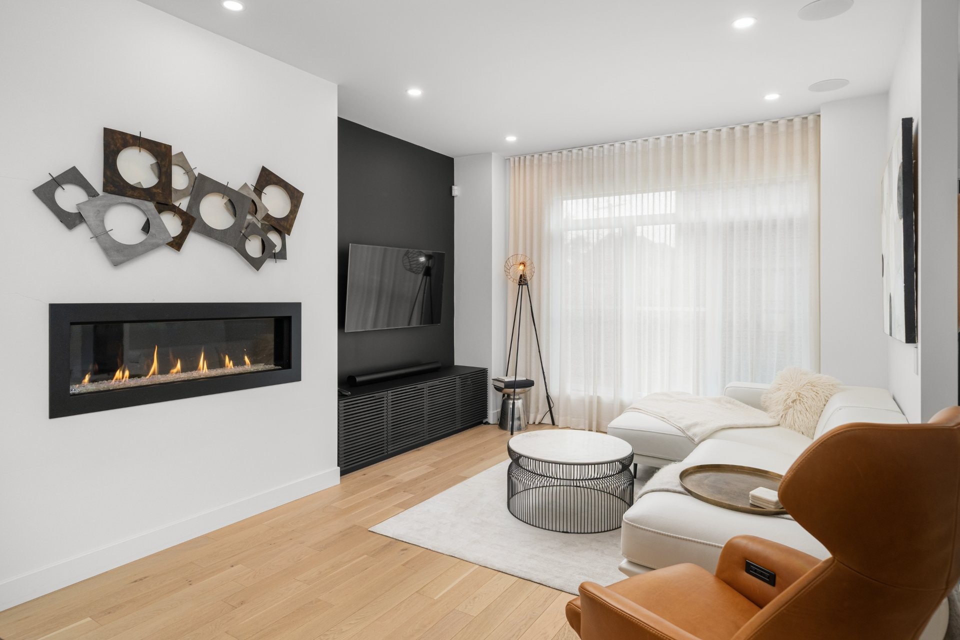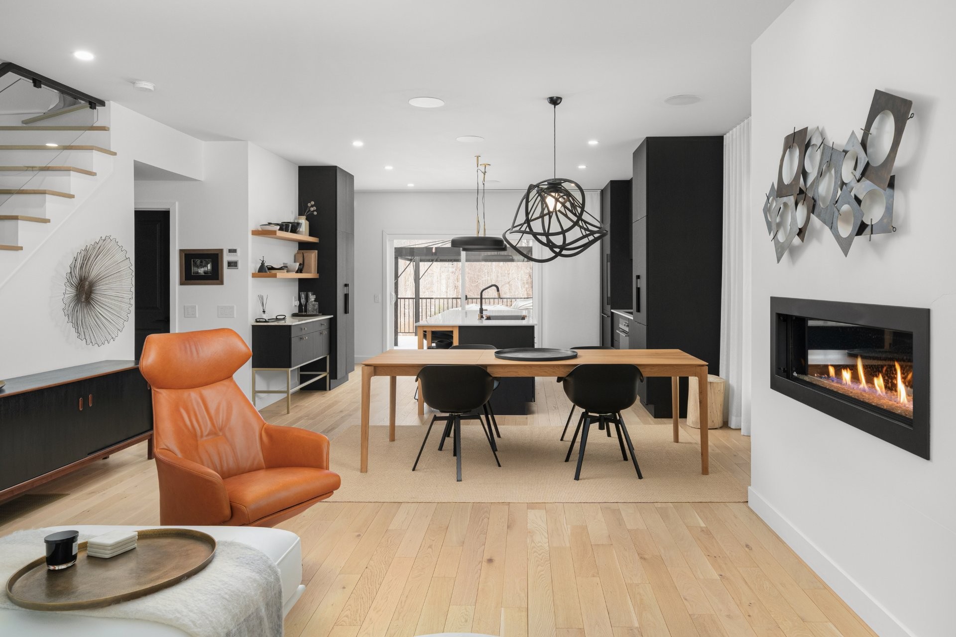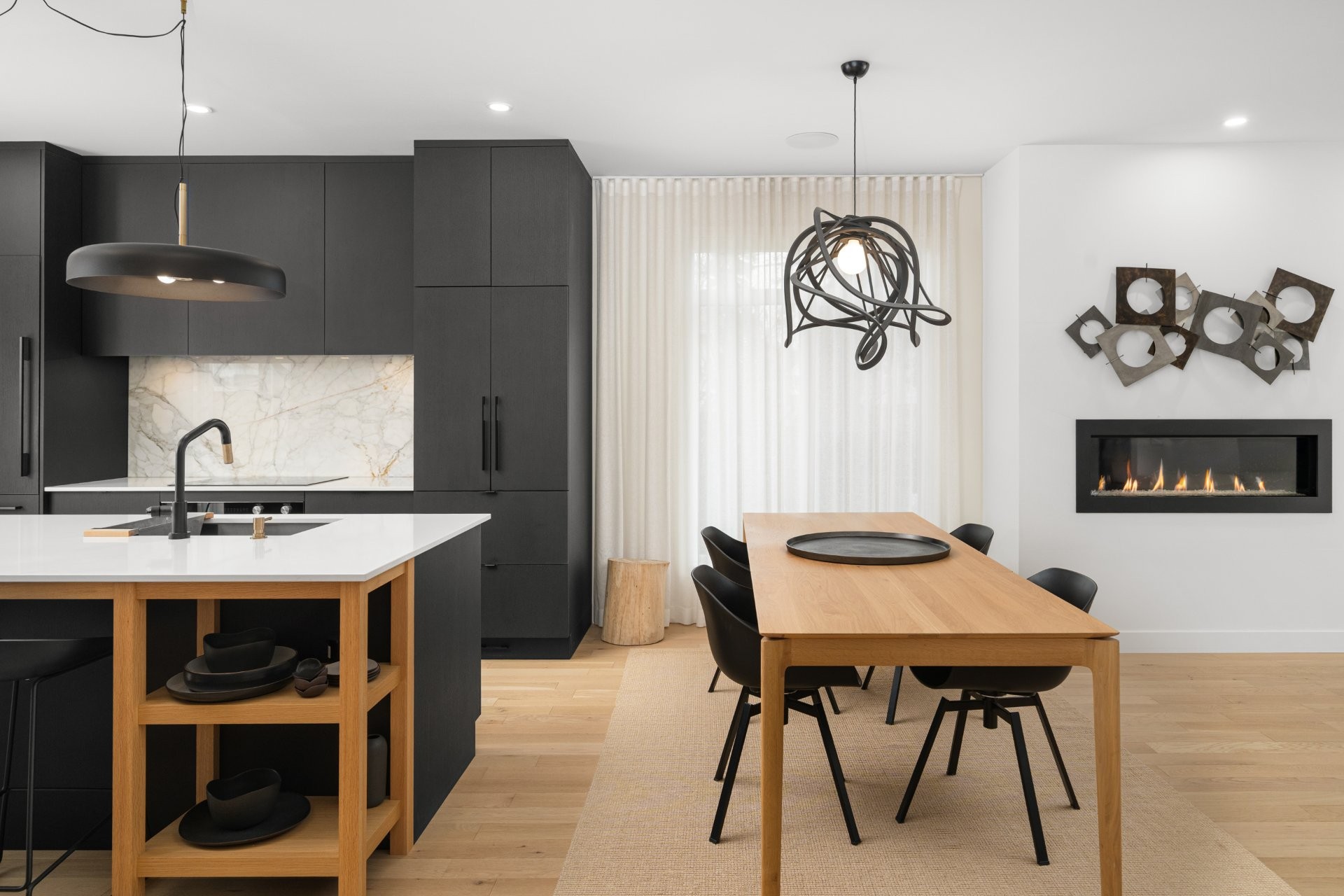 tep inside to a luxurious open-concept living space filled with natural light from expansive windows. The inviting living room features a modern Napoleon natural gas fireplace, while the spacious dining area is perfect for entertaining. The custom-designed contemporary wood kitchen is a true showstopper, complete with a marble backsplash, thoughtful organizational features, and high-end built-in Fisher & Paykel appliances. A Julien sink with accessories and a touch-technology faucet adds both style and functionality. A sleek powder room with a modern marble sink completes this level.