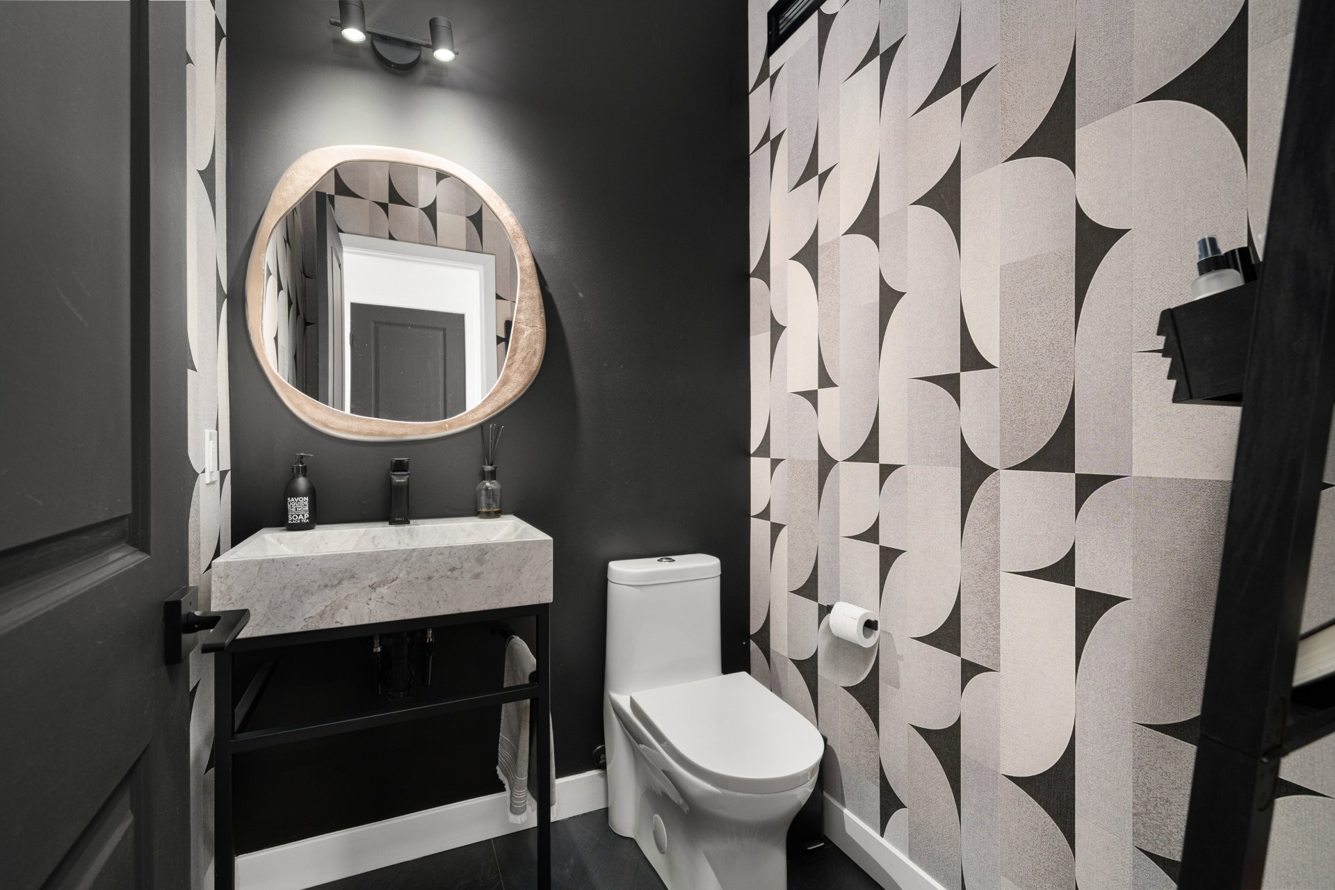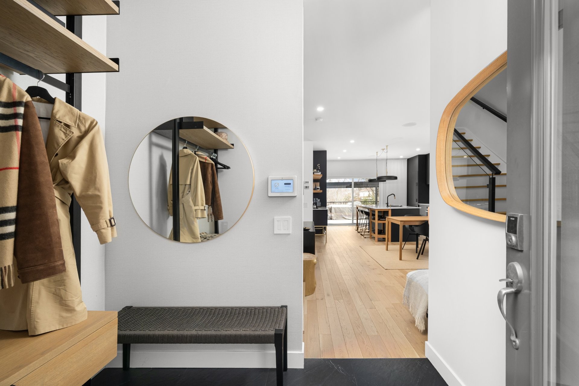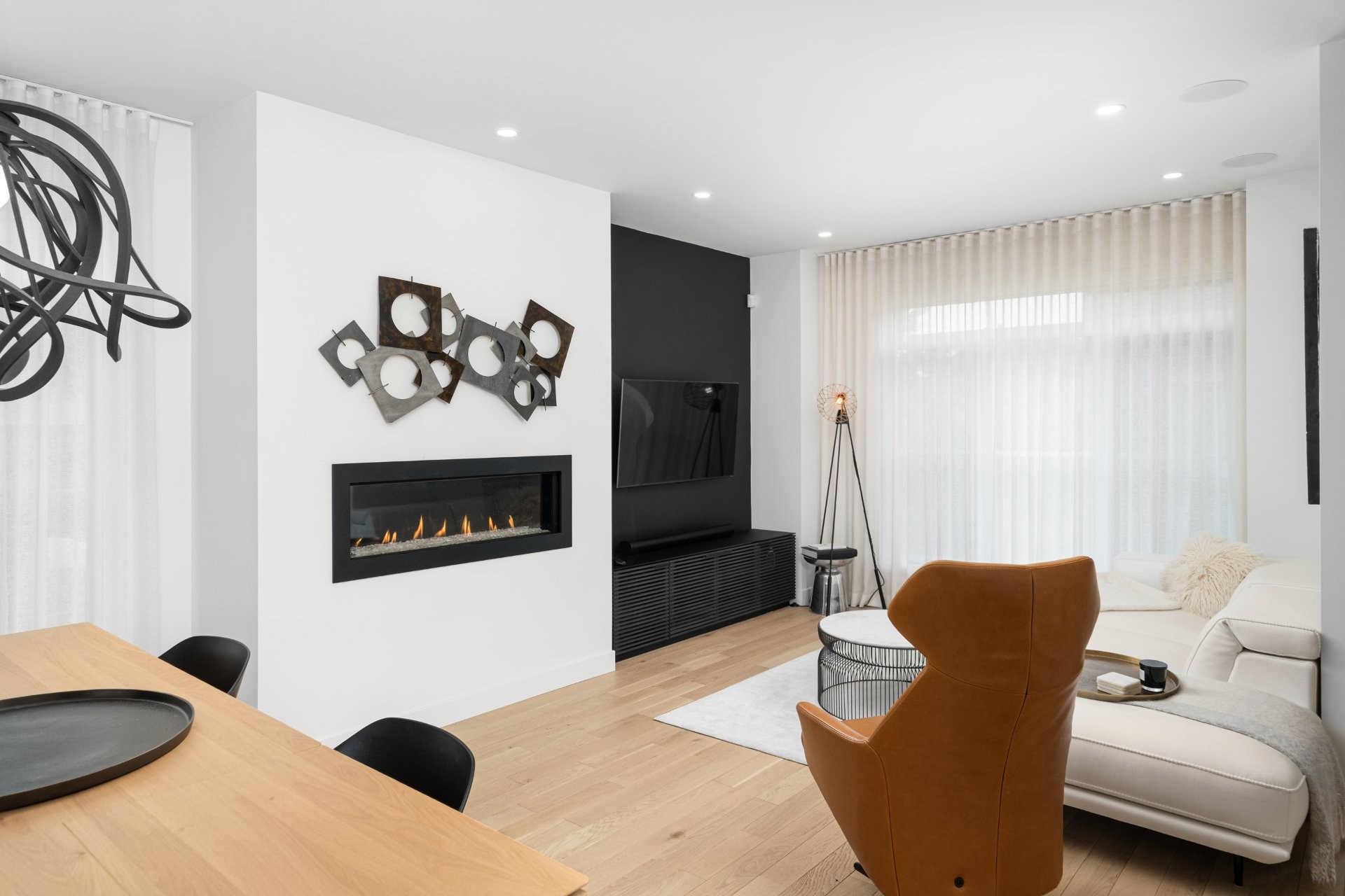 tep inside to a luxurious open-concept living space filled with natural light from expansive windows. The inviting living room features a modern Napoleon natural gas fireplace, while the spacious dining area is perfect for entertaining. The custom-designed contemporary wood kitchen is a true showstopper, complete with a marble backsplash, thoughtful organizational features, and high-end built-in Fisher & Paykel appliances. A Julien sink with accessories and a touch-technology faucet adds both style and functionality. A sleek powder room with a modern marble sink completes this level.