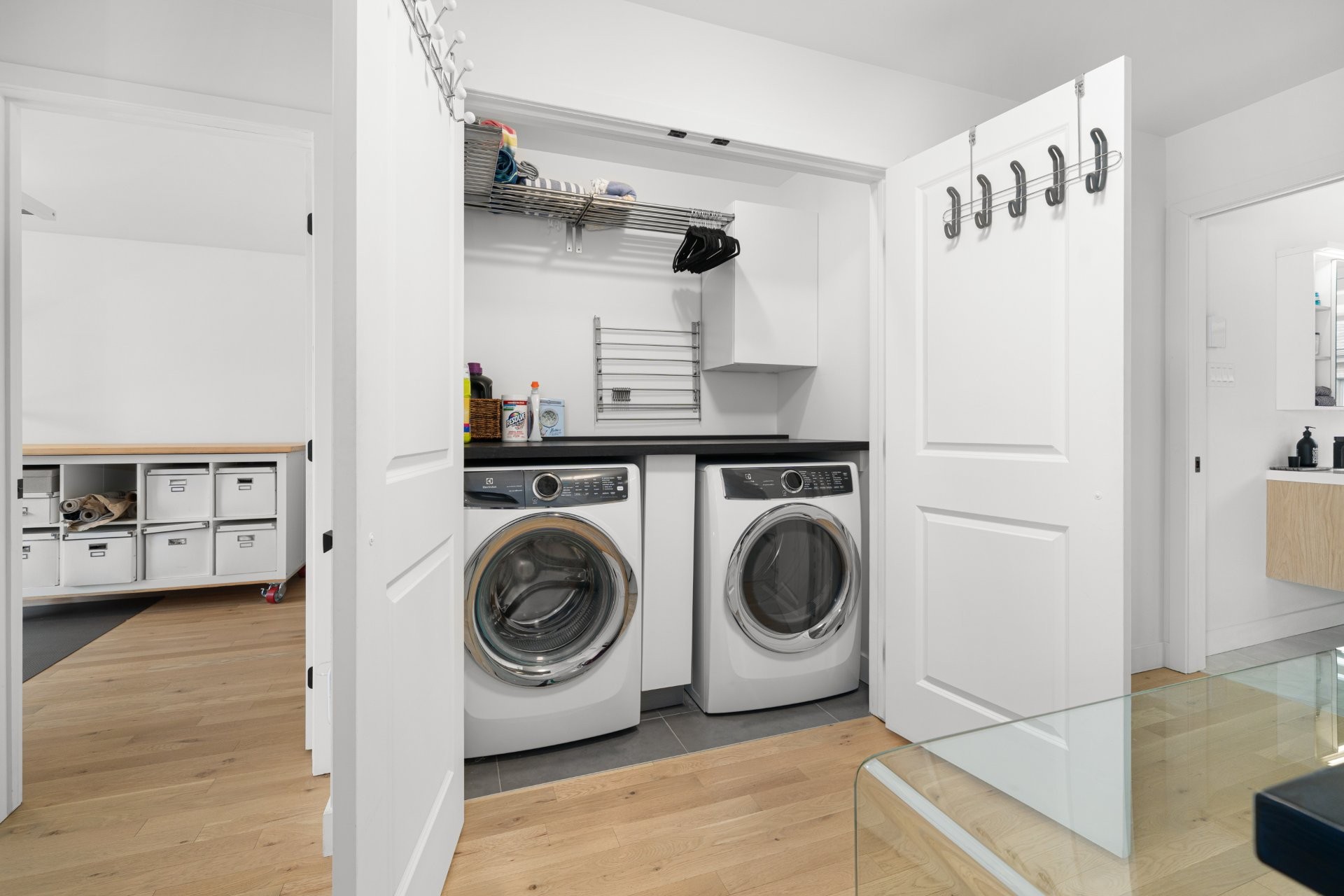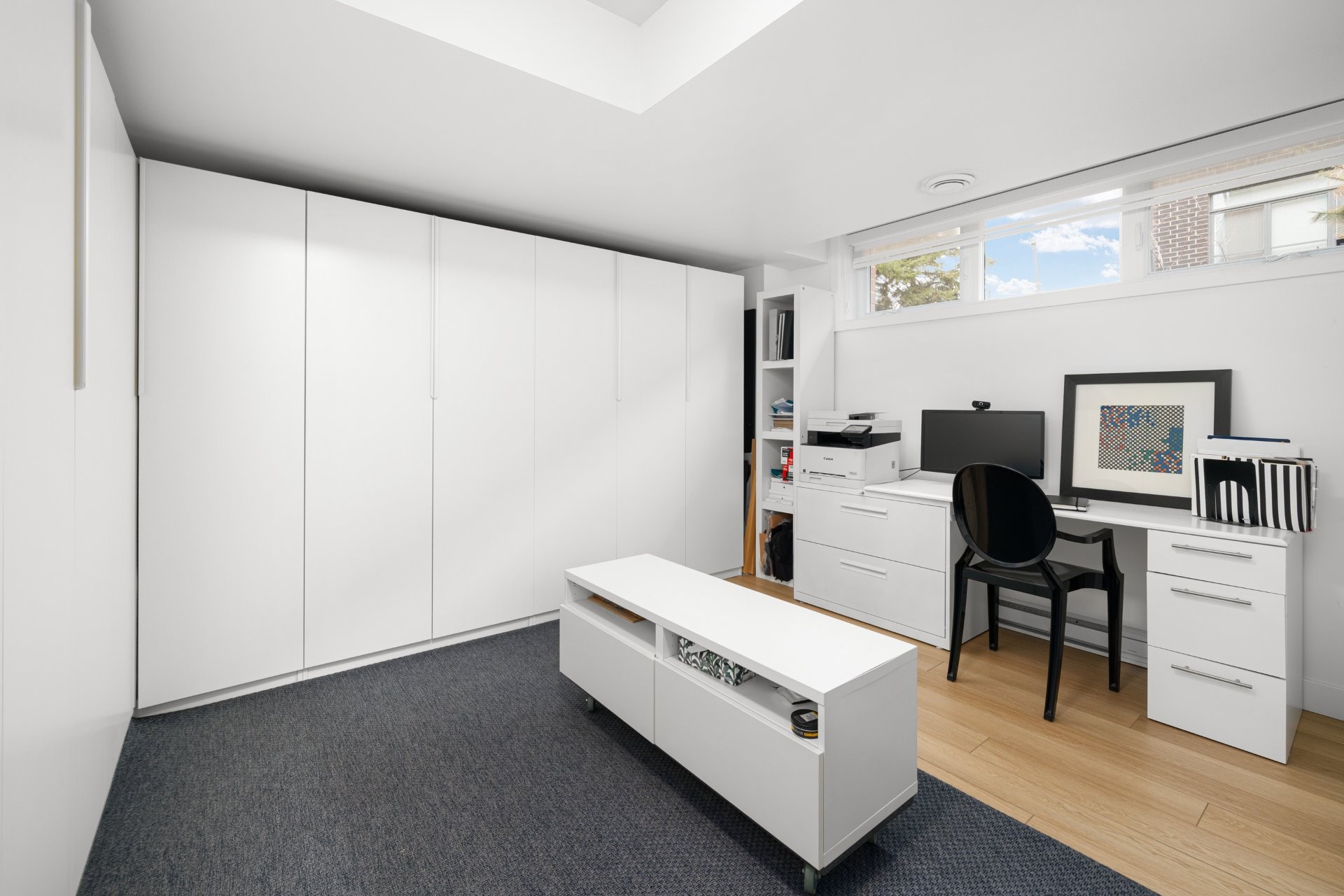 The basement provides a versatile family room that can also function as a mudroom, with direct access to the double garage. The garage is finished with an epoxy floor, professional wall and overhead storage systems.