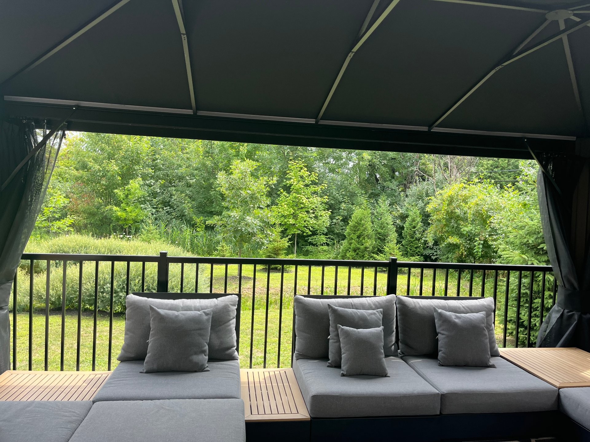 All appliances (refrigerator, dishwasher, oven and induction cooktop, wine cellar, basement refrigerator, washer and dryer), 6 ceiling speakers, outdoor awning (screened and with rain panels) with furniture (8 sofas, 3 tables and 2 ottomans) and outdoor fireplace connected to natural gas, queen Murphy bed, blinds and curtains, central vacuum and accessories.