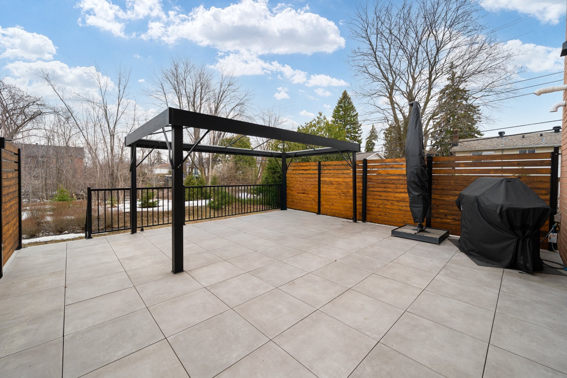 Step outside to enjoy the south-facing backyard with no rear neighbours, overlooking the peaceful greenspace. The outdoor area is designed for relaxation and entertaining, featuring a large patio, a Jardin de Ville gazebo, patio furniture, and a natural gas outdoor fireplace.