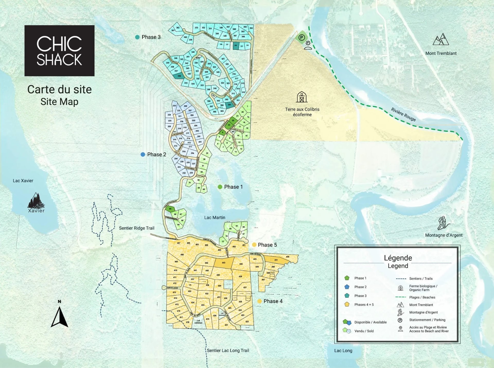 SHORT-TERM RENTALS AUTHORIZED. Superb lots for sale in the magnificent ChicShack estate, ideal for building your dream chalet. Located just minutes from the Rouge River and Montagne d'Argent, and only 12 minutes from Mont-Tremblant, the ChicShack estate offers an idyllic setting for your future chalet. Each lot is wooded and spacious, perfect for building your own peaceful haven. Phase 3 of this exclusive estate offers notarized access to the Rivière Rouge for relaxation and water sports. The estate is managed by a syndicate of co-owners who oversee the upkeep of the grounds and roads.
