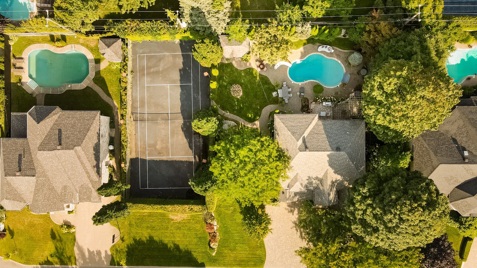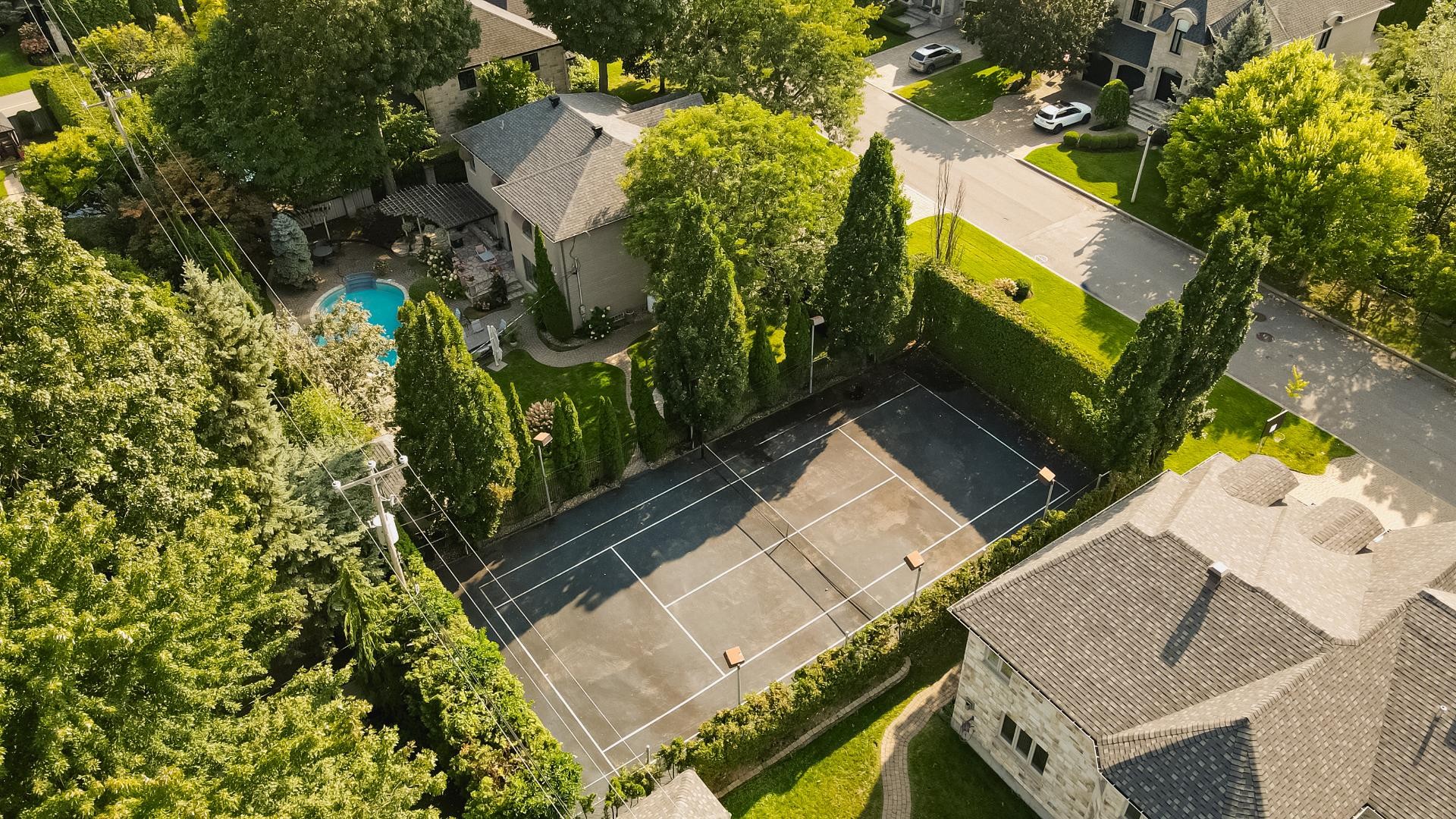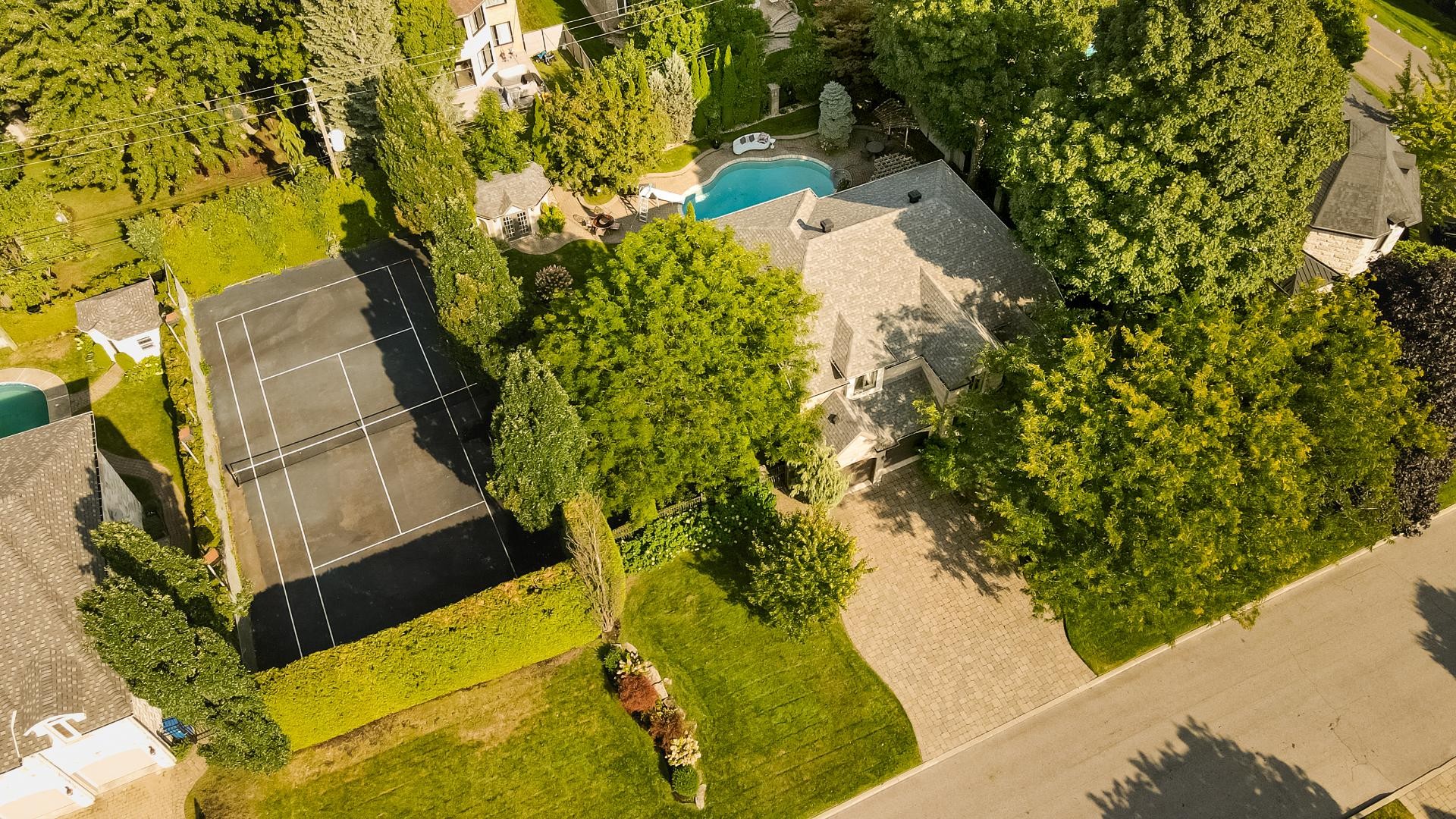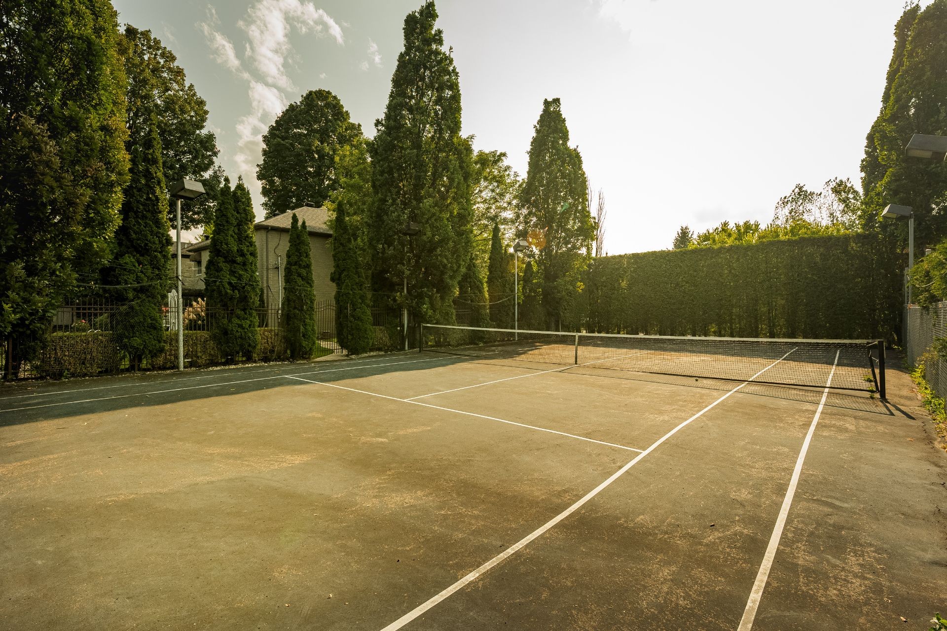 Stunning stone patio under handcrafted wood-and-steel awnings with artisanal rope accents. Custom-built cabanon with new roof. Private, handcrafted verandas. Saltwater pool (built 2002, newly lined). Mature trees and custom fencing for seclusion. Private blue tennis court with special evening lights. Ambient exterior lighting for magical nights.