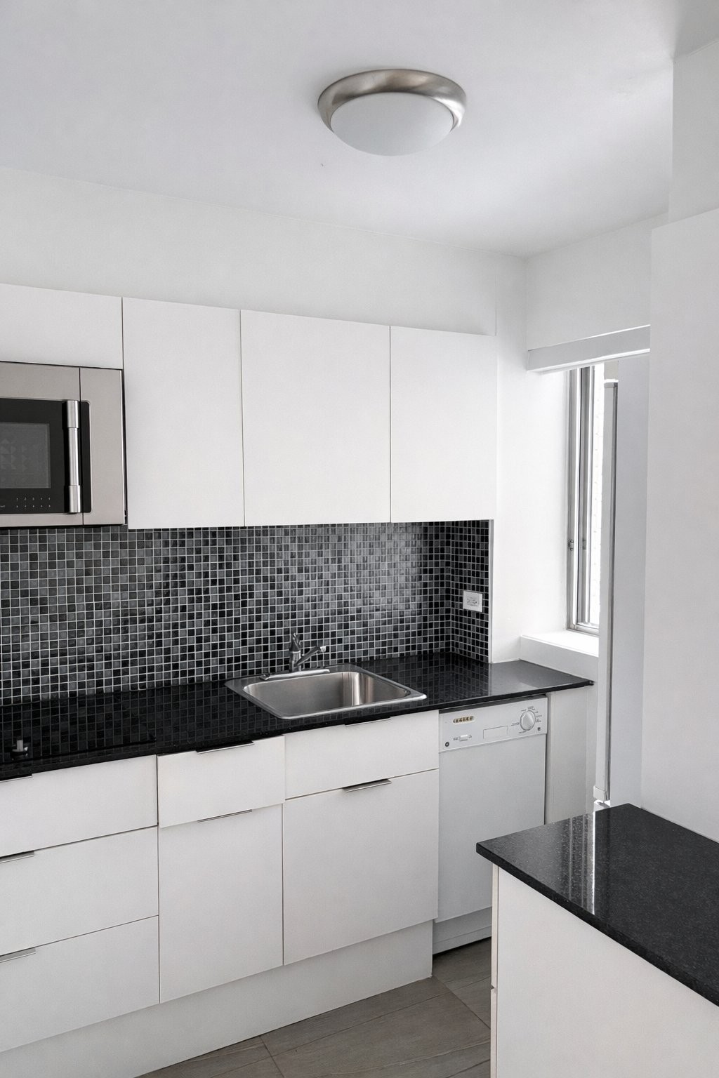 Refrigerator, dishwasher, induction cooktop, convection microwave. Building offers shared laundry facilities. Heating, hot water, and air conditioning included.