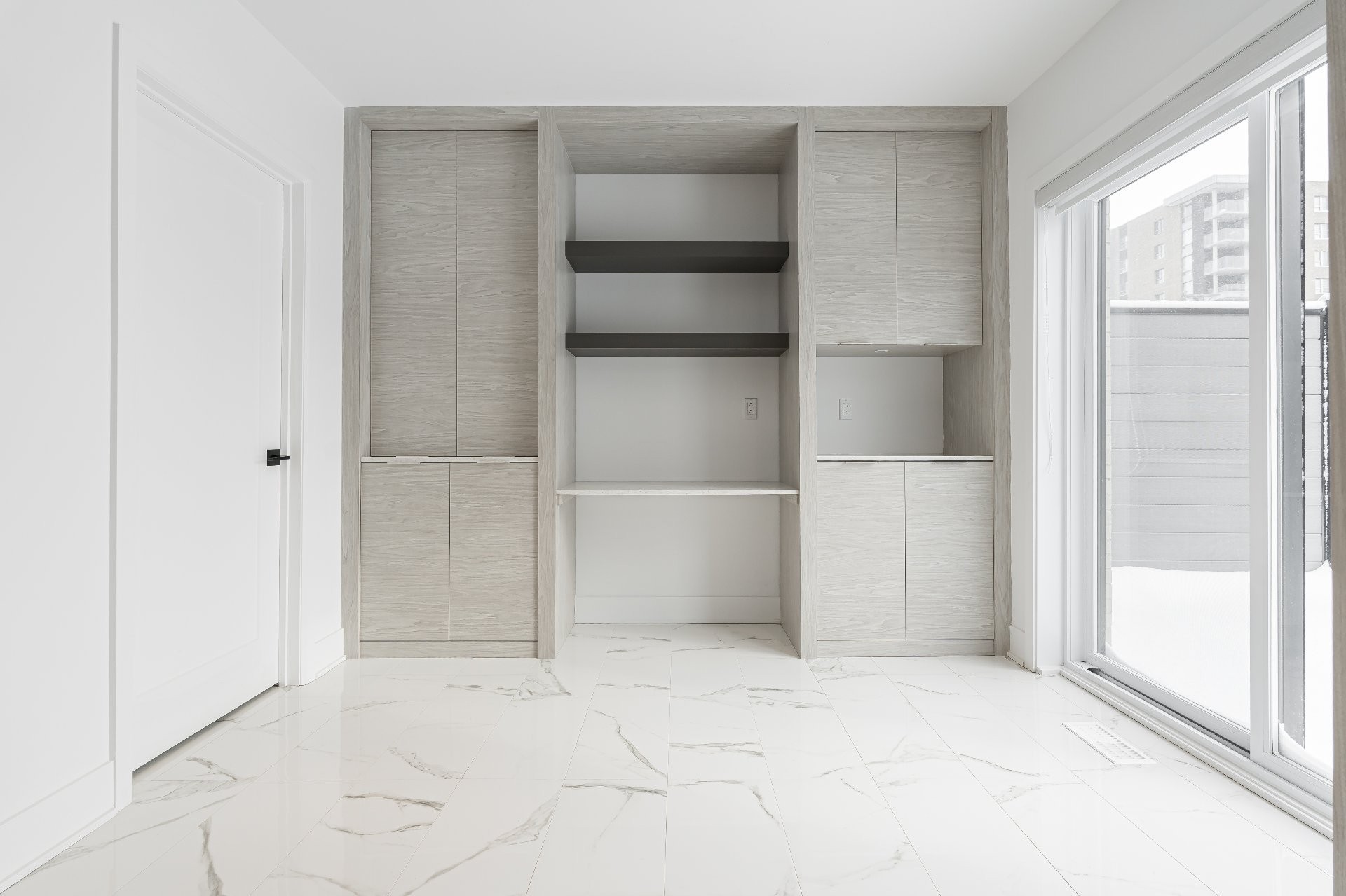 - Elegant desk nook with custom built-in open shelving and closed cabinetry for added kitchen storage.