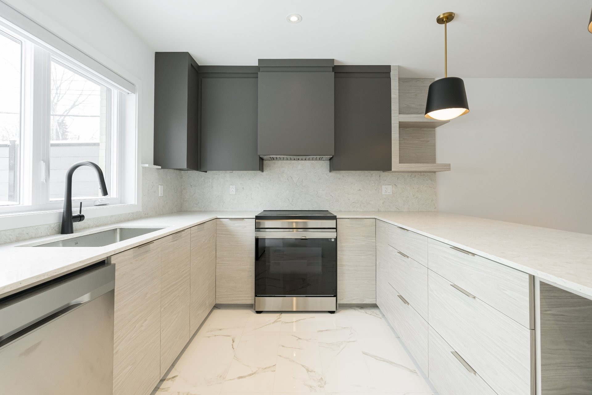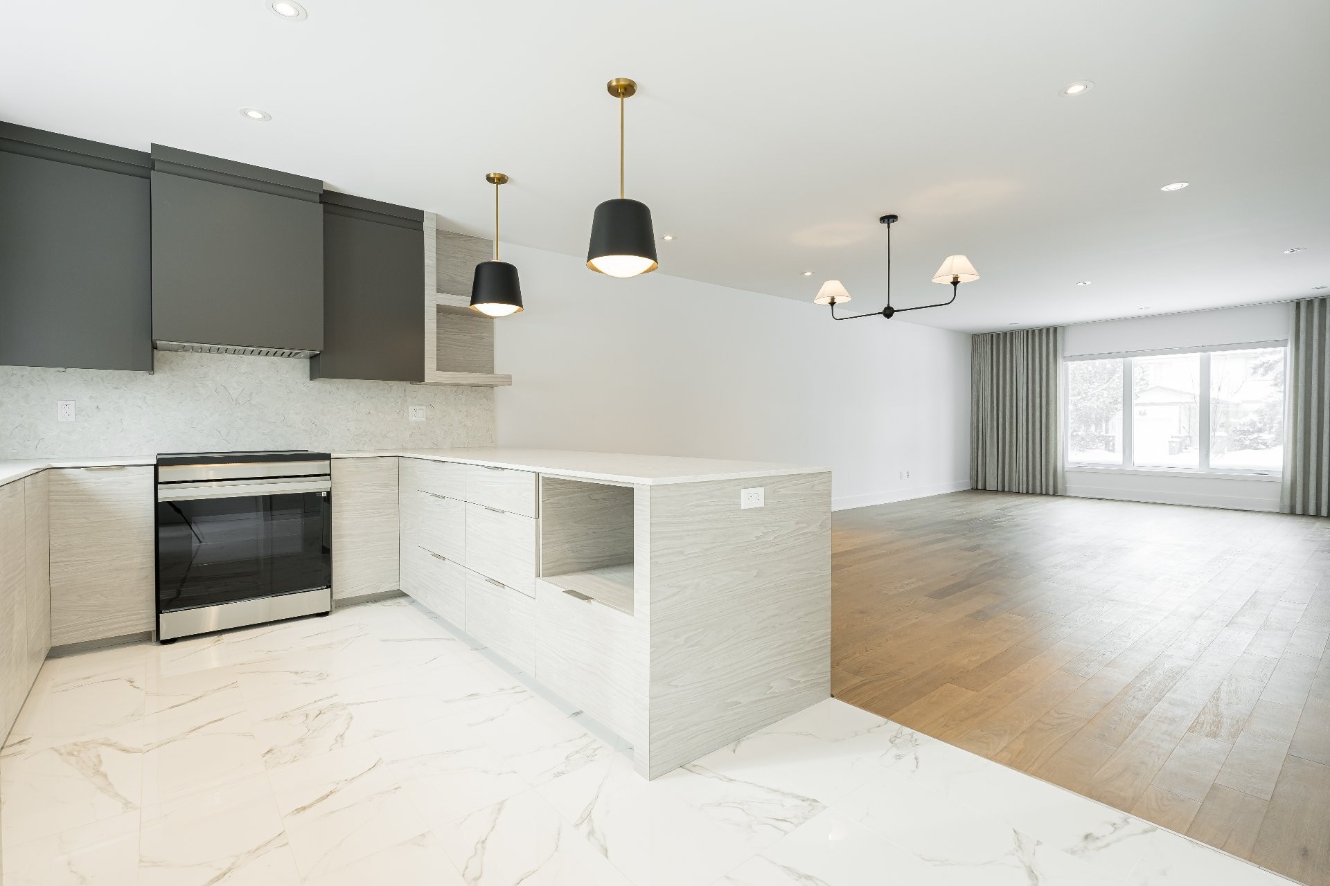 - Beautiful kitchen with two-tone floor-to-ceiling cabinetry, sleek quartz countertops and backsplash, comfortable counter seating for 4 and direct sightlines to the dining and living room.