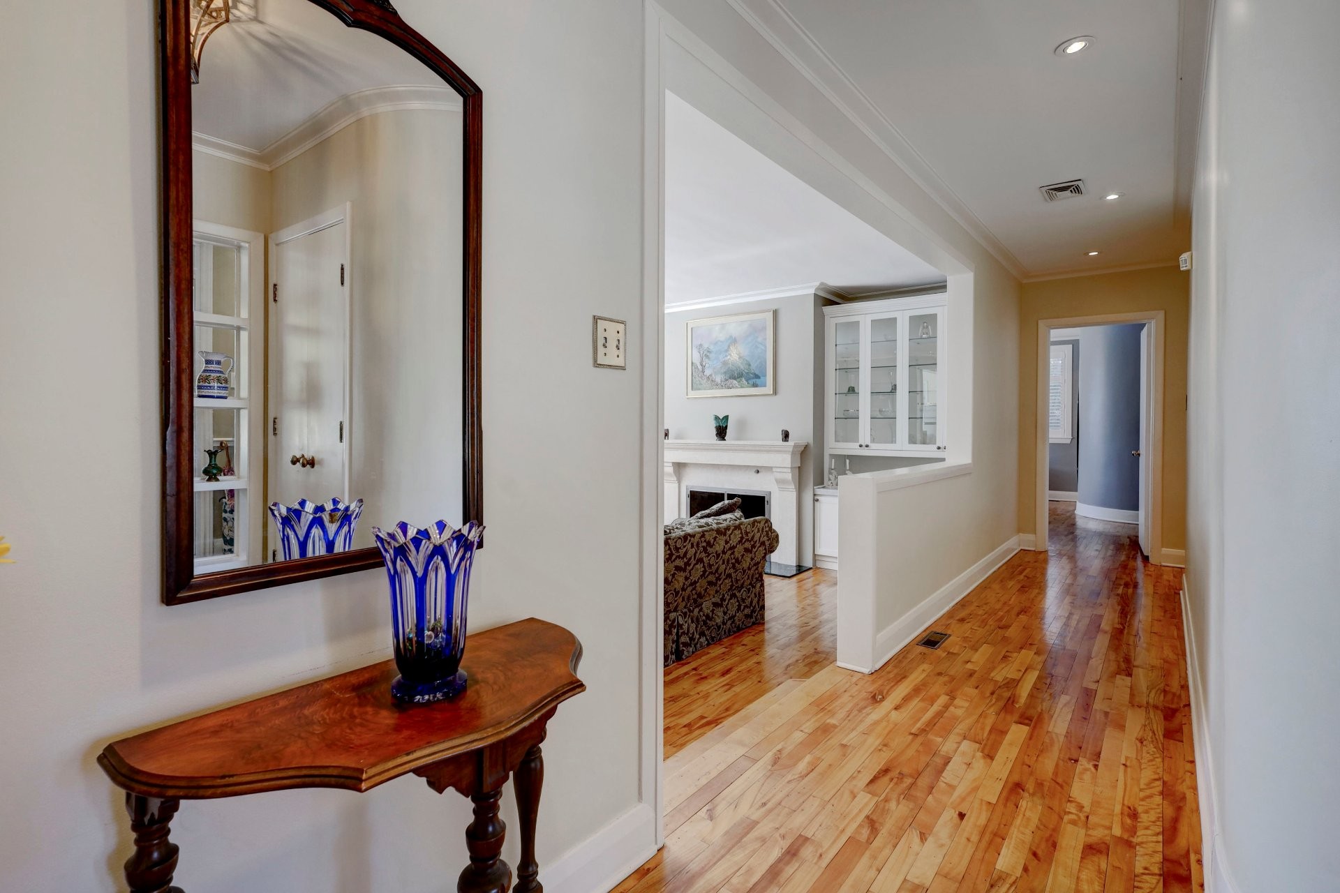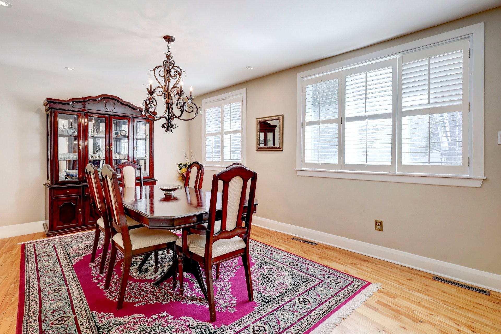 The formal sunken living room (23.10 x 18.9) boasts a nine-foot ceiling, a wood-burning fireplace, and custom built-ins with a marble shelf, creating a warm and inviting space for relaxation and entertaining.