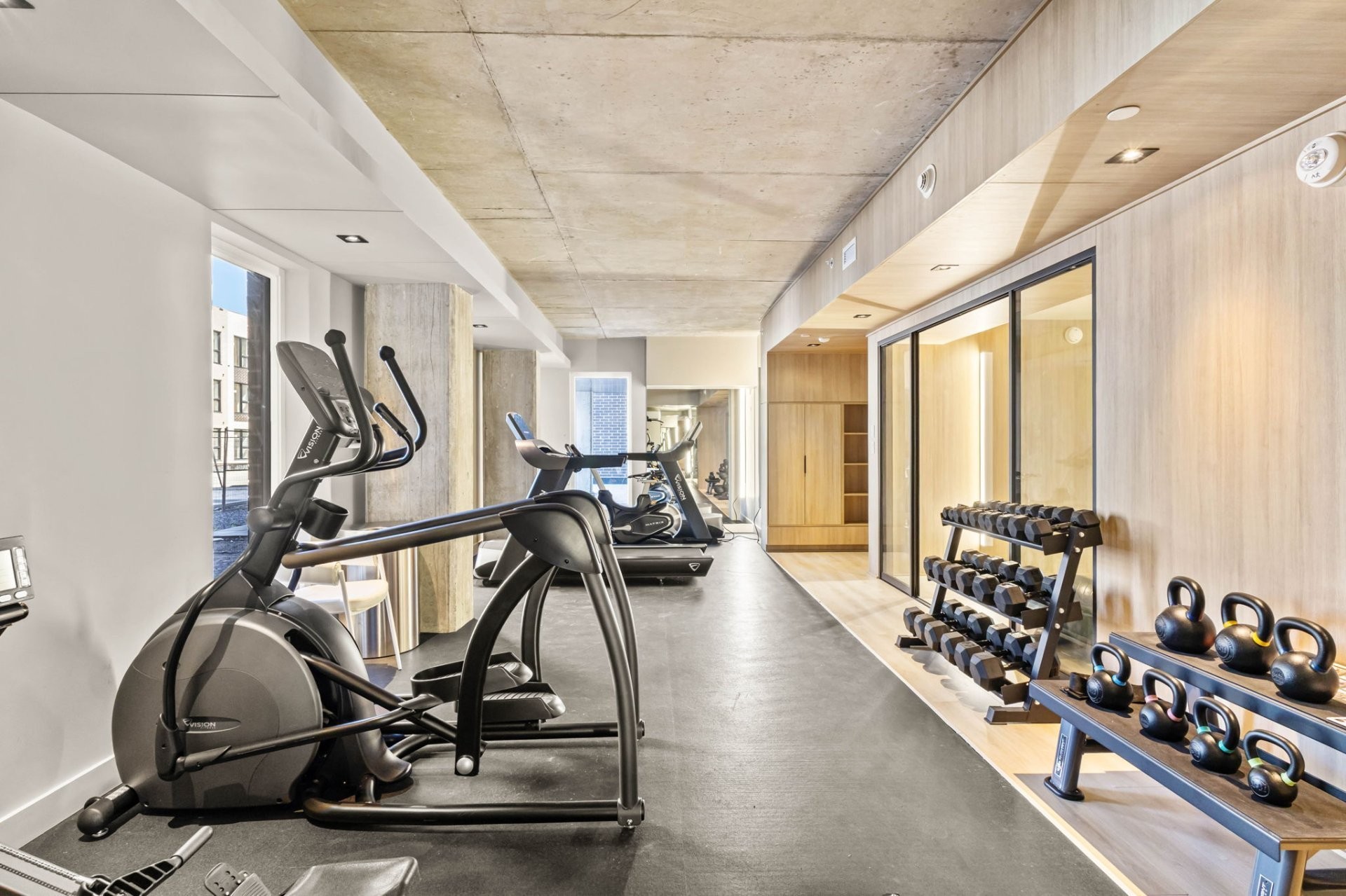 Exceptional shared amenities: Heated outdoor pool, fully equipped fitness room, yoga studio, designer lounge with soaring ceilings, mini-golf, landscaped courtyard, community garden, underground bicycle storage, and secure parking with EV charging potential