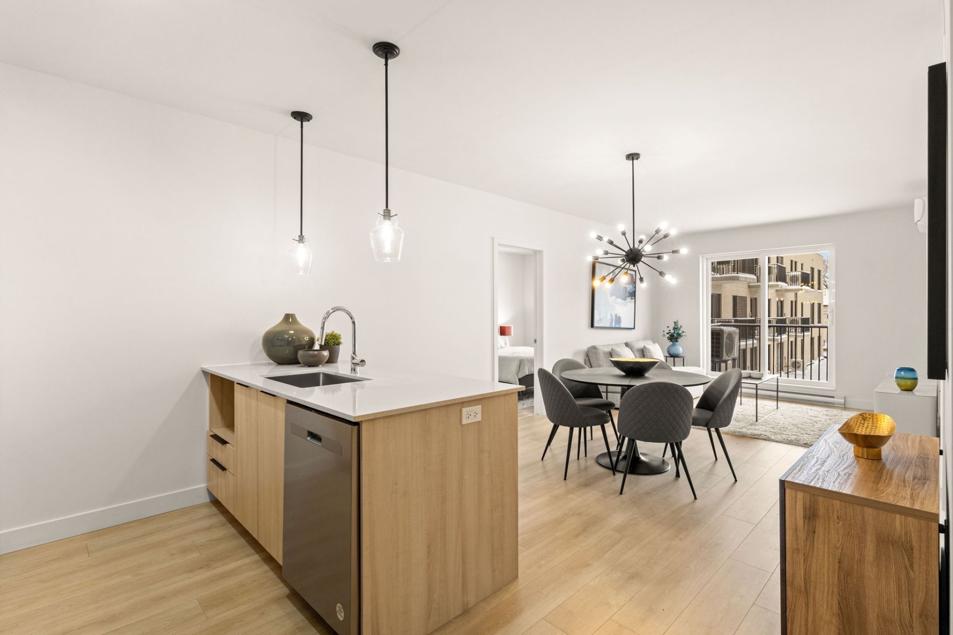 Solaia Condominiums in Dollard-des-Ormeaux - 2-bedroom unit of 1063 sq. ft. with parking and storage locker included. Modern open-concept design, 9-foot ceilings, high-quality finishes, and access to premium amenities including a heated outdoor pool, gym, yoga studio, and landscaped courtyard. Ideally located near highways, REM stations, shopping, parks, and services.