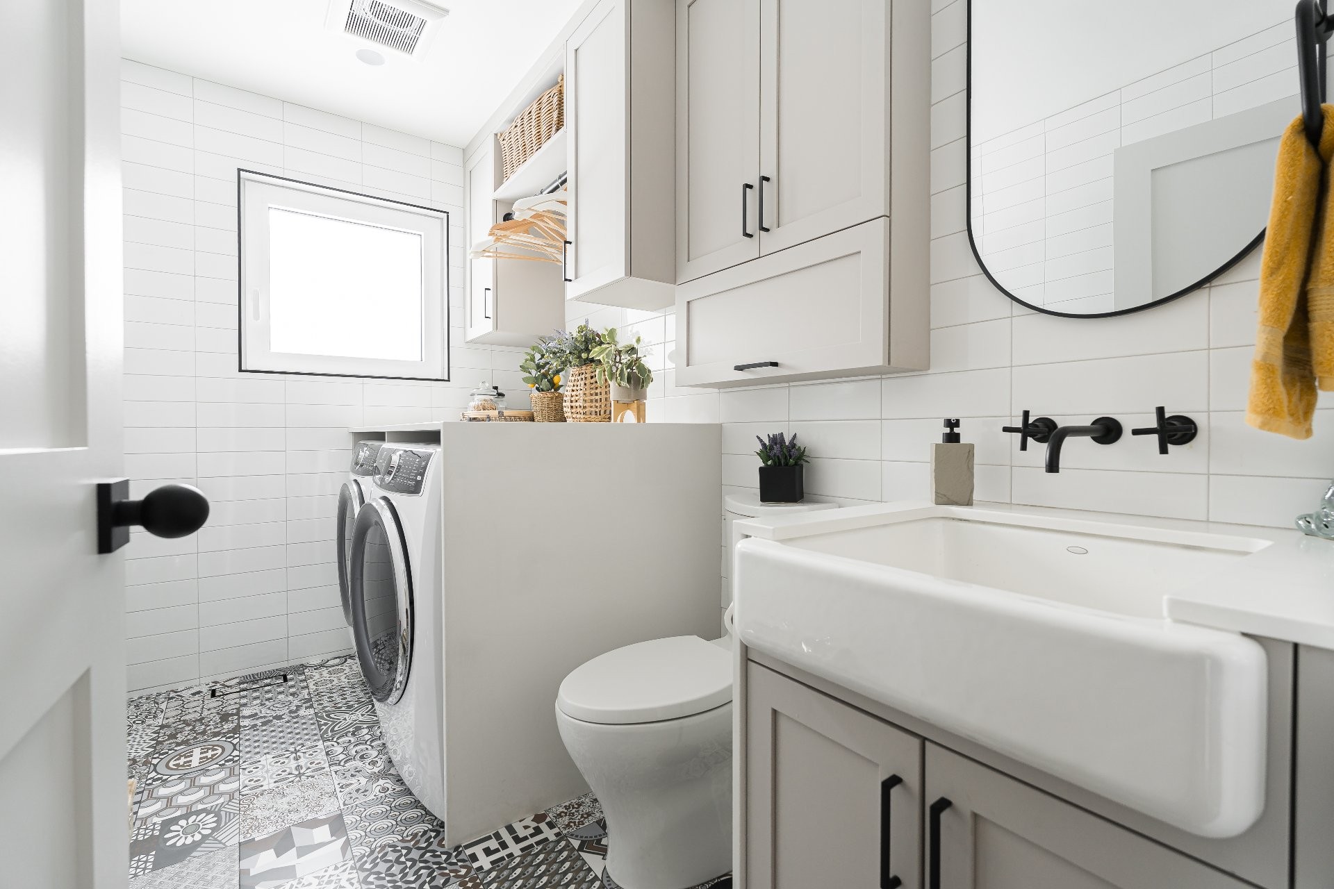 -Updated laundry room including new flooring, vanity, toilet, cabinets, and new window.