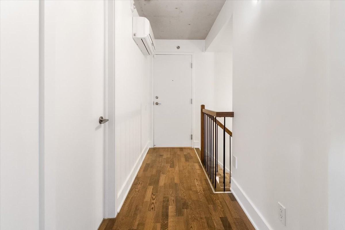 Spacious and bright 2-level condo in the heart of Verdun. Originally a 2-bedroom, now a large 1-bedroom with a walk-in closet and open mezzanine with potential for a 2nd bedroom or office. High ceilings, private terrace, plus access to a shared rooftop with stunning city views. Features include a powder room on the main floor, full bathroom upstairs, laundry room, pantry under the stairs, indoor parking, and a private locker. Quiet street near De l'Église metro, Wellington cafés, parks, and the waterfront. A rare find in one of Montreal's most sought-after neighborhoods.