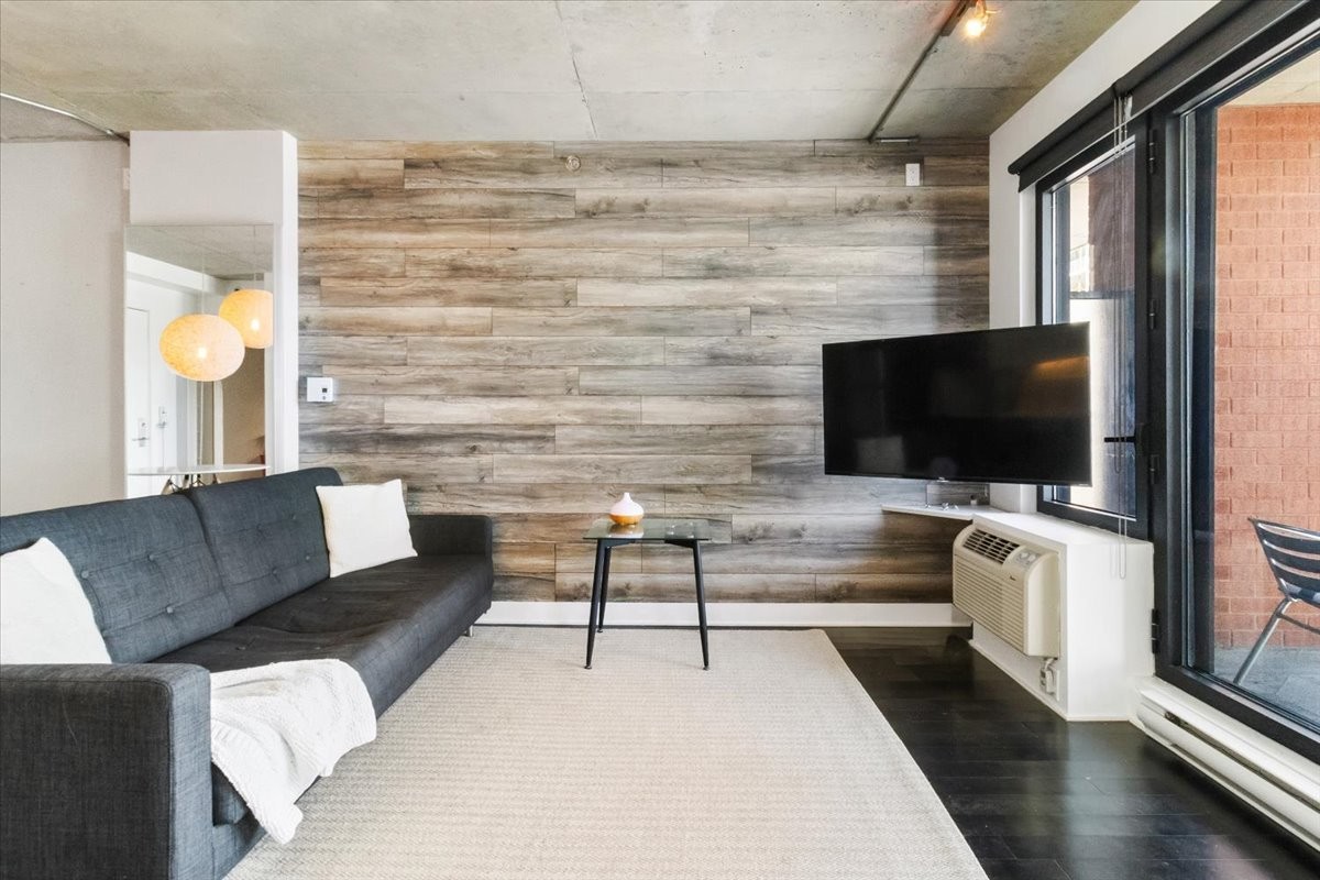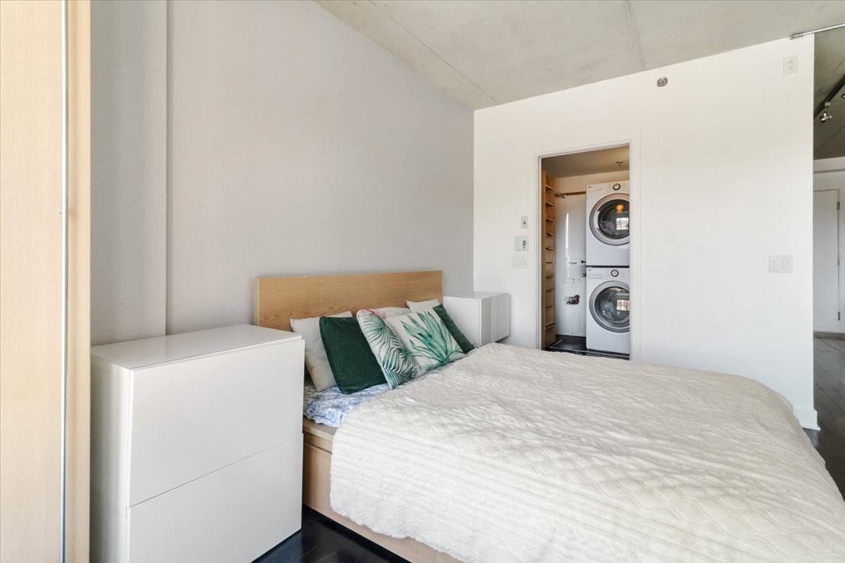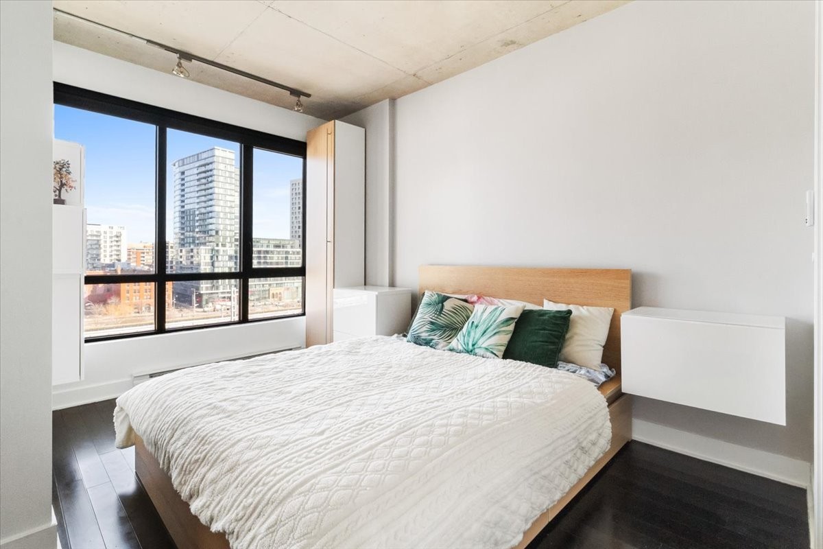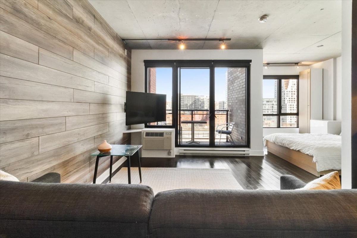 UNIT DETAILSApproximate size: 462 sq. ft. Living Space: Open-concept living and dining area maximizing space and natural light. Kitchen: Modern linear design with quartz countertops and stainless-steel appliances included. Flooring: Hardwood floors. Comfort: Windows air conditioning. Storage: Walk-in closet plus additional locker included. Parking: Garage space included. Outdoor: Private balcony with unobstructed views toward Old Montreal and downtown skyline. Construction: Solid concrete building ensuring superior soundproofing.