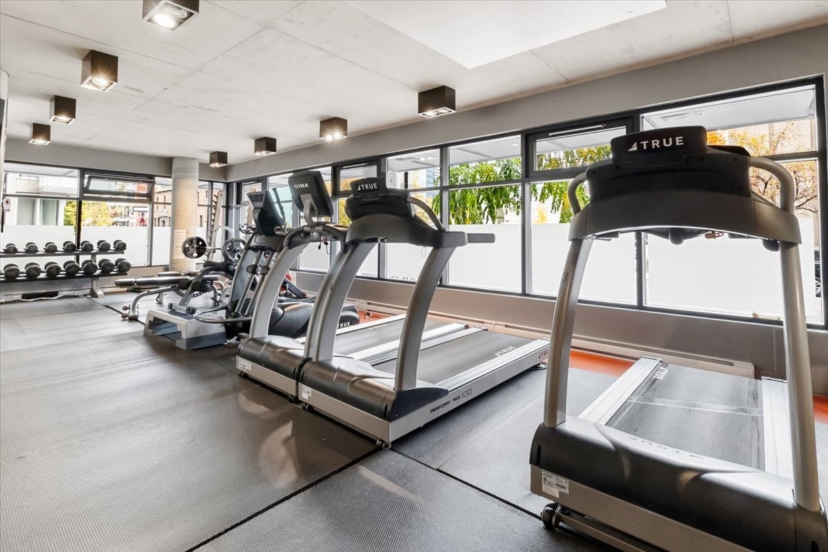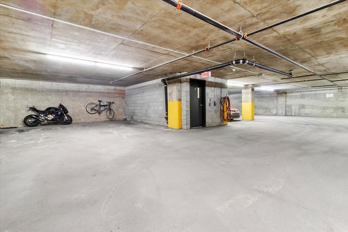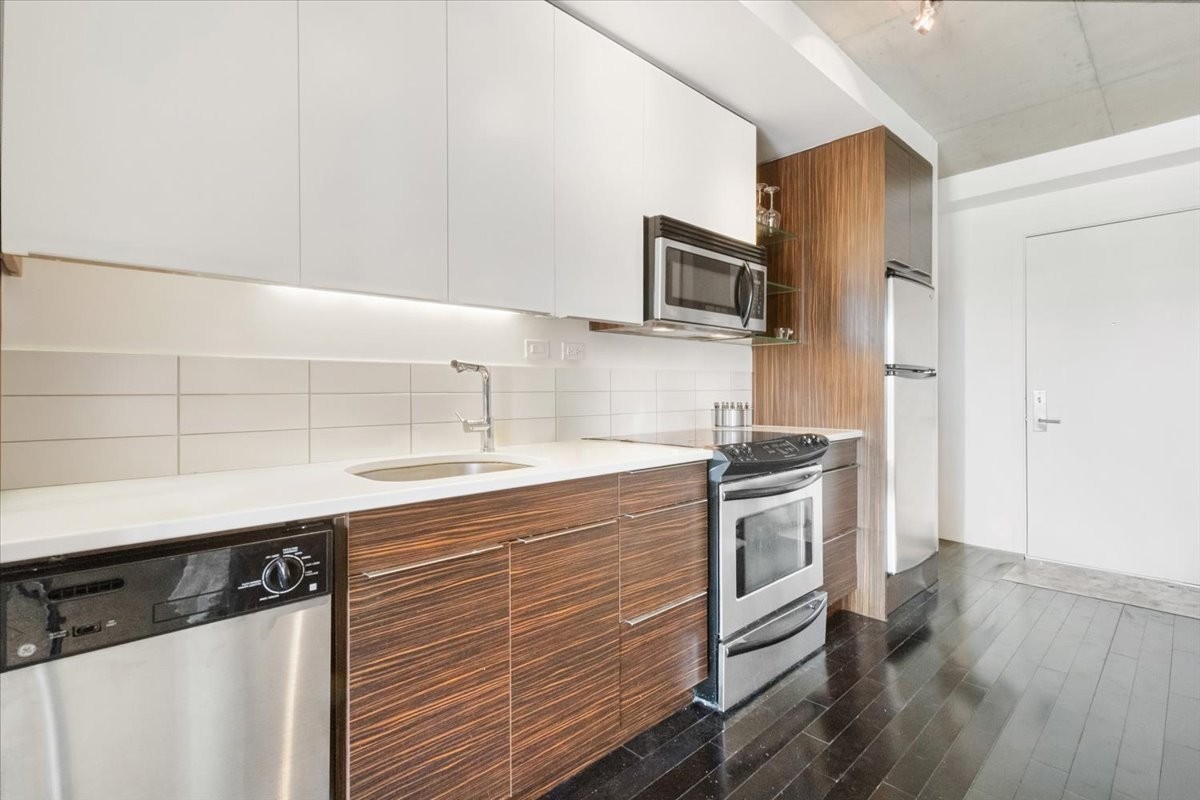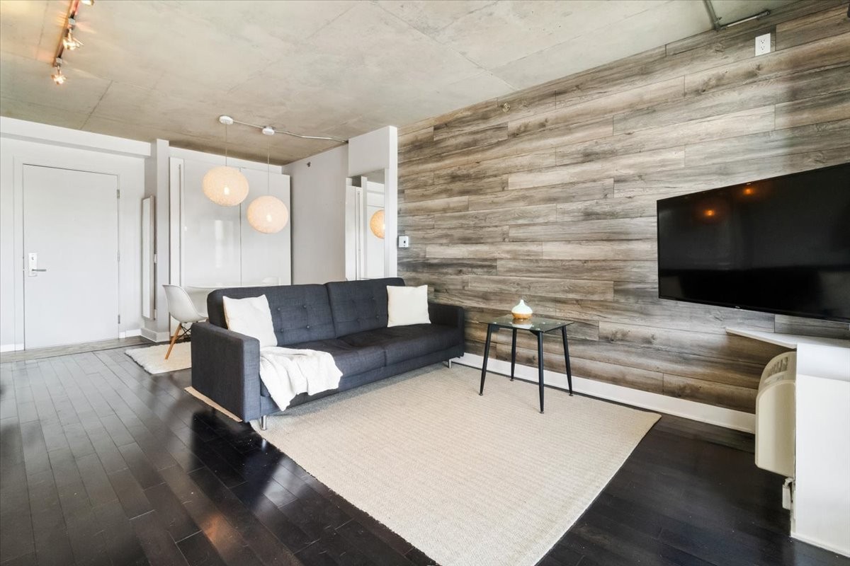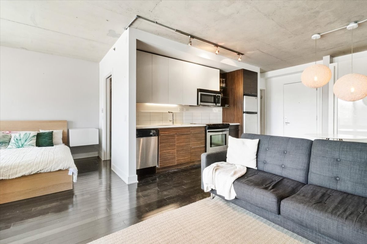 UNIT DETAILSApproximate size: 462 sq. ft. Living Space: Open-concept living and dining area maximizing space and natural light. Kitchen: Modern linear design with quartz countertops and stainless-steel appliances included. Flooring: Hardwood floors. Comfort: Windows air conditioning. Storage: Walk-in closet plus additional locker included. Parking: Garage space included. Outdoor: Private balcony with unobstructed views toward Old Montreal and downtown skyline. Construction: Solid concrete building ensuring superior soundproofing.