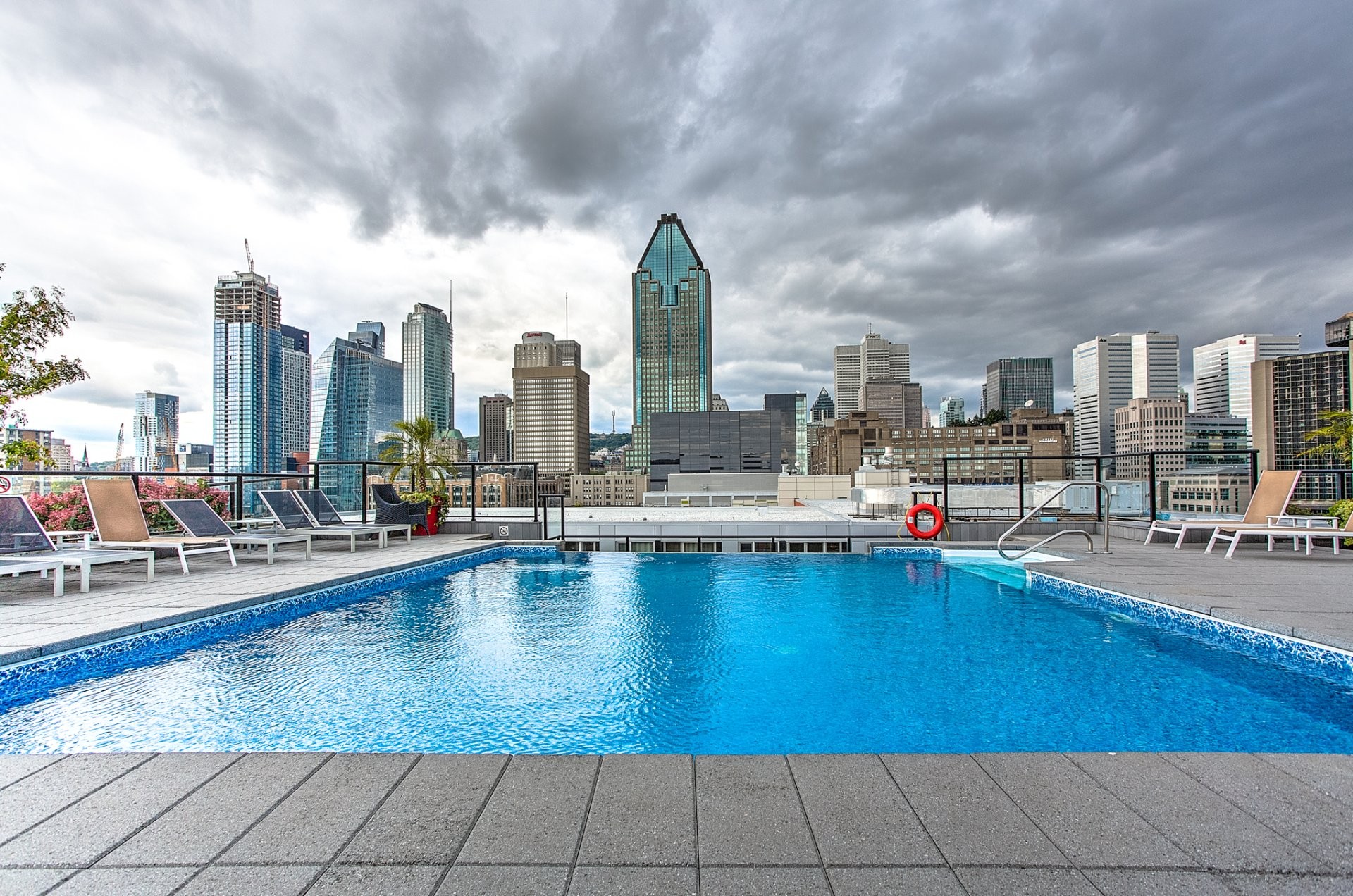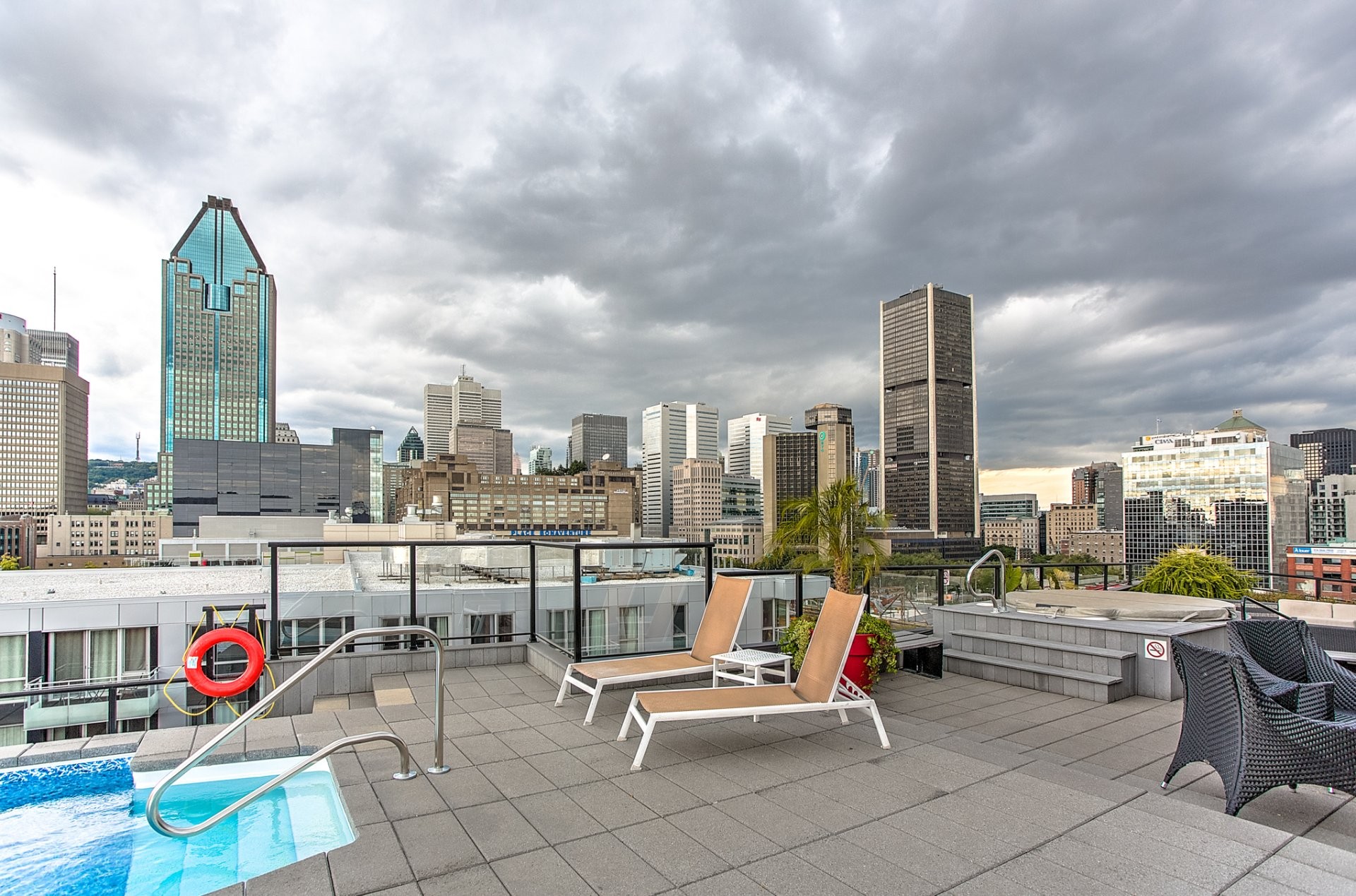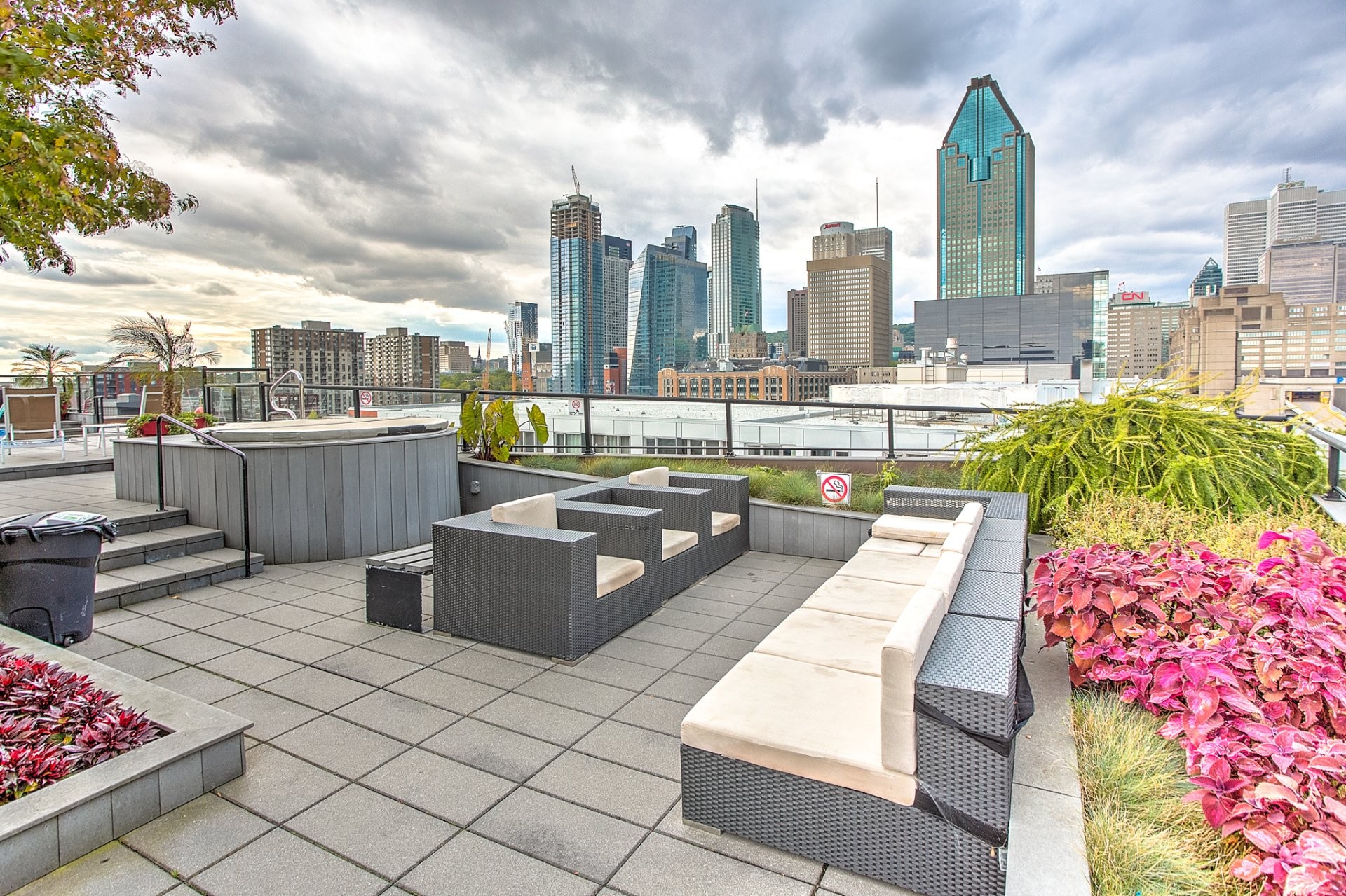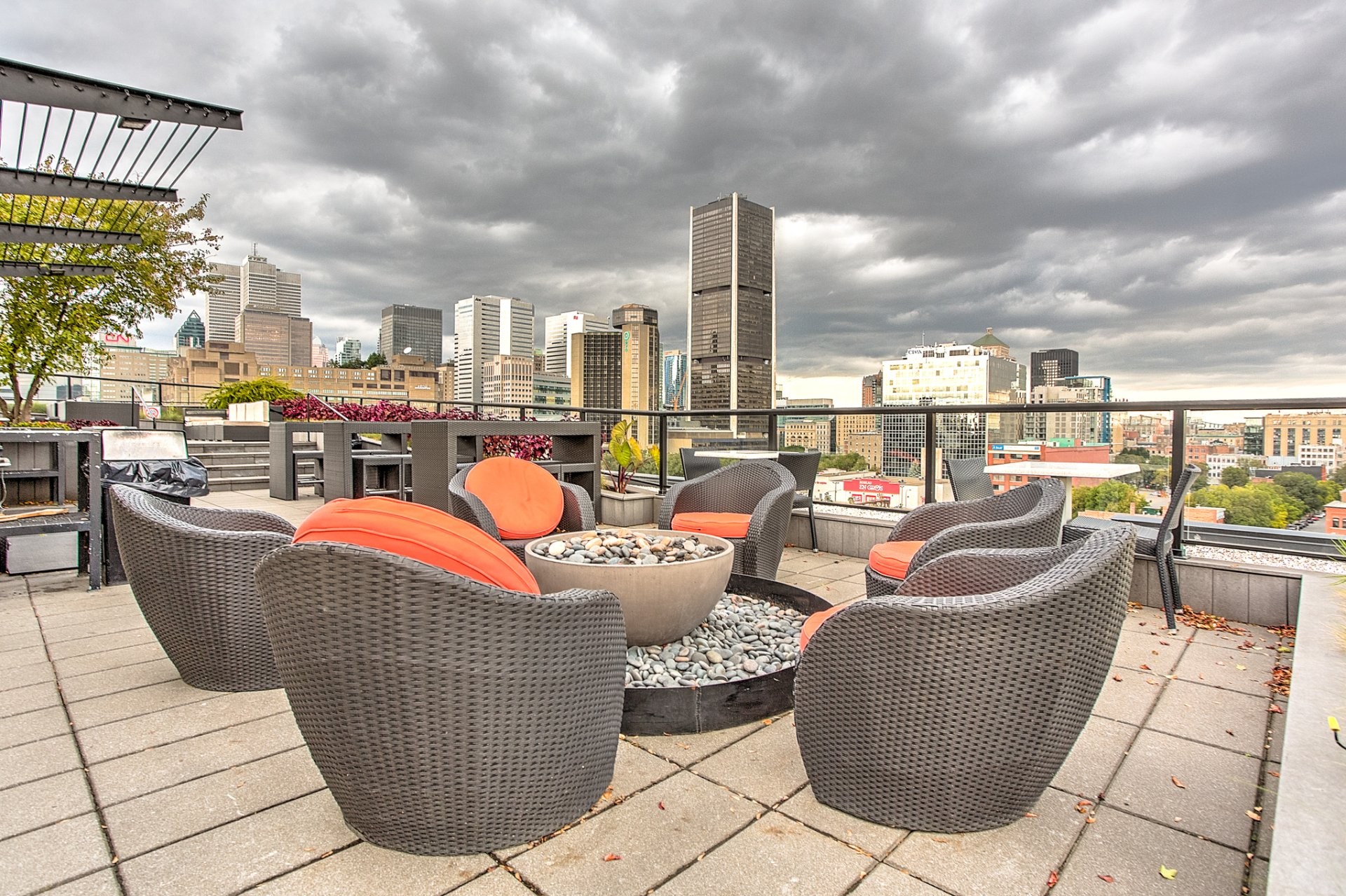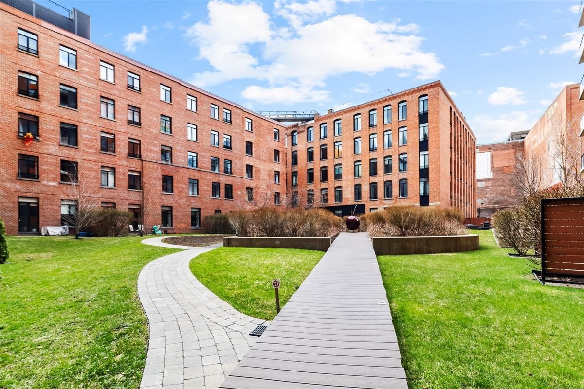 BUILDING & COMMON AREAS10-storey concrete construction with elevator access. Rooftop terrace featuring infinity pool, jacuzzi, BBQ areas, outdoor fireplace, and breathtaking panoramic views of downtown Montreal. Urban chalet accessible year-round. Fully equipped modern fitness center. Landscaped historic inner courtyard highlighting the site's industrial past, including the Cherry Blossom statue honoring the former factory heritage.