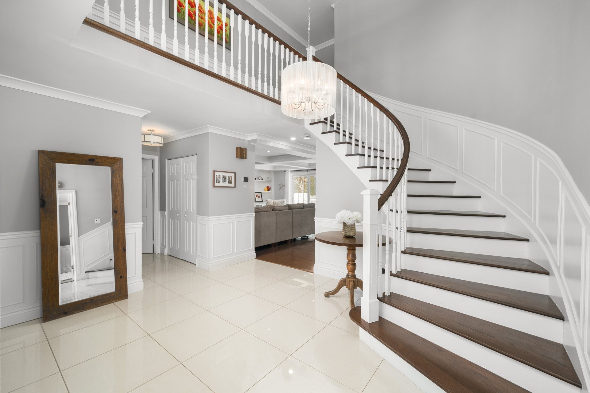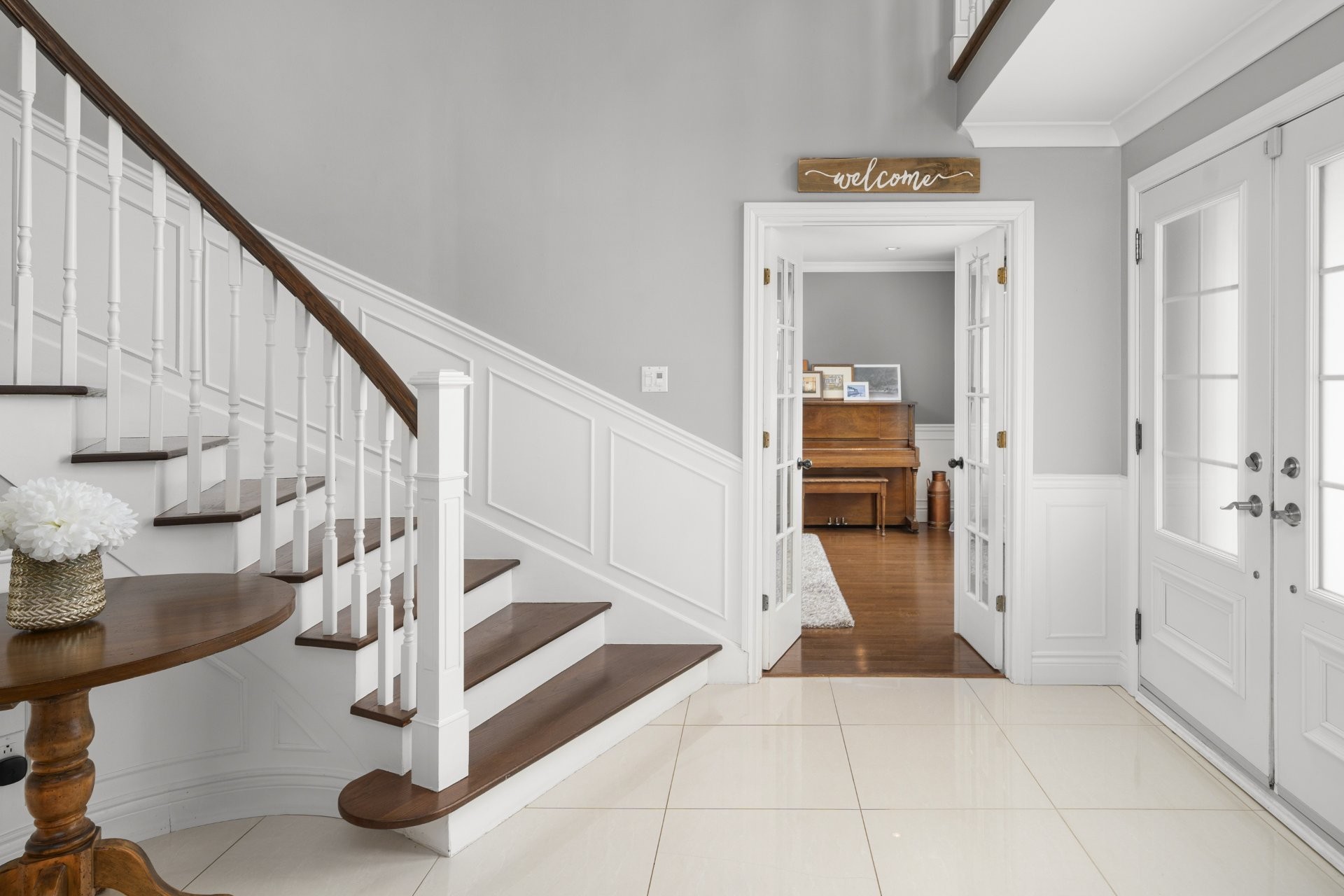 The main floor showcases strip wood flooring throughout, creating a warm and cohesive feel. A spacious foyer opens to a bright living and dining room combination, perfect for entertaining. The updated kitchen features white granite countertops, a large central island ideal for family gatherings, and flows seamlessly into the inviting family room with a wood-burning fireplace, vaulted ceiling, and custom built-ins.