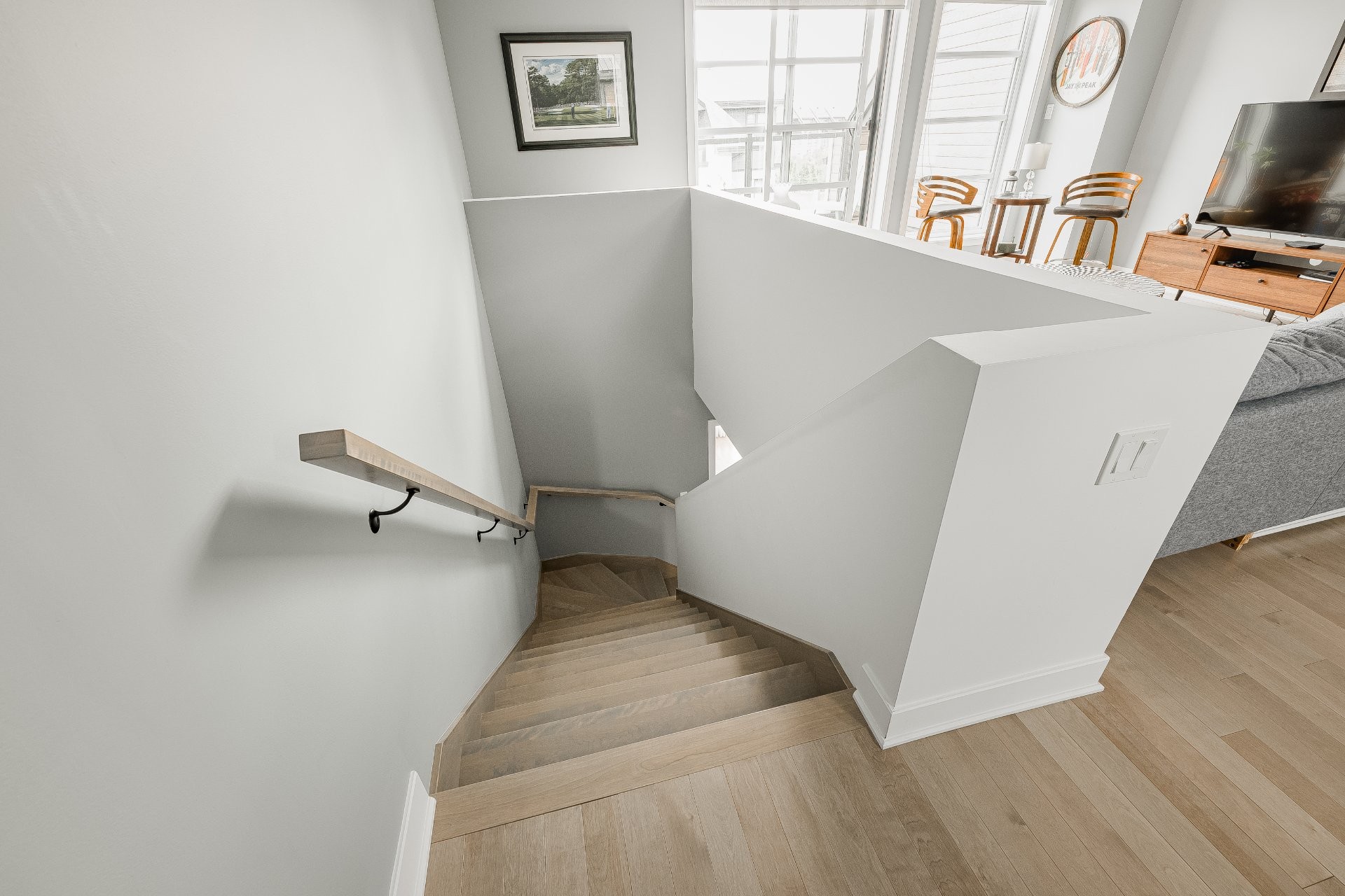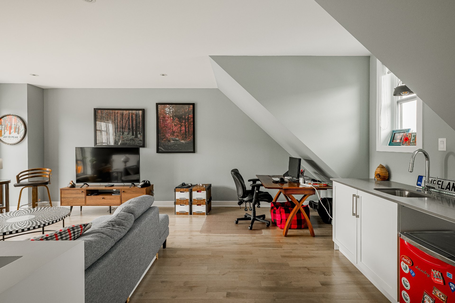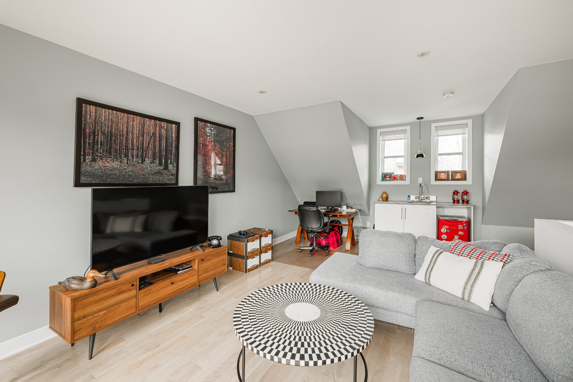 3rd floor mezzanine with a private wood balcony: Currently used as a family room with a convenient Shaker style kitchenette with quartz countertop and sink.