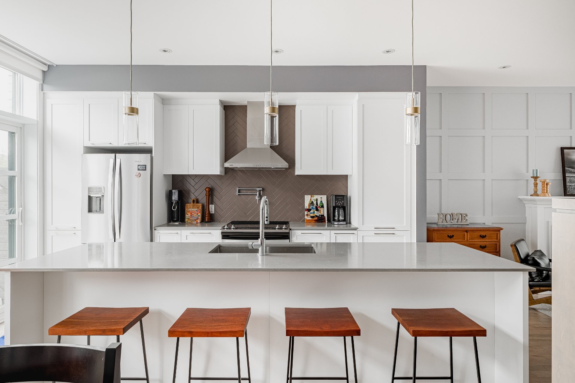 1st floor: 9 ft ceilings with 12 ft ceilings in the entrance. Electric fireplace with custom mantle. Shaker-style kitchen cabinets. Quartz countertops. Pot filler water faucet over the stove. Herringbone backsplash. Custom vent hood. Built-in ice maker. Wall mouldings in the living room and dining area Automatic shut-off fan (powder room)