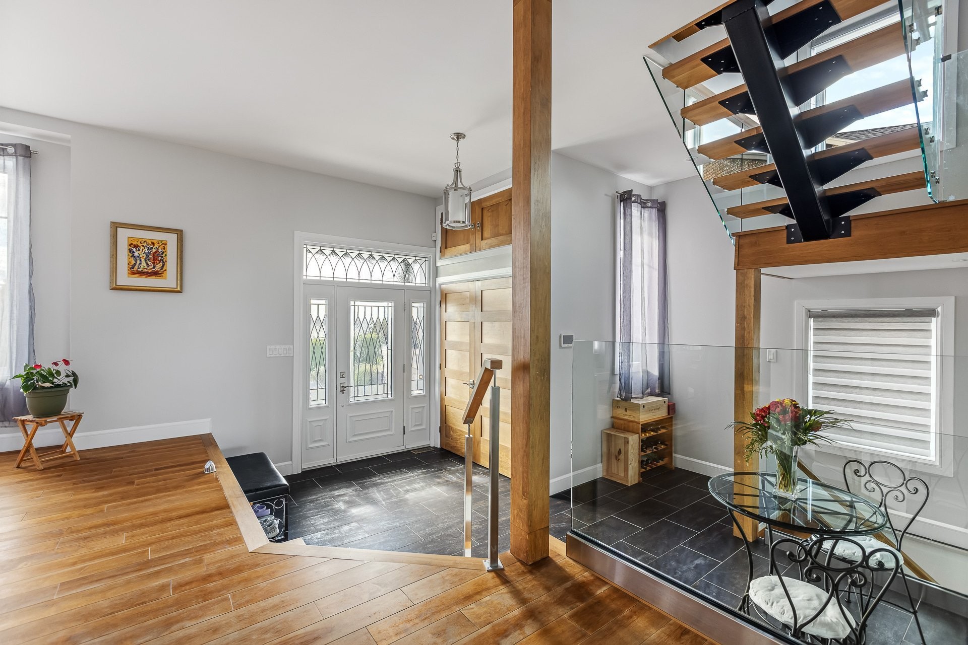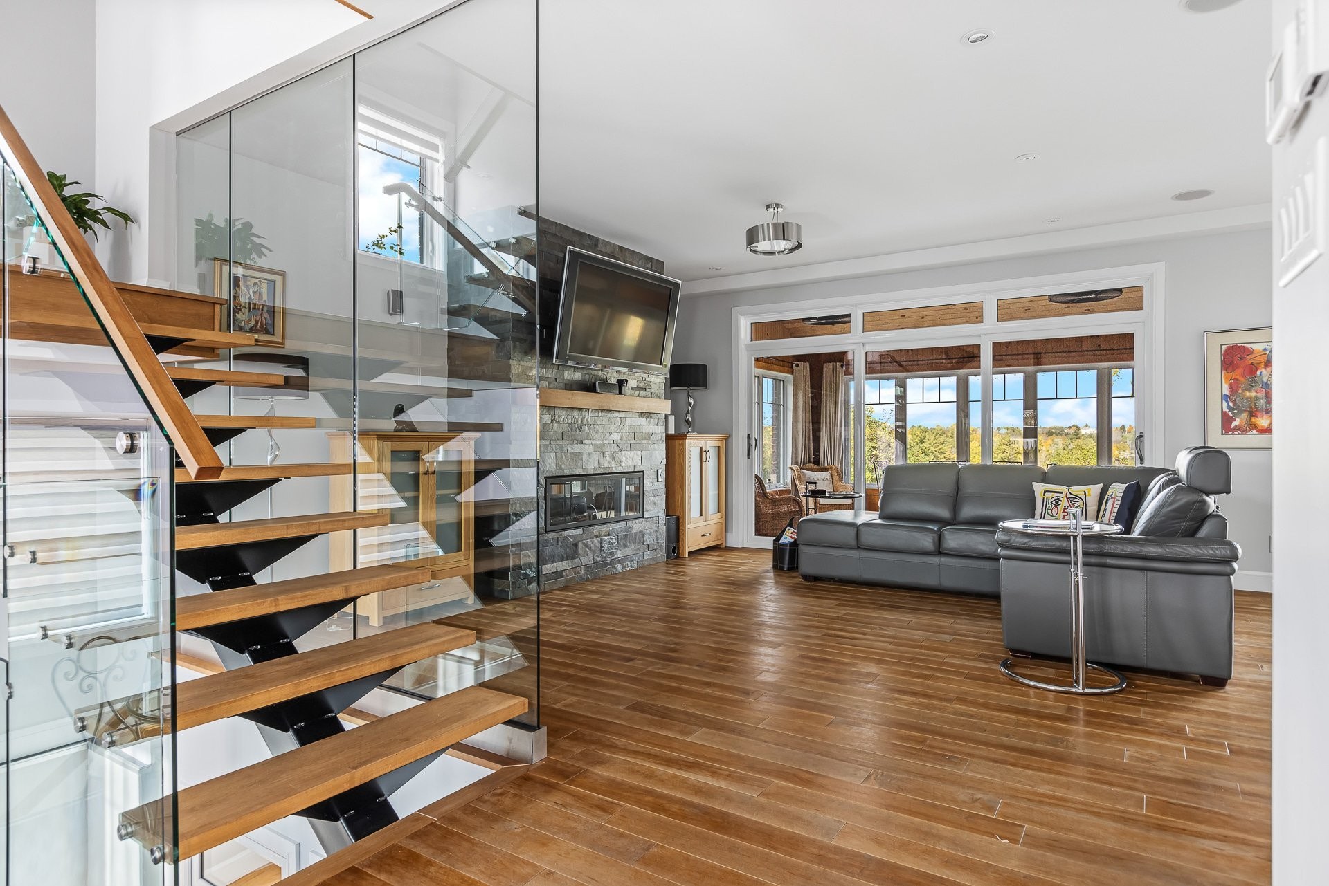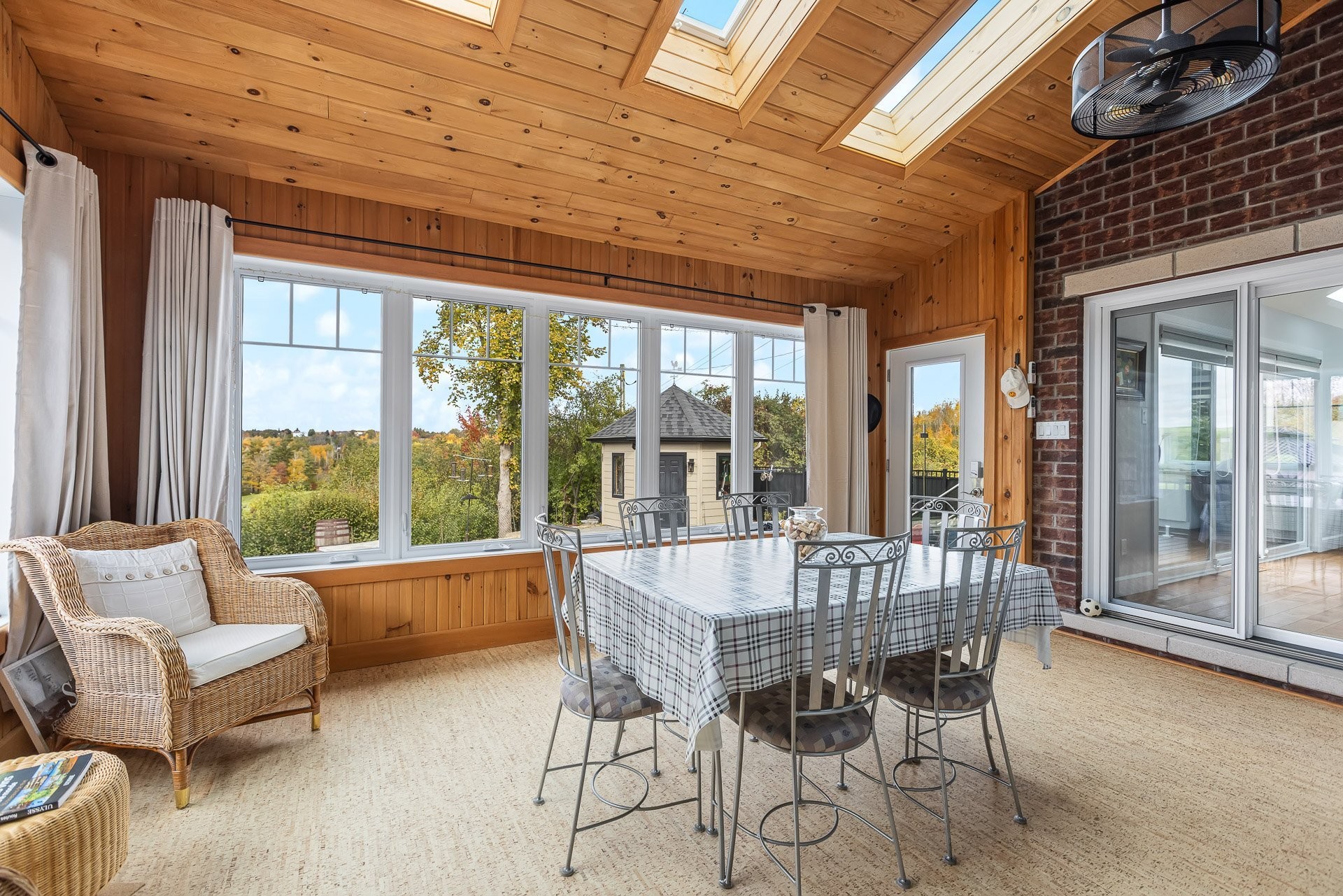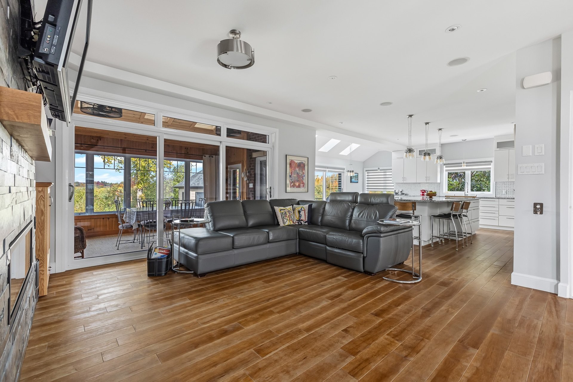 The living room, featuring a magnificent gas fireplace, opens onto an elegant veranda with a skylight, creating an ideal space for relaxing in any season.