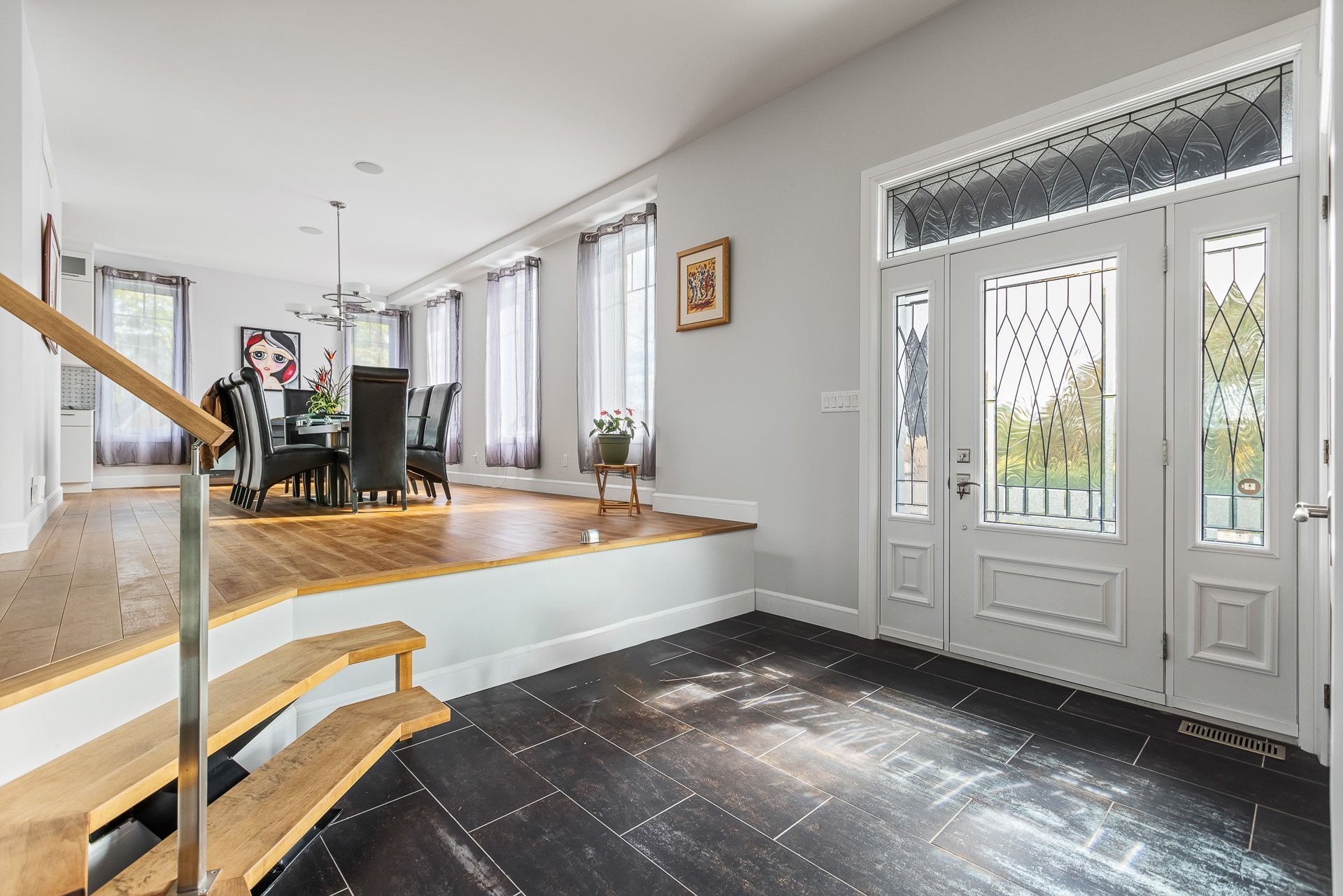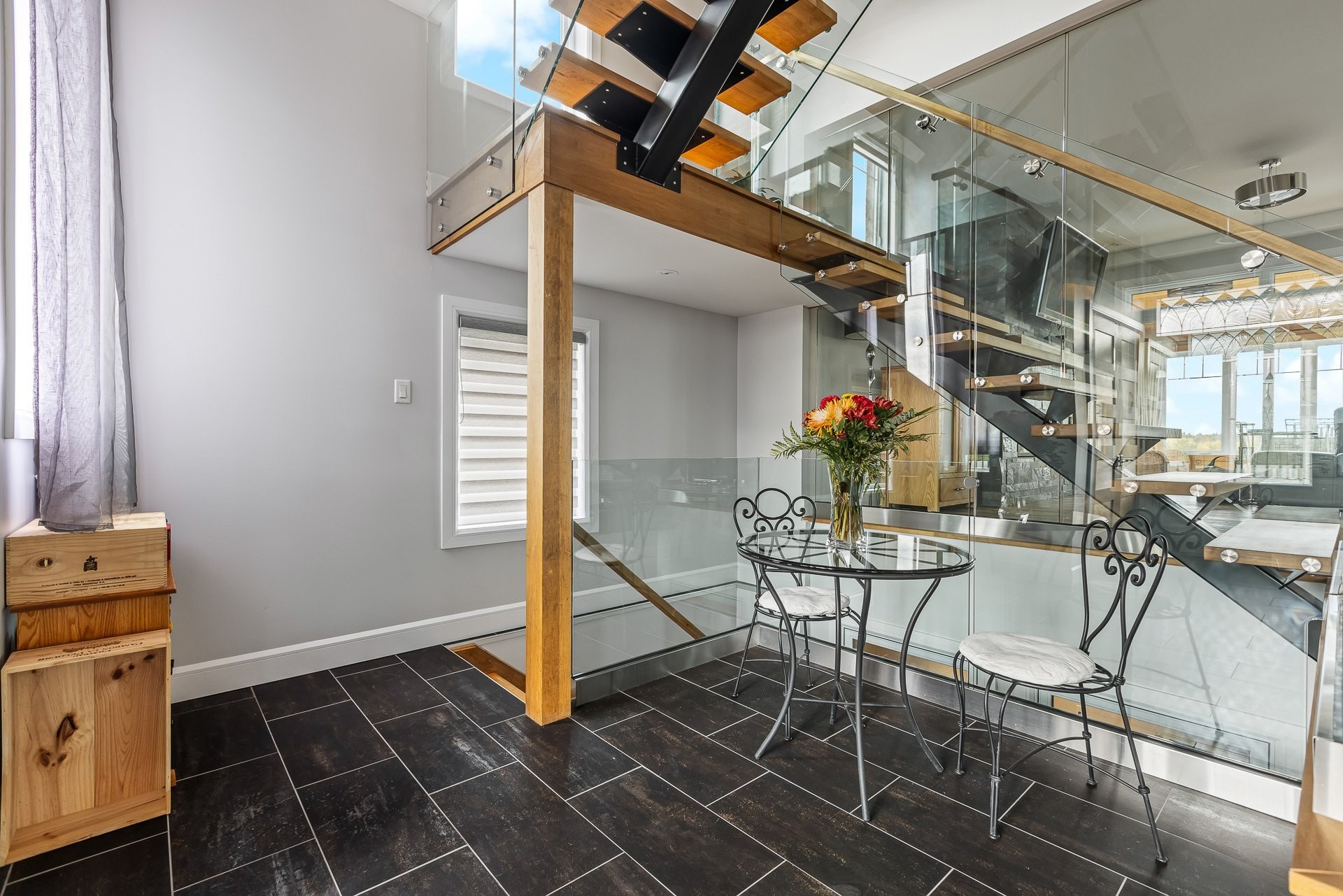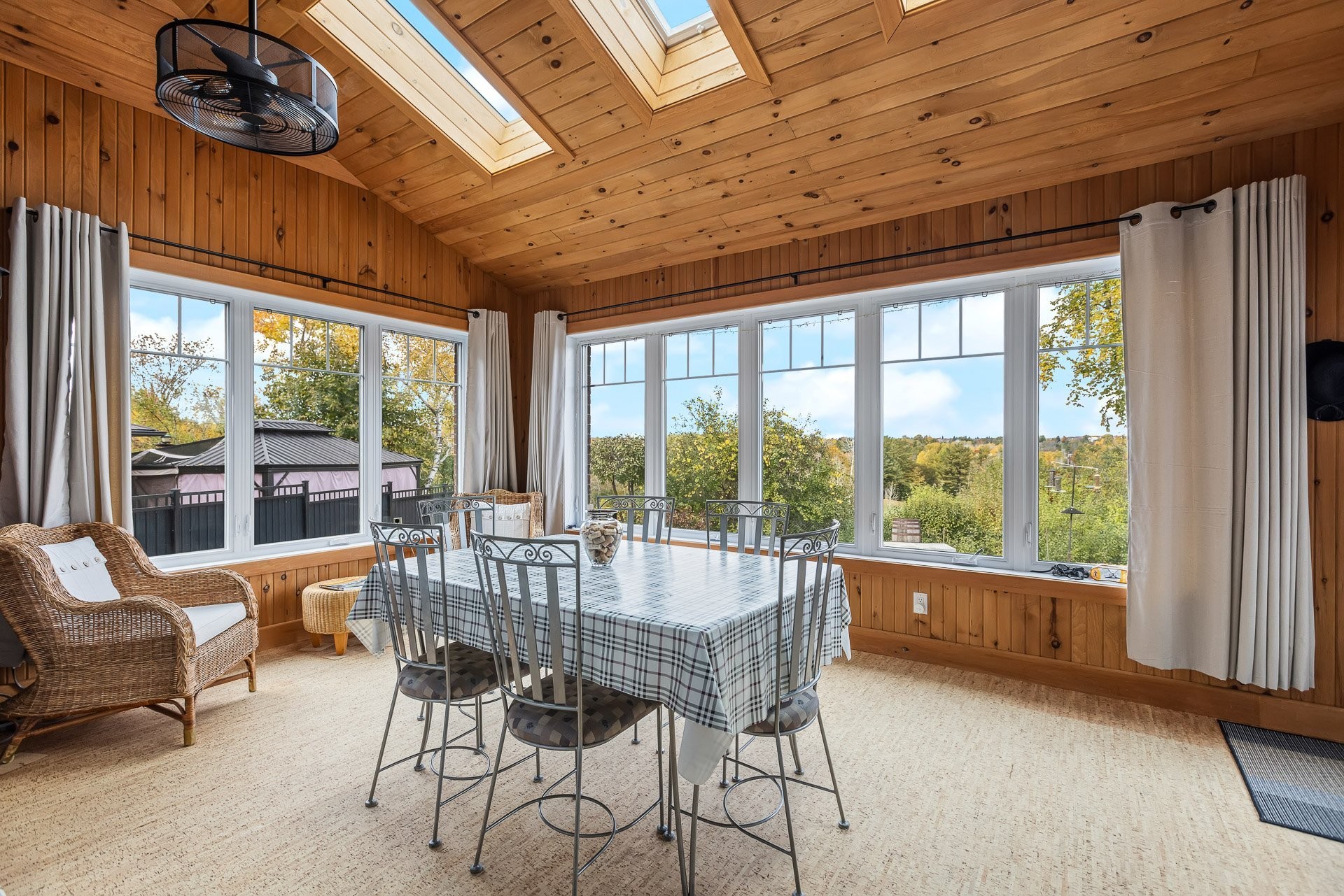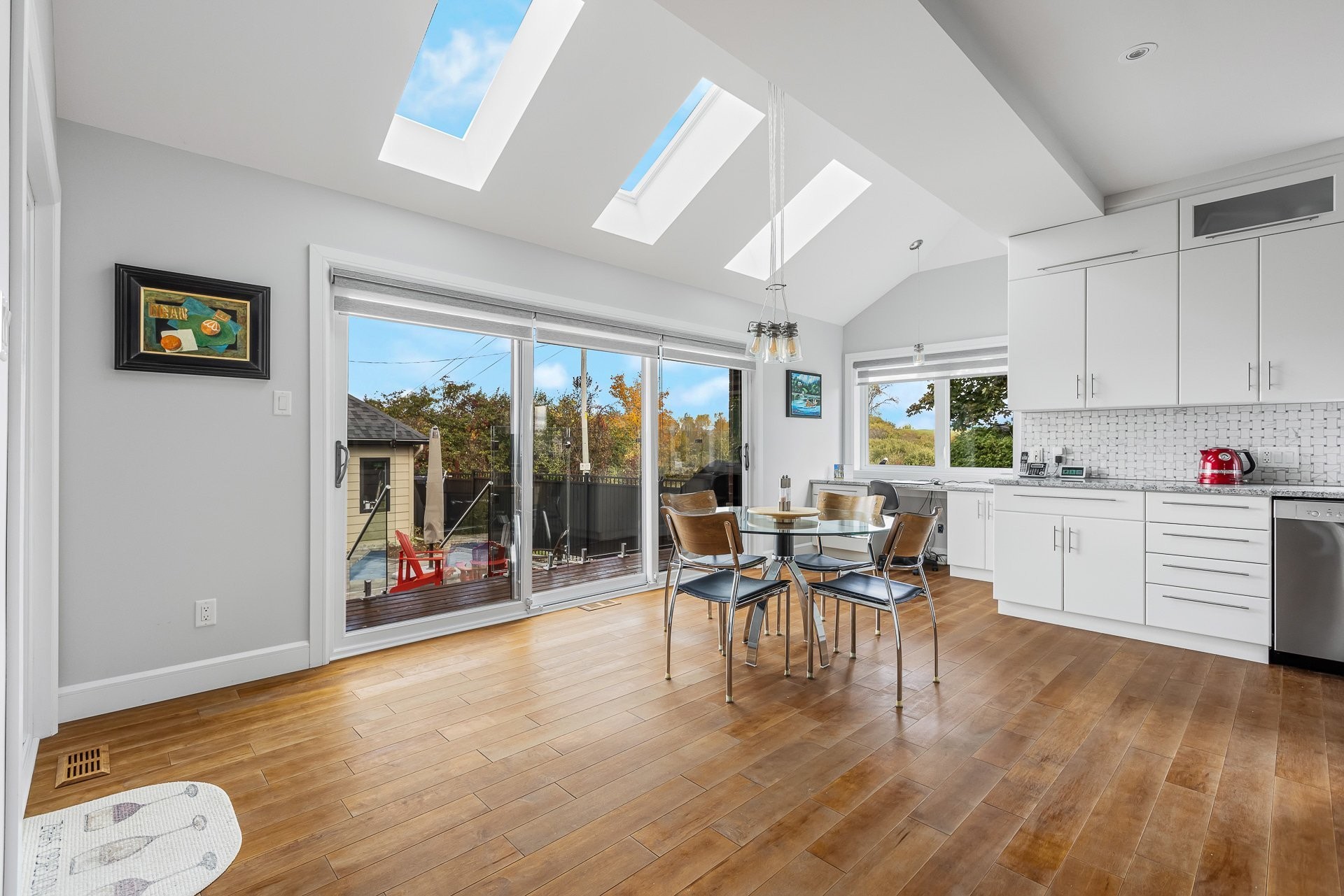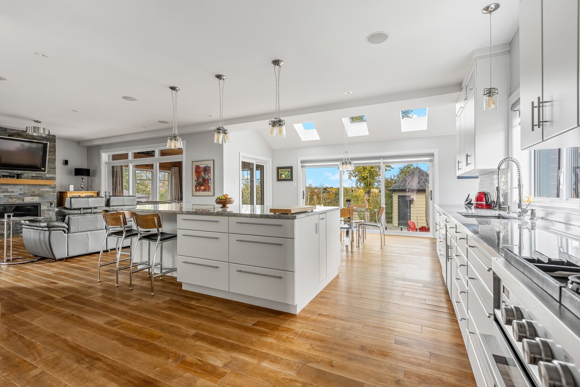 The kitchen is a true masterpiece of design with its immense central island that can accommodate several guests, its numerous cabinets offering maximum storage, and its dining area featuring a skylight and a door opening onto the backyard. The adjacent dining room perfectly completes this welcoming and sophisticated space.
