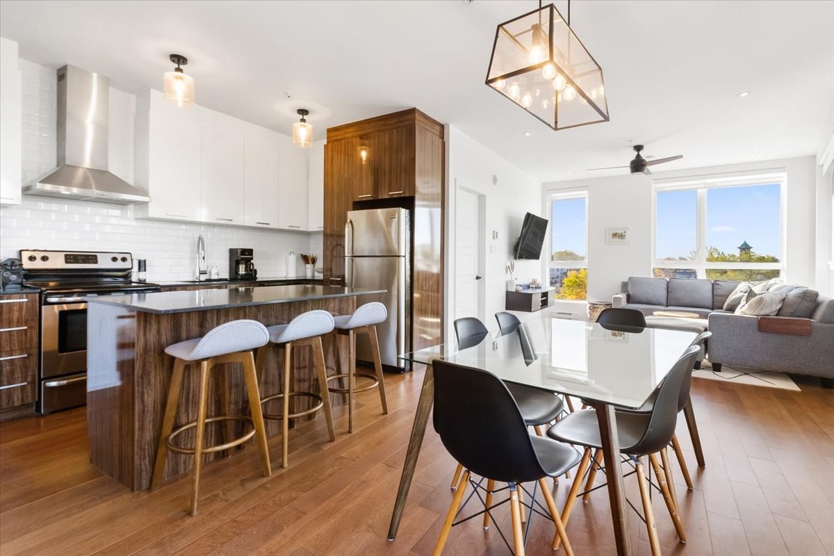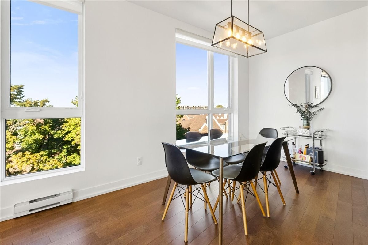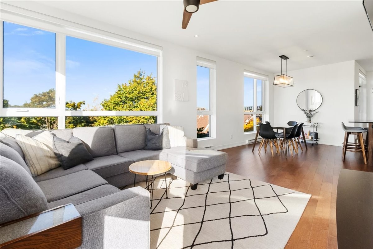 Ce lumineux condo de coin au rez-de-chaussée offre des plafonds de 9 pieds, un espace à aire ouverte et de grandes fenêtres qui inondent cha...