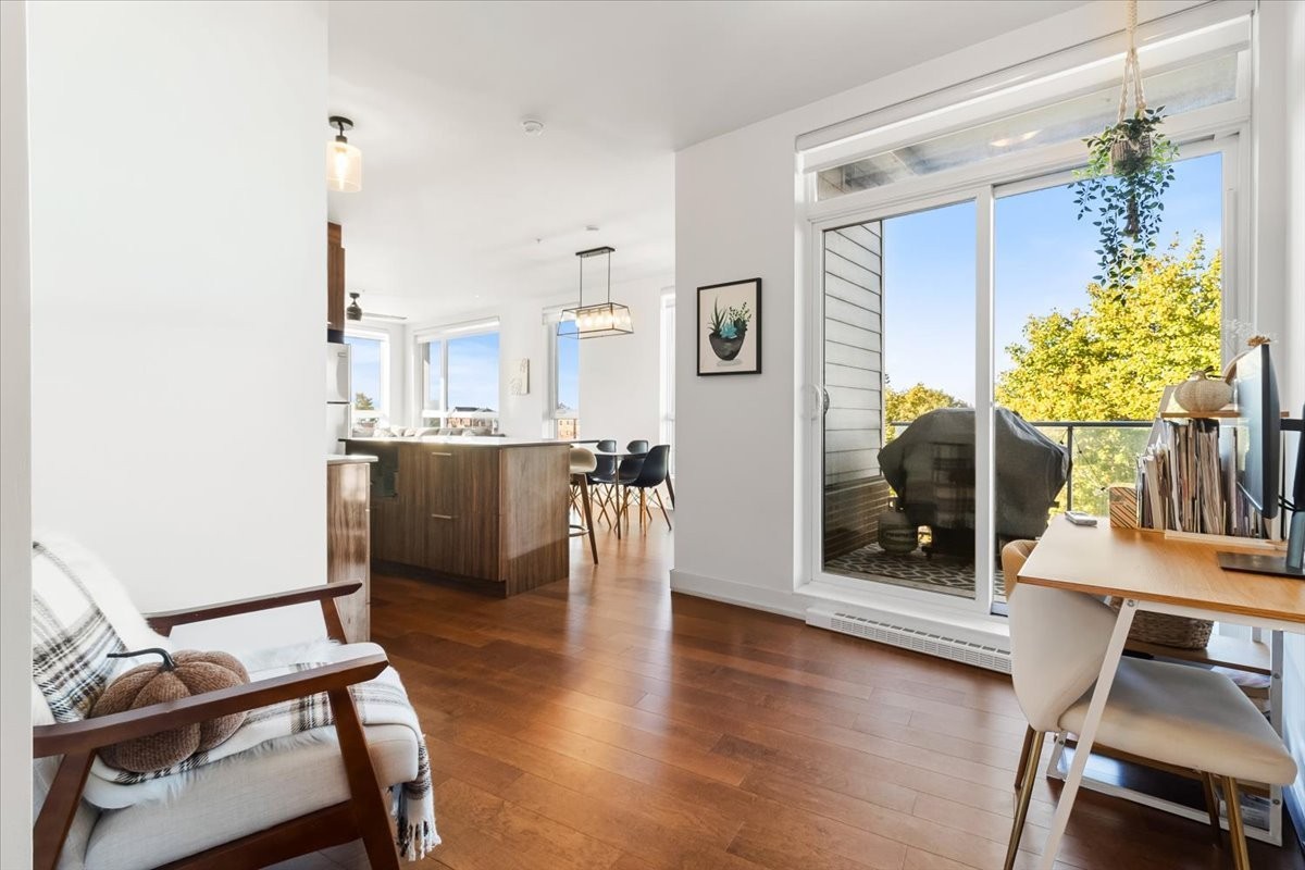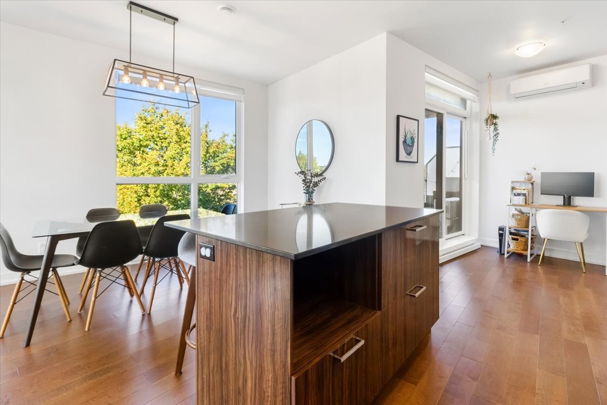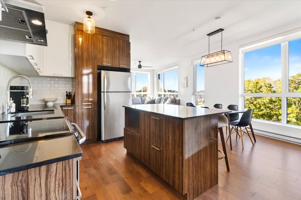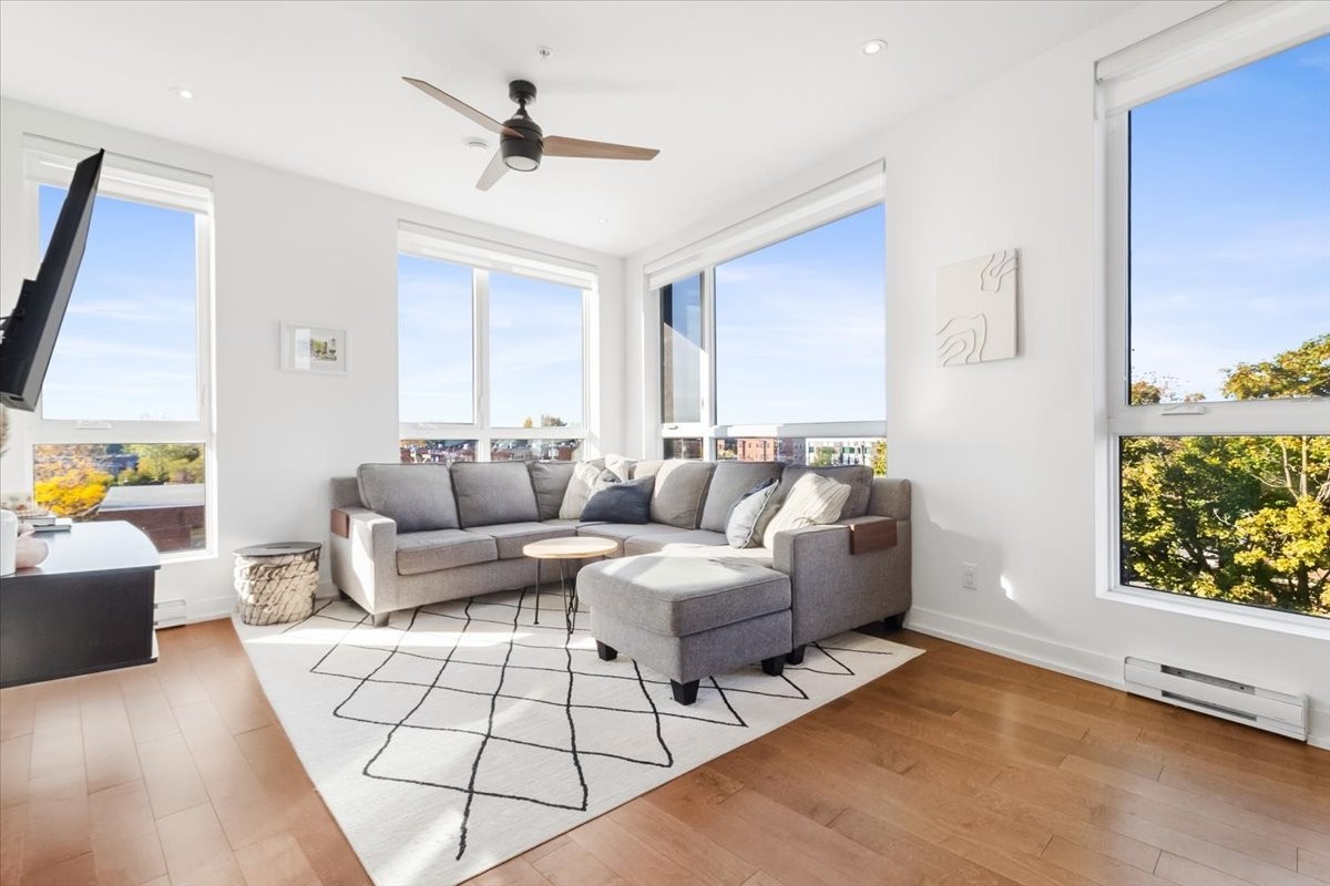 Ce lumineux condo de coin au rez-de-chaussée offre des plafonds de 9 pieds, un espace à aire ouverte et de grandes fenêtres qui inondent cha...