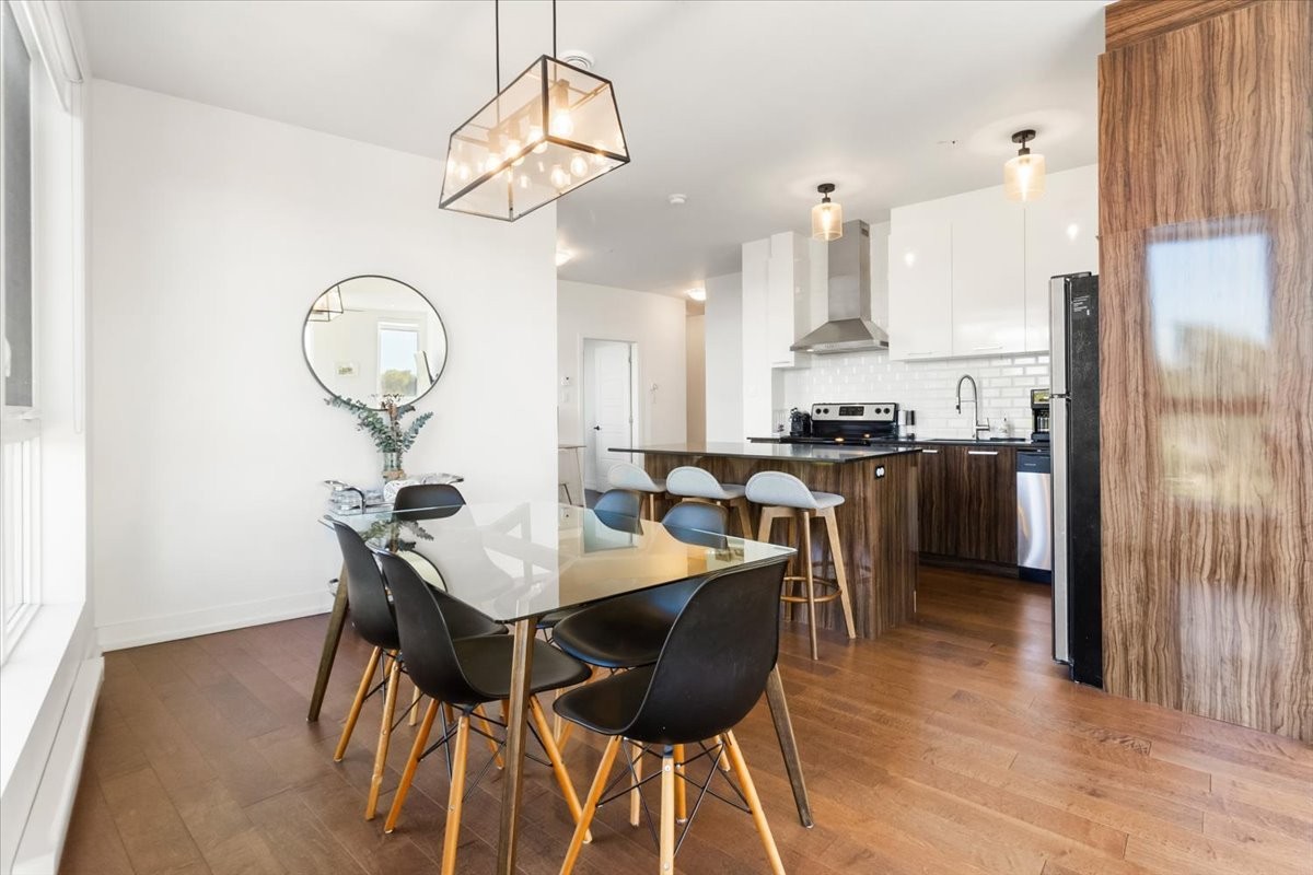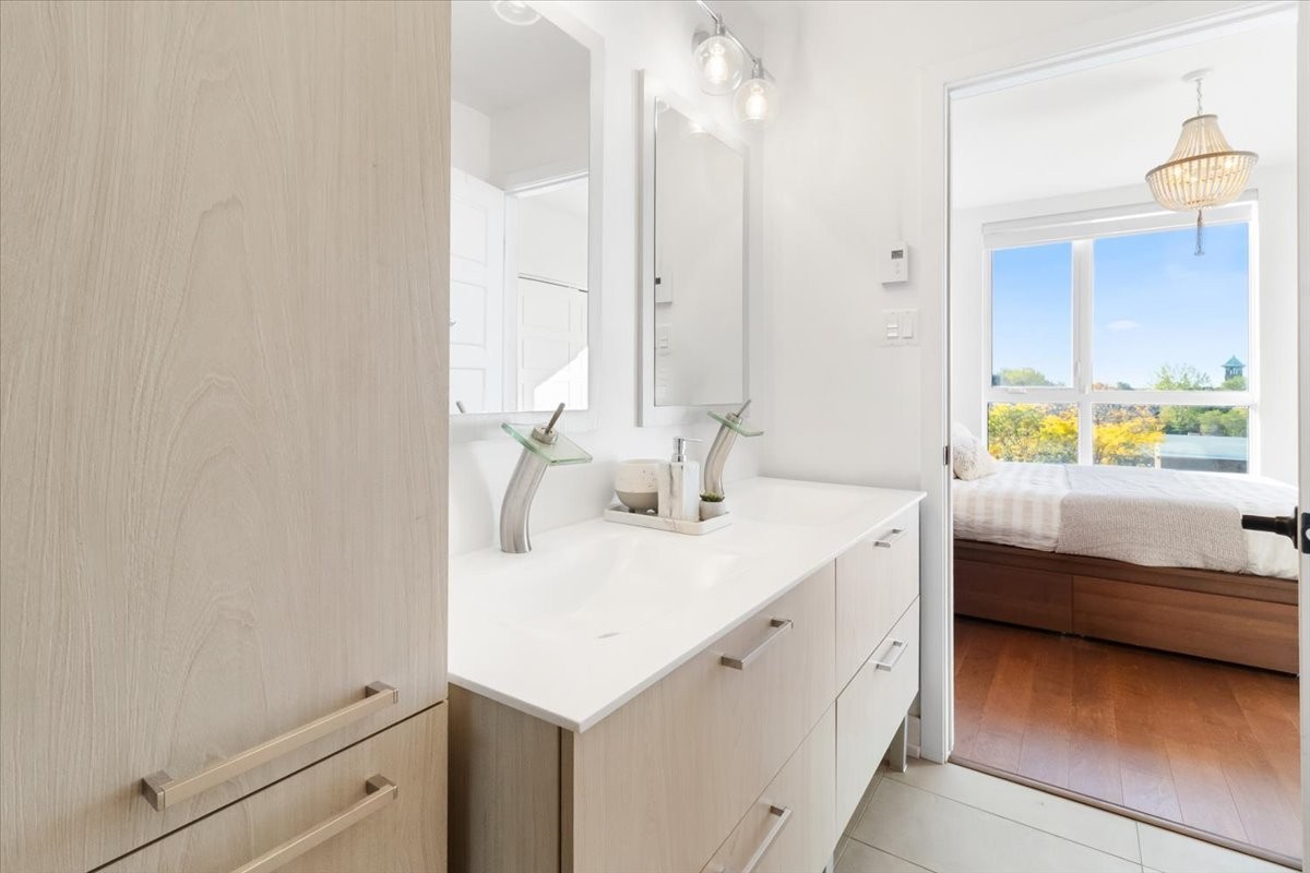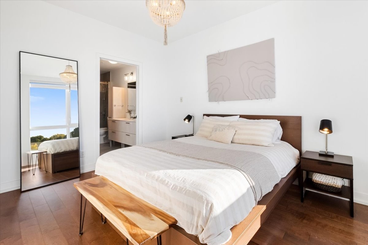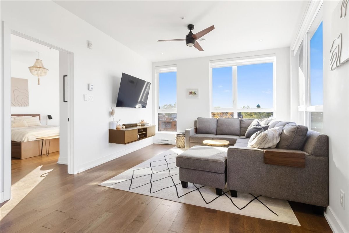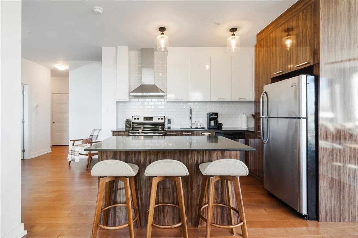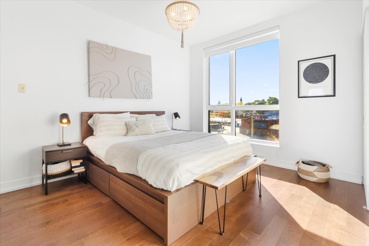 Bright & spacious 2-bed, 2-bath corner unit at Le Daly Morin Phase 3! Featuring 1,034 sq. ft., high ceilings, large windows, a modern kitchen with quartz counters, and a private balcony with southwest views. The primary bedroom includes an ensuite with double vanity and glass shower. Includes garage parking and access to a rooftop terrace. Located near the Lachine Canal, parks, shops, cafés, and transit-offering the perfect mix of nature, convenience, and community living.