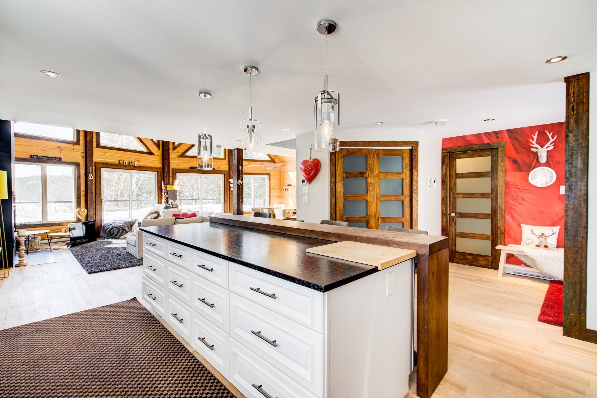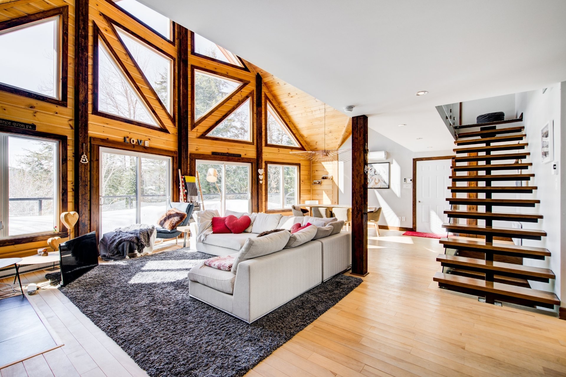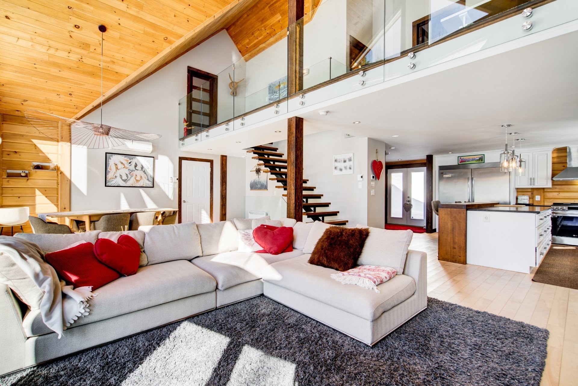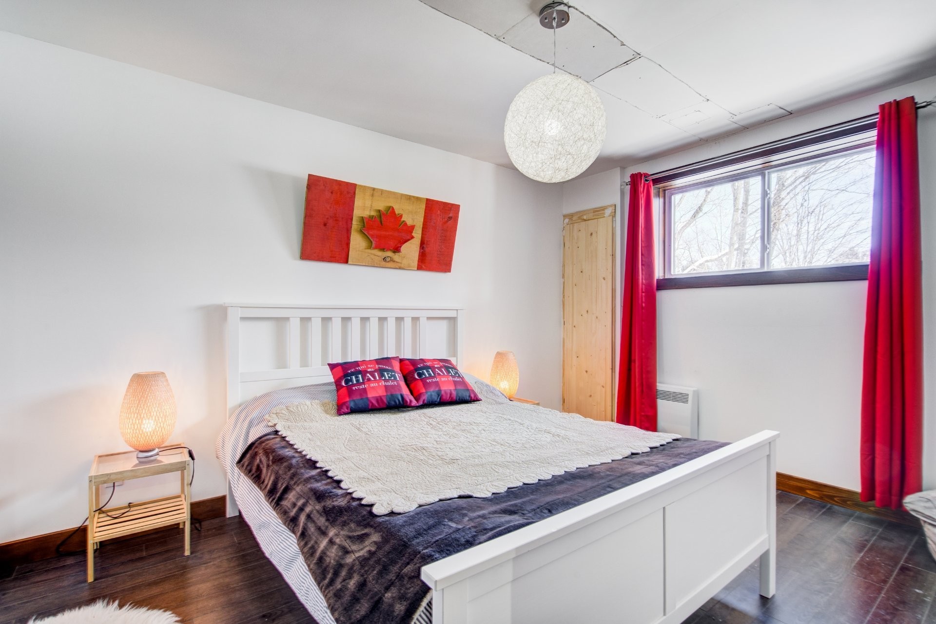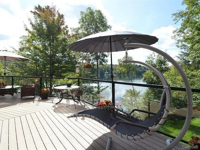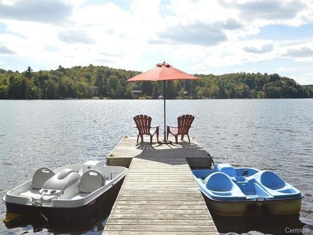 Stunning fully furnished chalet on the shore of Lac-des-Becs-Scie FORL LONG TERM RENTAL ONLY with 96 feet of private waterfront and breathtaking views. Built in 2014, it features 5 bedrooms, 4 bathrooms, and a double garage, in a peaceful location at the end of a cul-de-sac. Its bright open-concept living space includes a high-end kitchen, a living room with a wood-burning fireplace, and a three-season veranda. The garden level offers 3 bedrooms, one with access to a private terrace and spa. Private dock for boating on this navigable lake. Near Saint-Sauveur and ski slopes, luxury in nature!