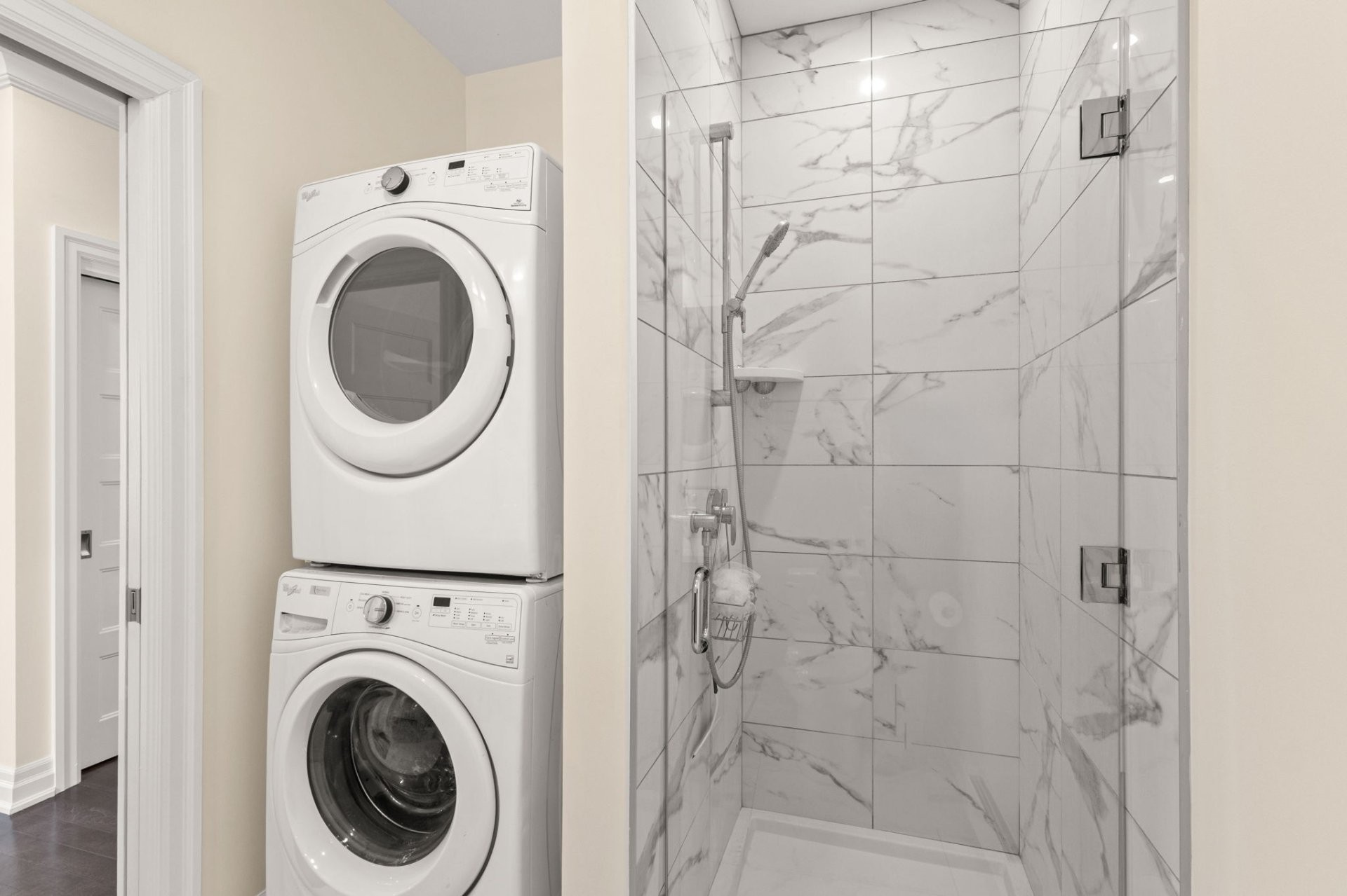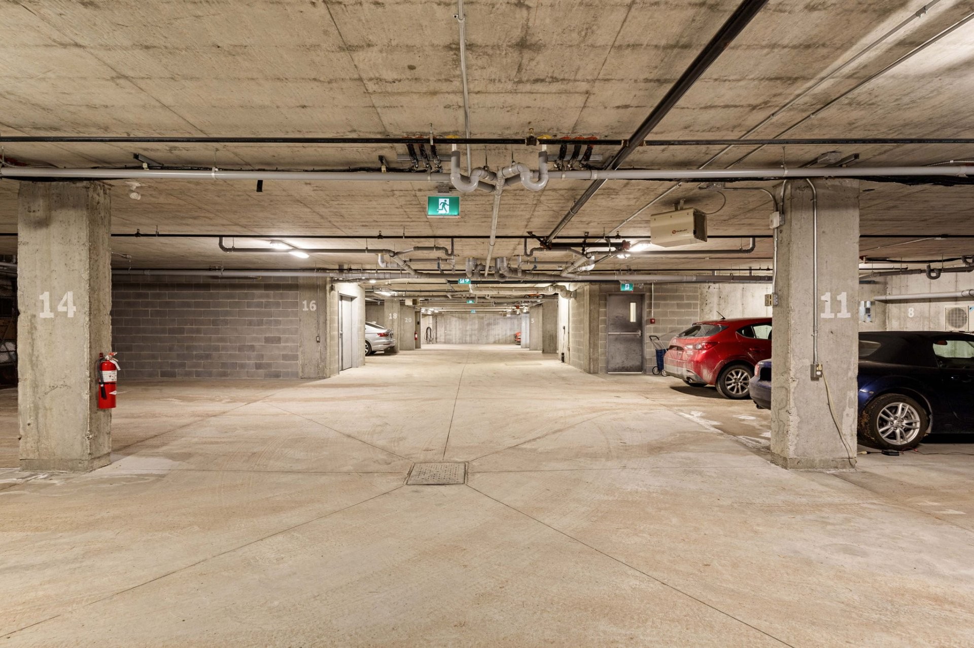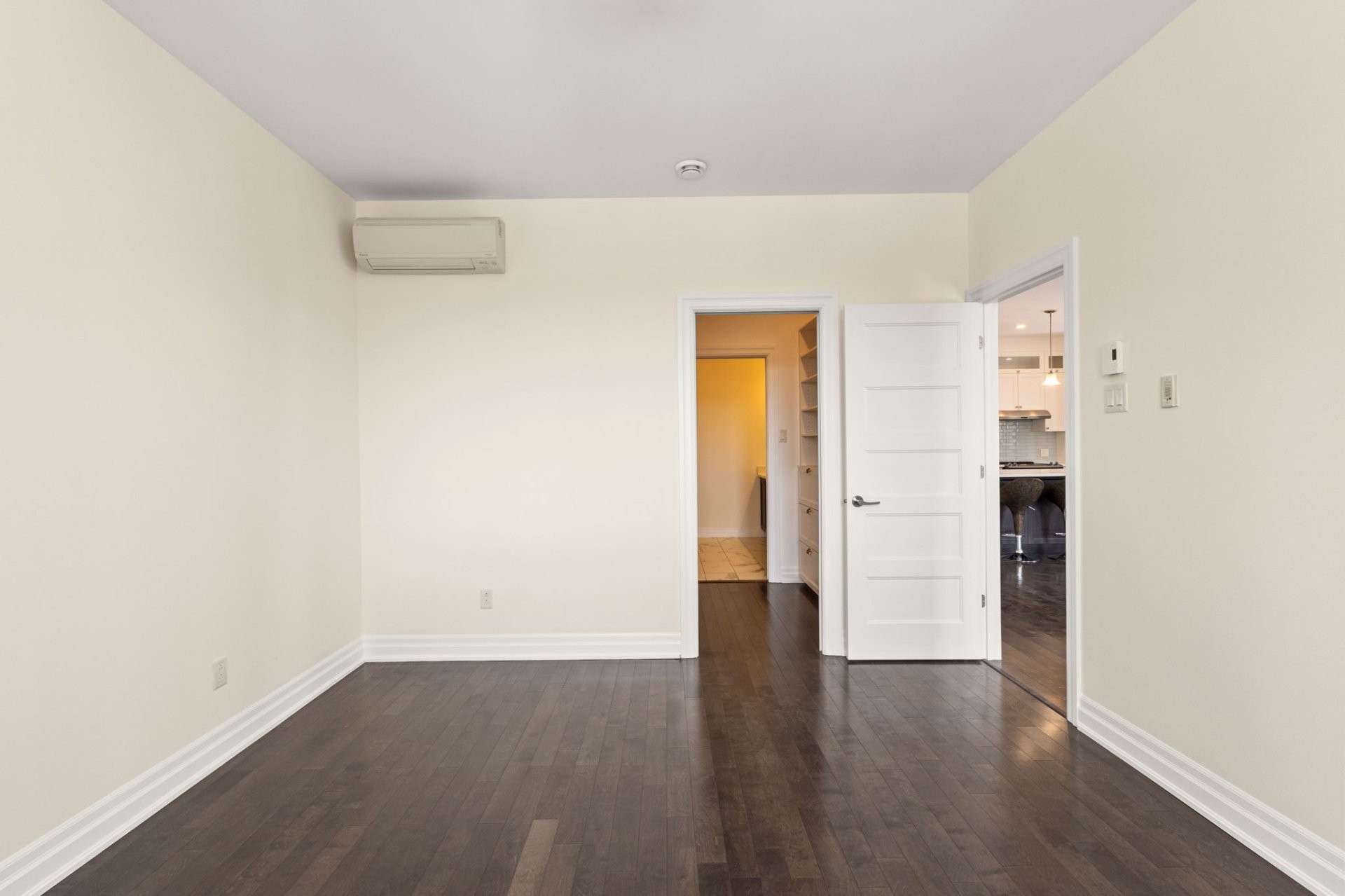 Additional features include in-unit laundry discreetly tucked away, two Daikin wall-mounted heat pumps for year-round comfort, an indoor garage space, and a storage locker.