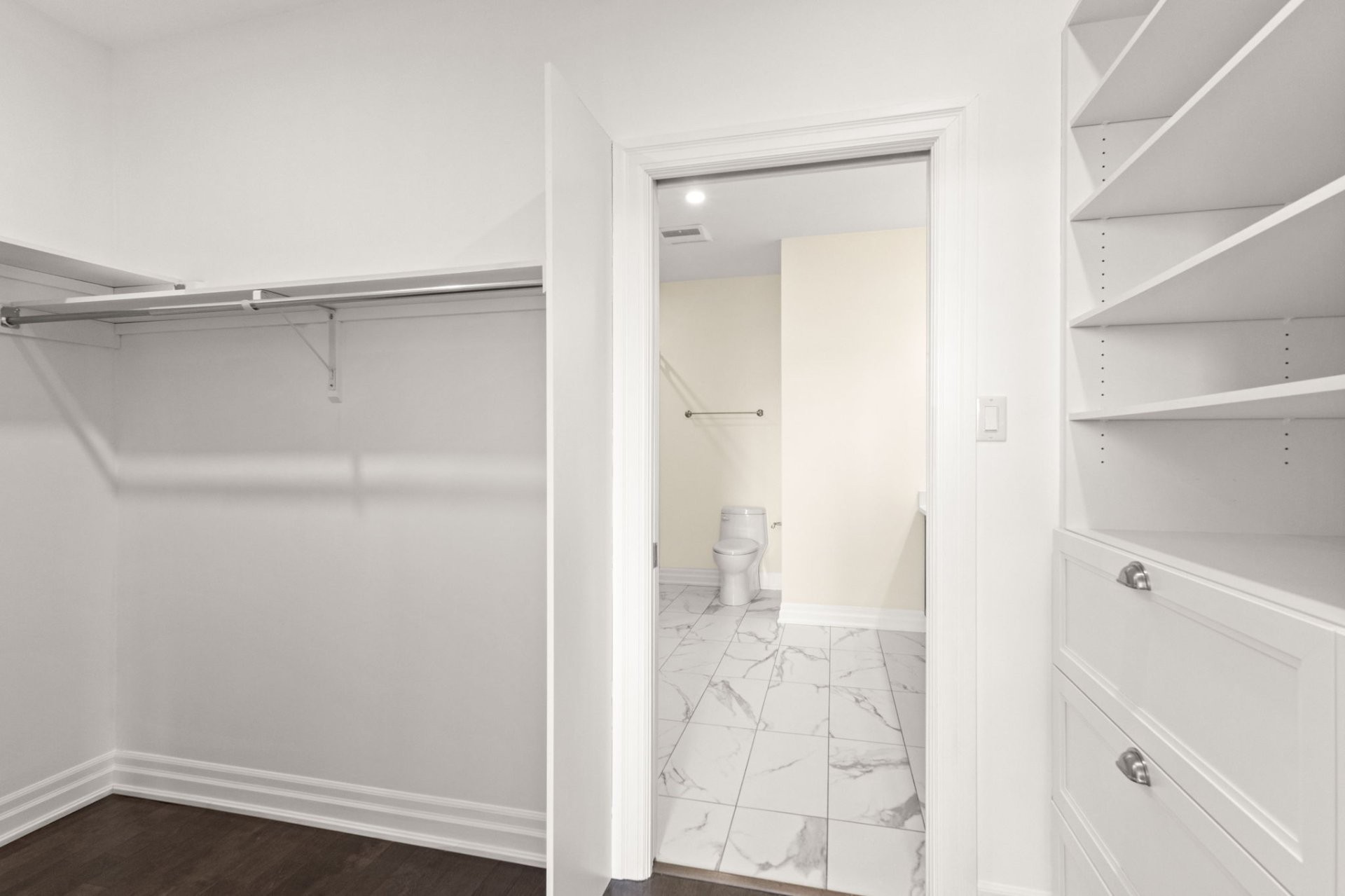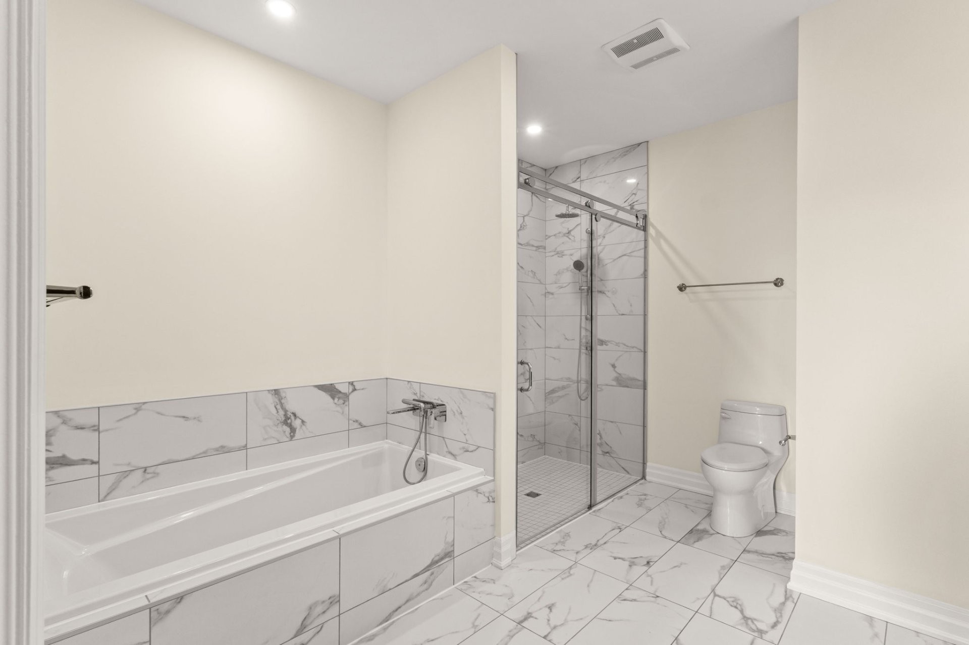 The primary suite offers a luxurious retreat with a custom walk-in closet and an ensuite bathroom featuring heated floors, a glass shower, and a separate tub. A second spacious bedroom and an additional full bathroom with glass shower provide comfort and flexibility.