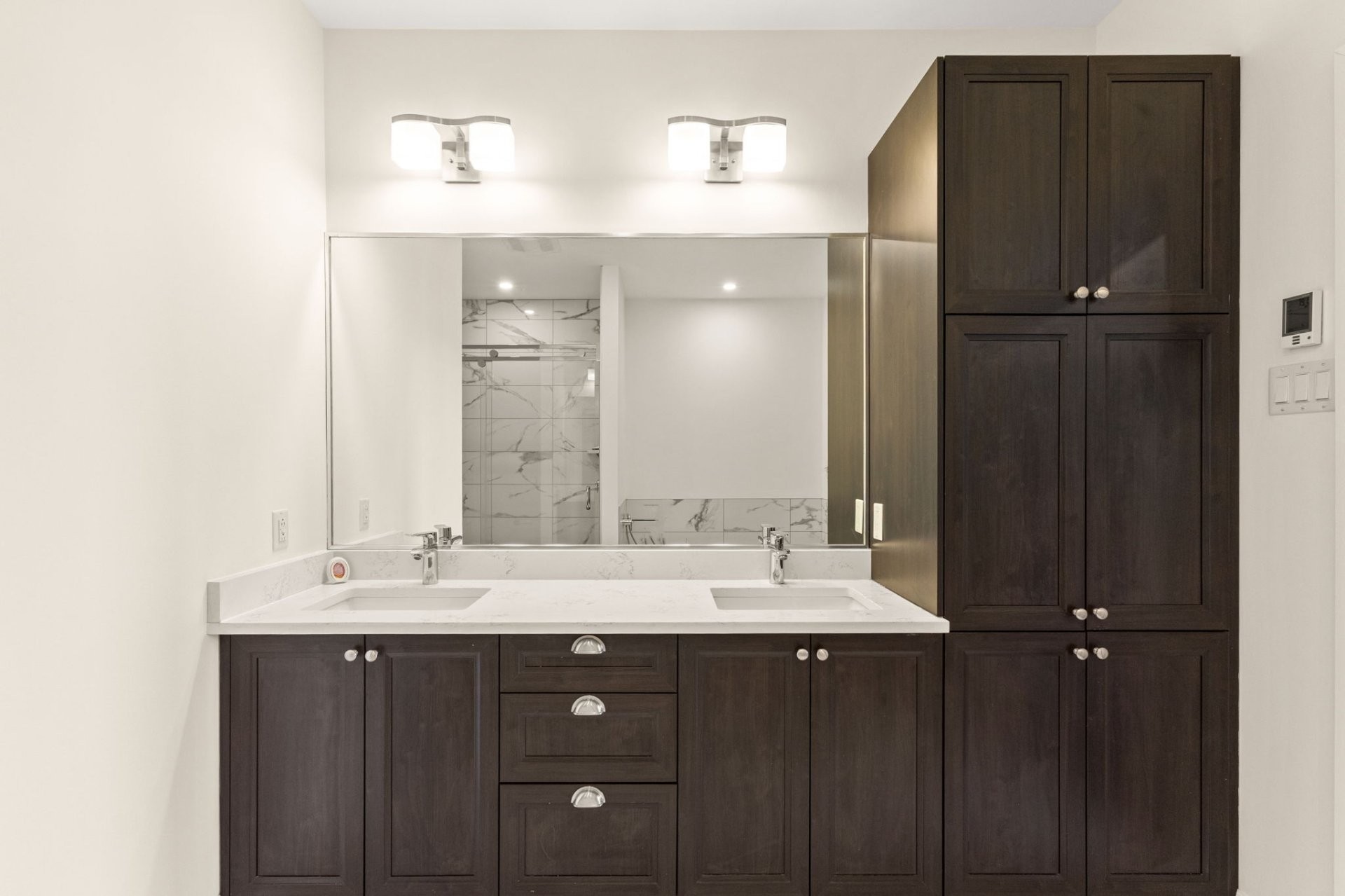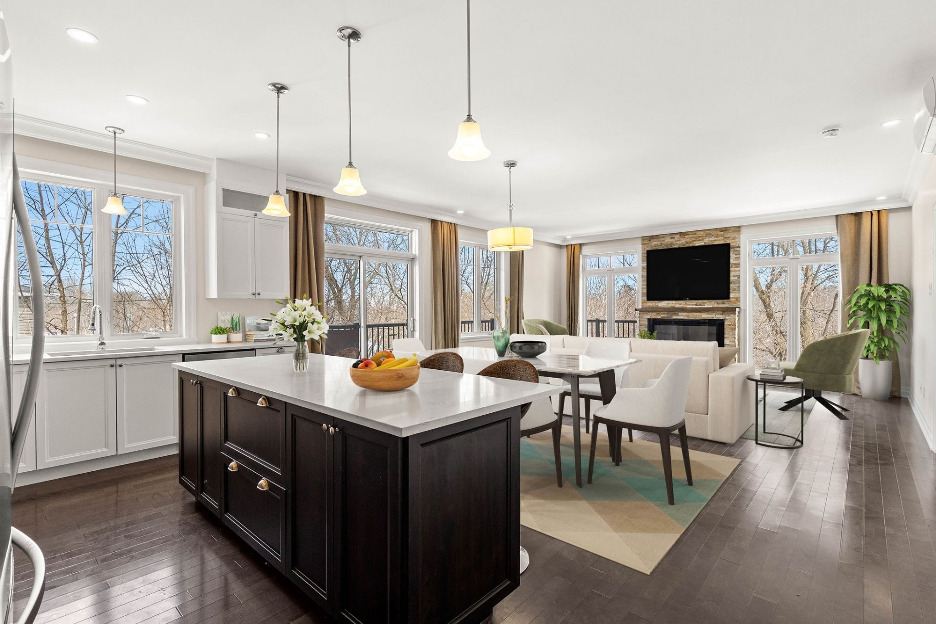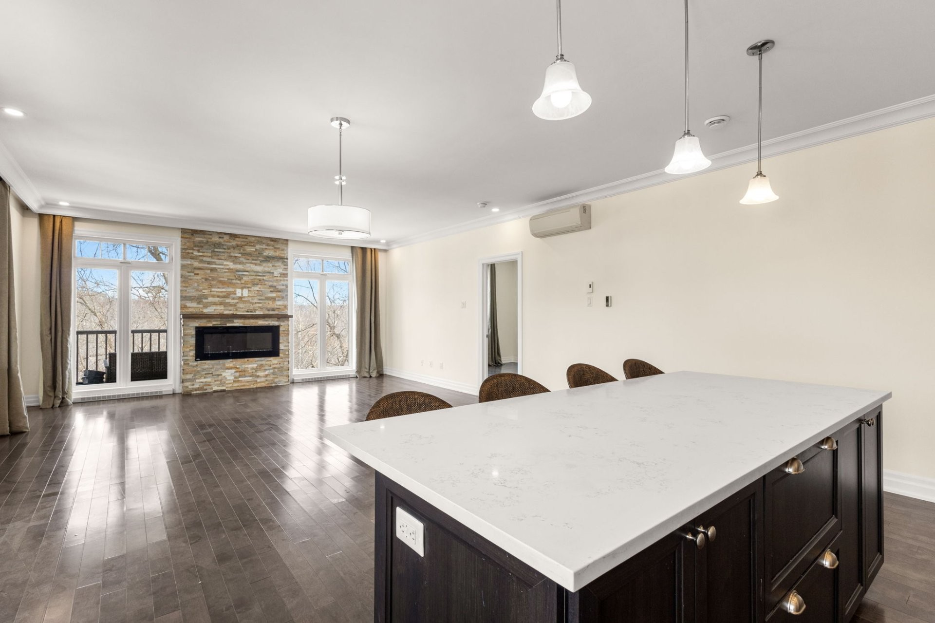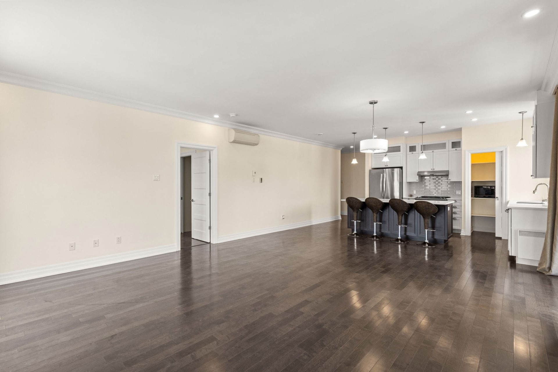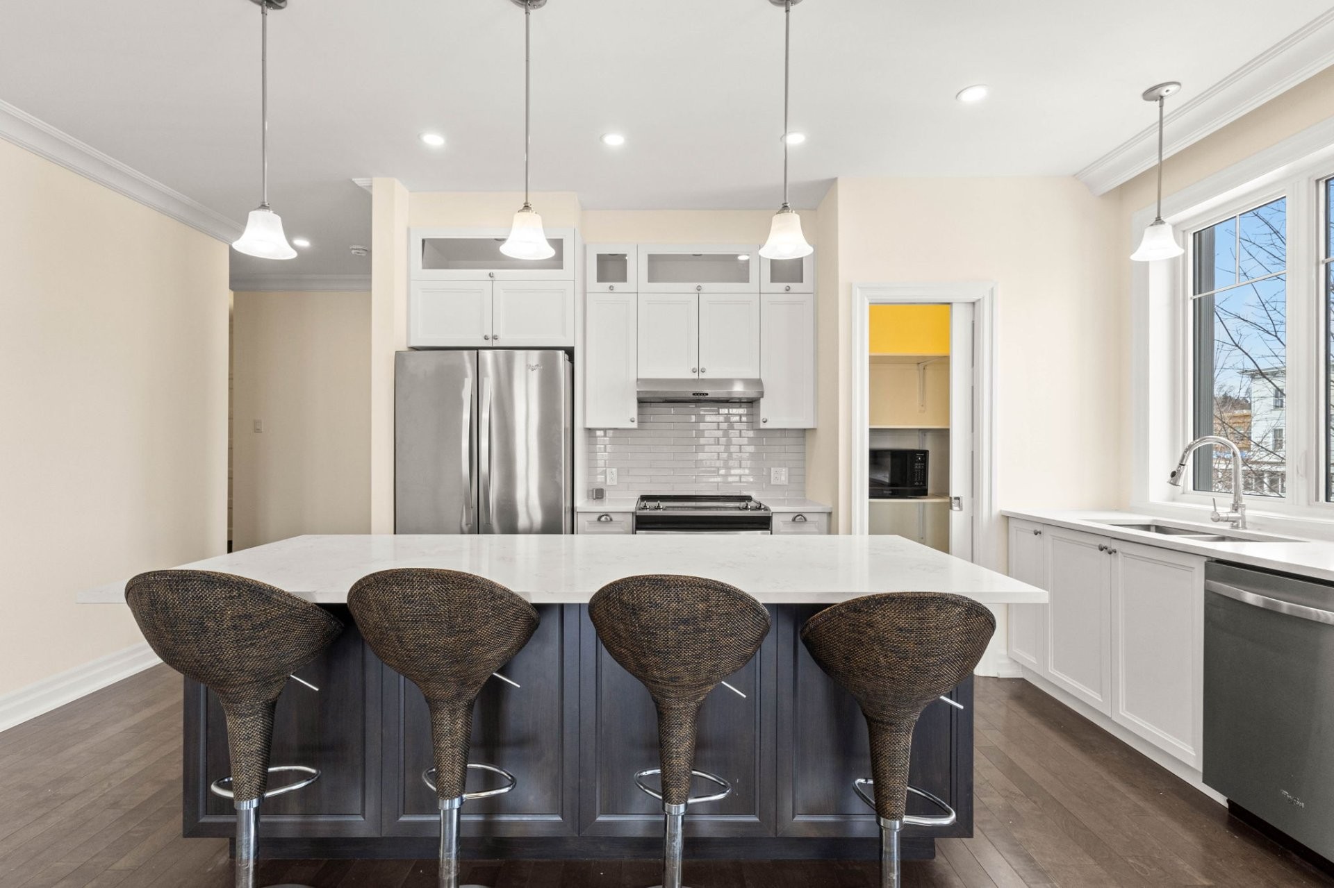 This bright and spacious unit features a high-end kitchen designed for both style and functionality, with full-height cabinetry, quartz countertops, a large central island with breakfast seating, double sink, walk-in pantry, and stainless steel appliances.