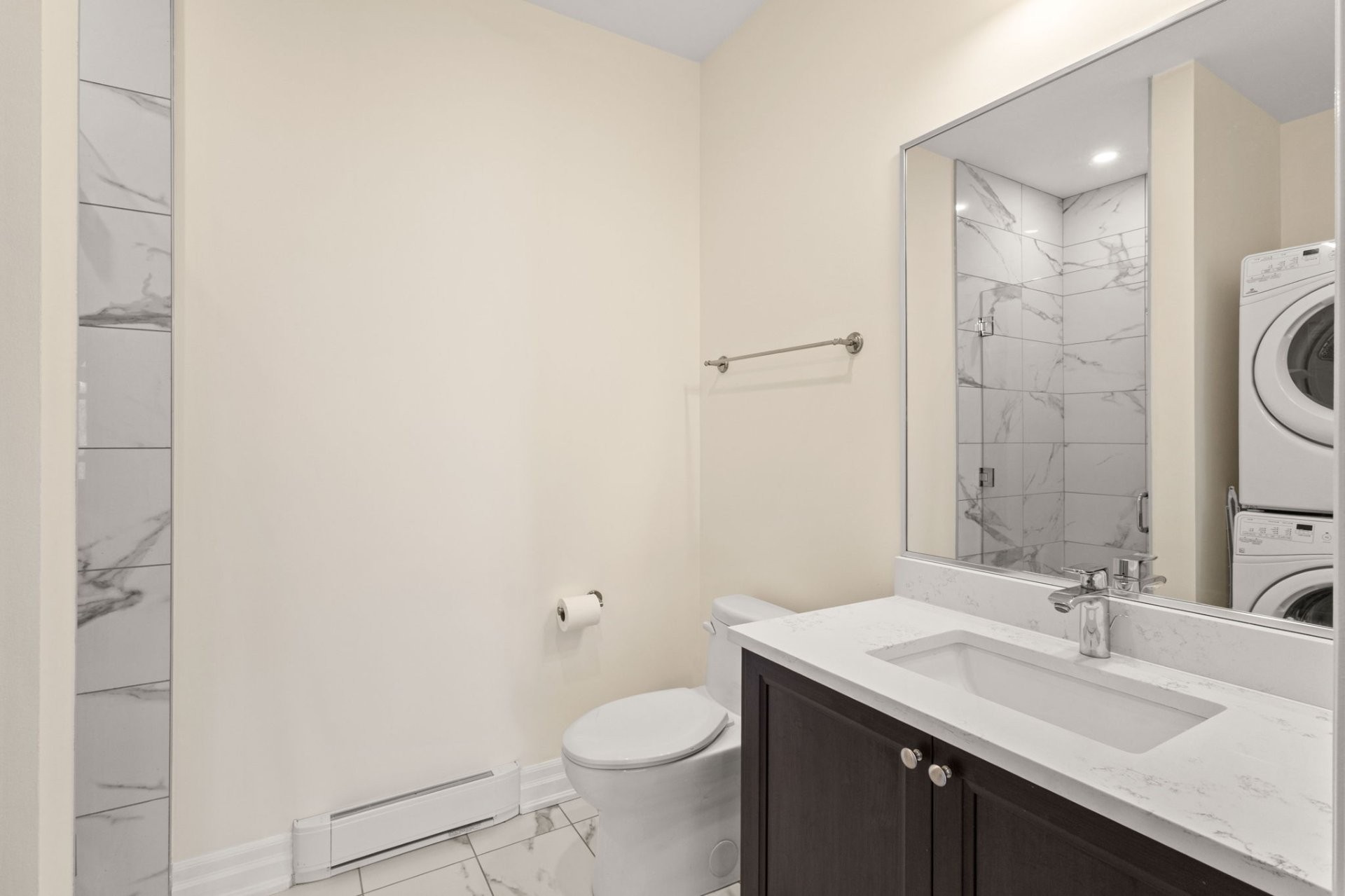Discover this elegant 1,285 SF open-concept condo in prestigious Hudson Gables, located in the heart of Hudson Village. Bright and spacious, it features a high-end kitchen with quartz countertops, large island, pantry, and stainless steel appliances. Hardwood floors and refined finishes enhance the open living area, leading to a private terrace. The primary suite offers a walk-in closet and ensuite with heated floors. Includes second bedroom, full bath, in-unit laundry, garage, and storage. Steps to shops, cafés, and services.
