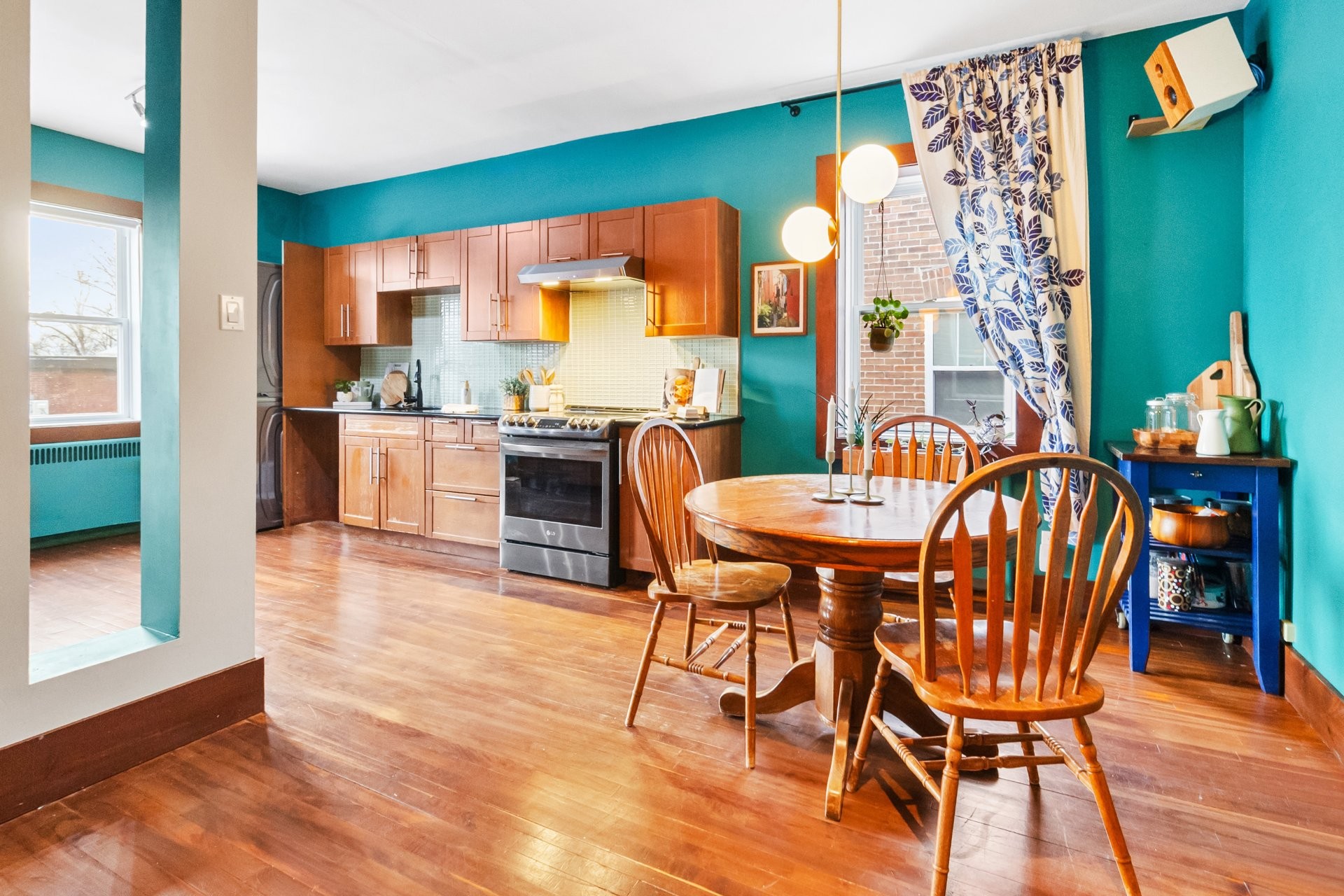 Fridge, stove, washing machine and dryer, dining room light, curtain and rods, speaker system, all decor fixed to the wall