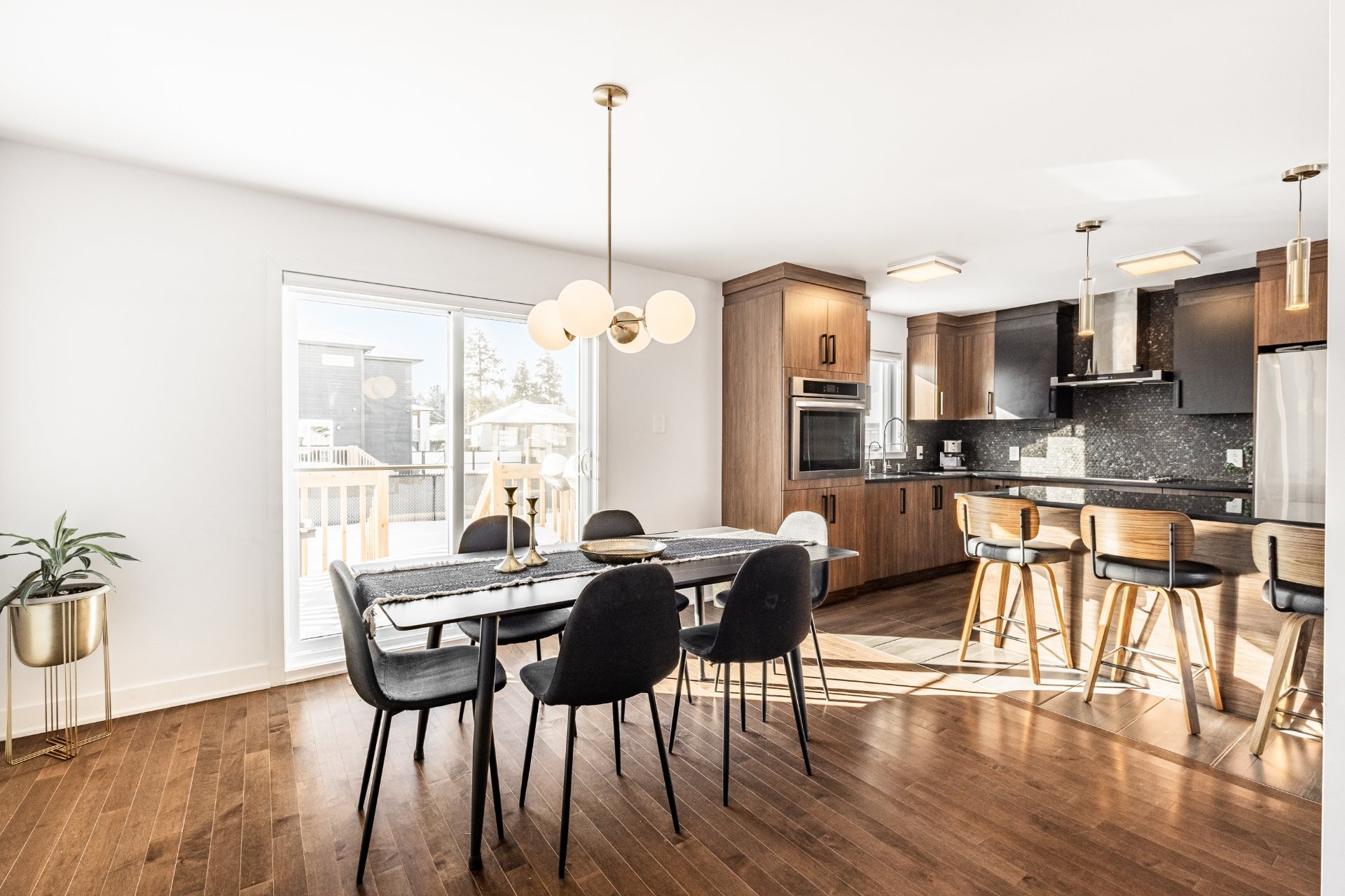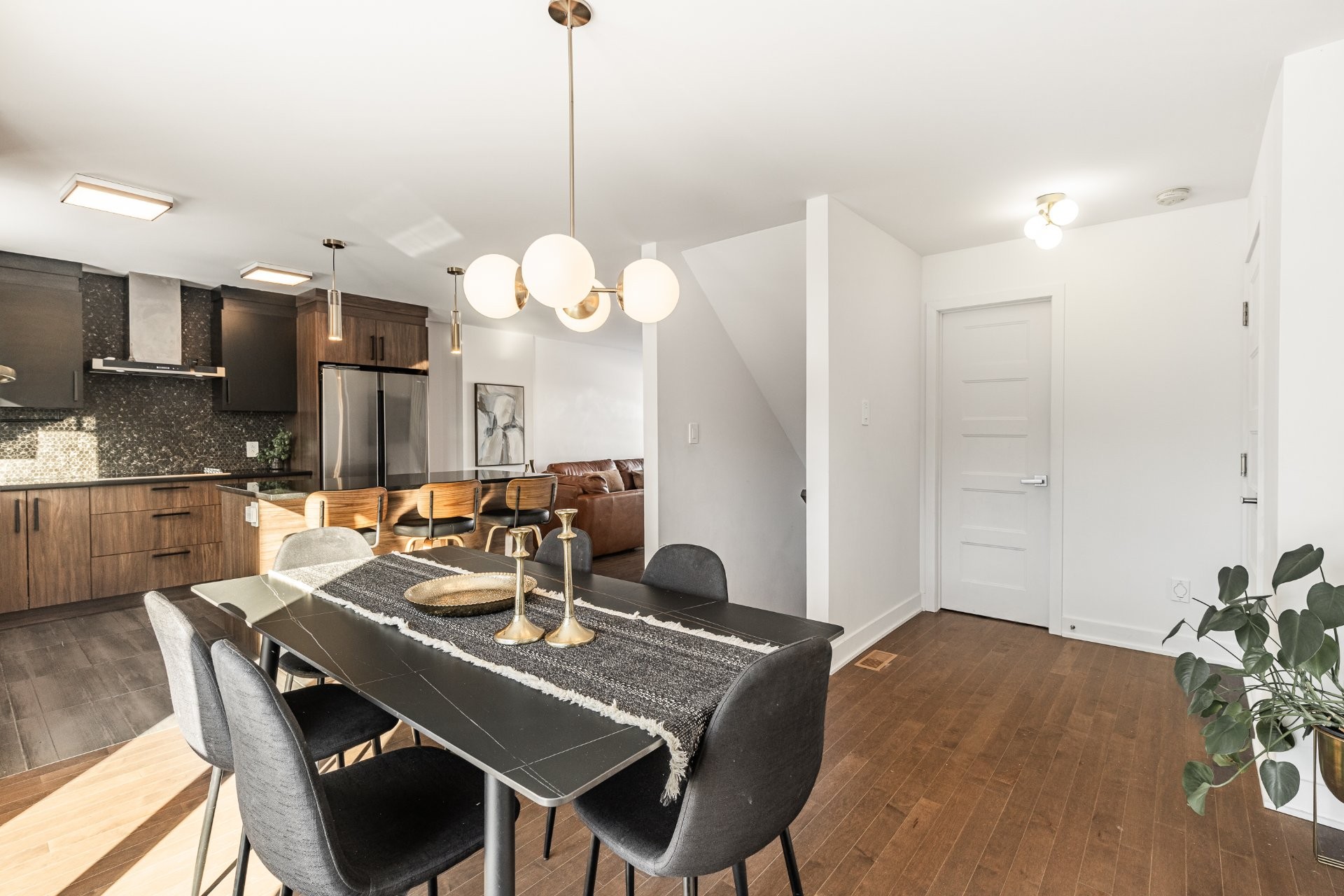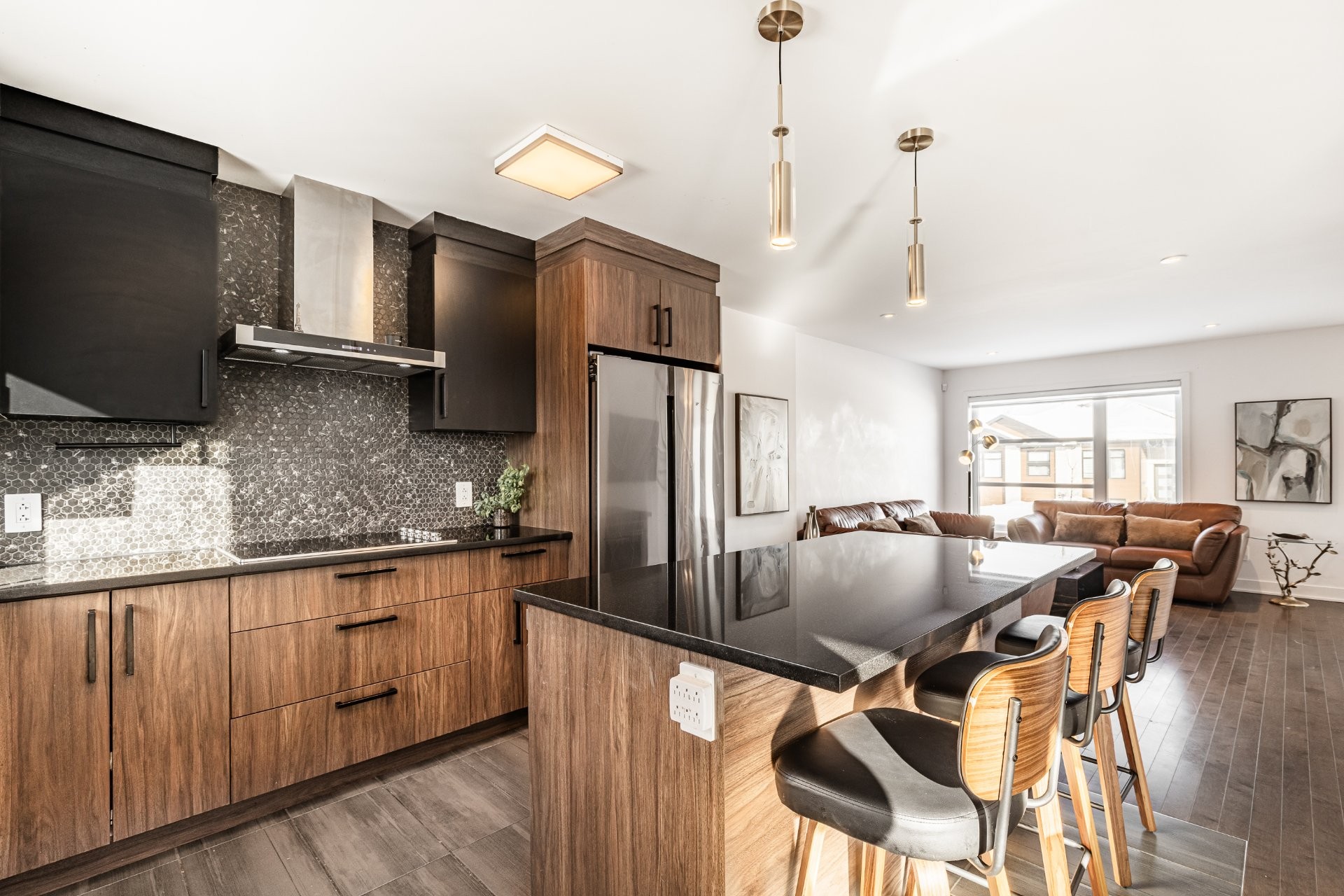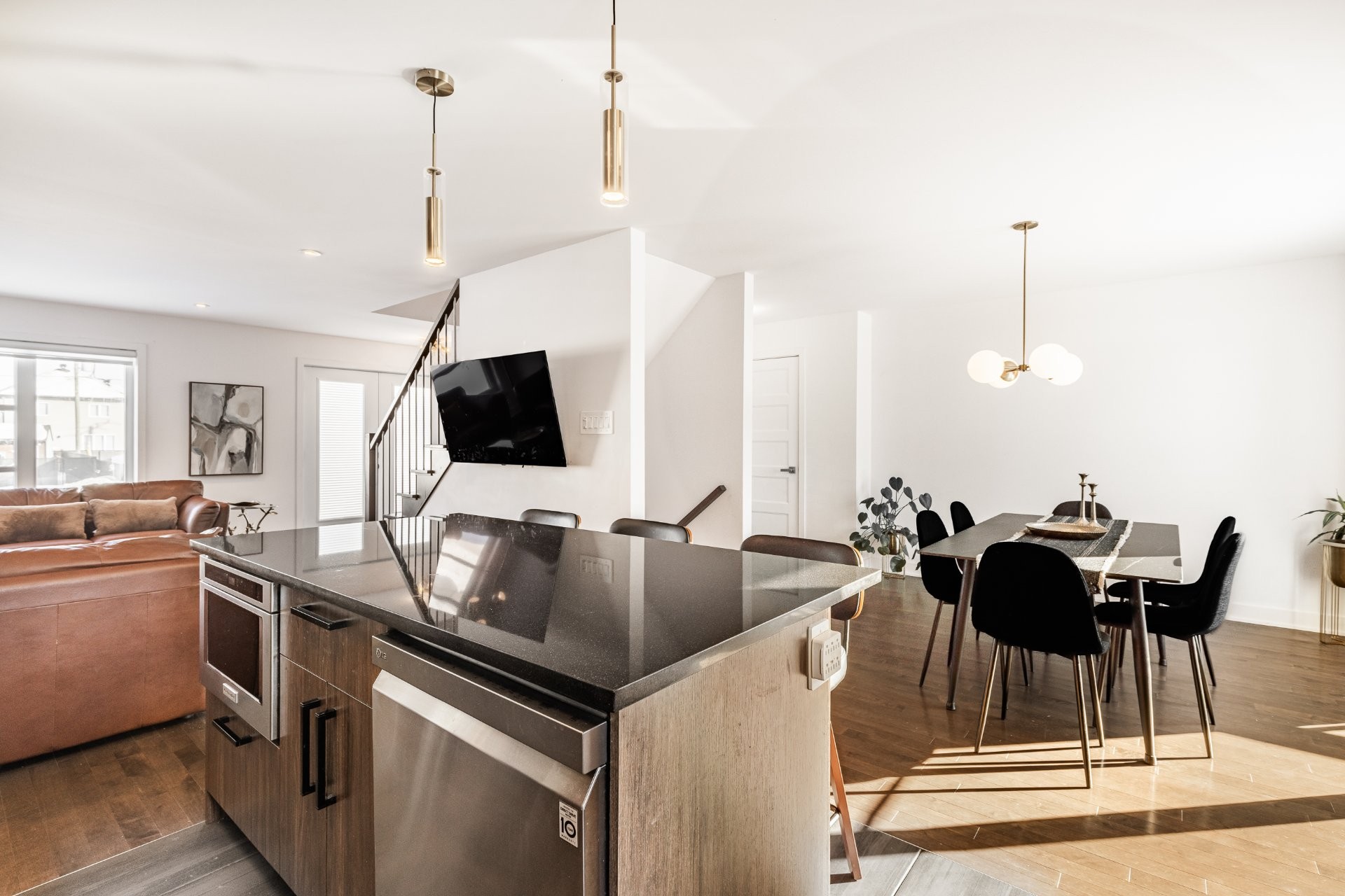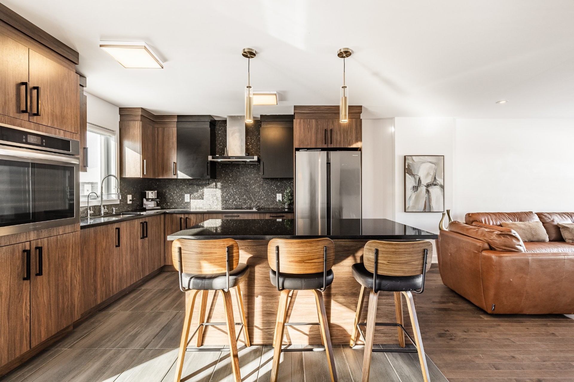 The modern kitchen offers ample cabinetry, built-in appliances and a central island with seating, providing both functionality and style.