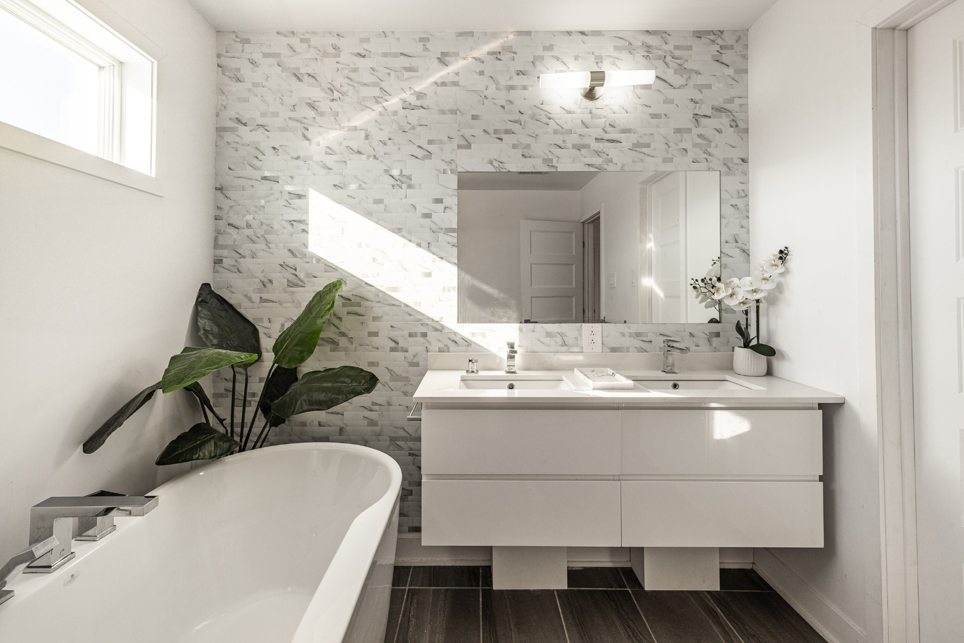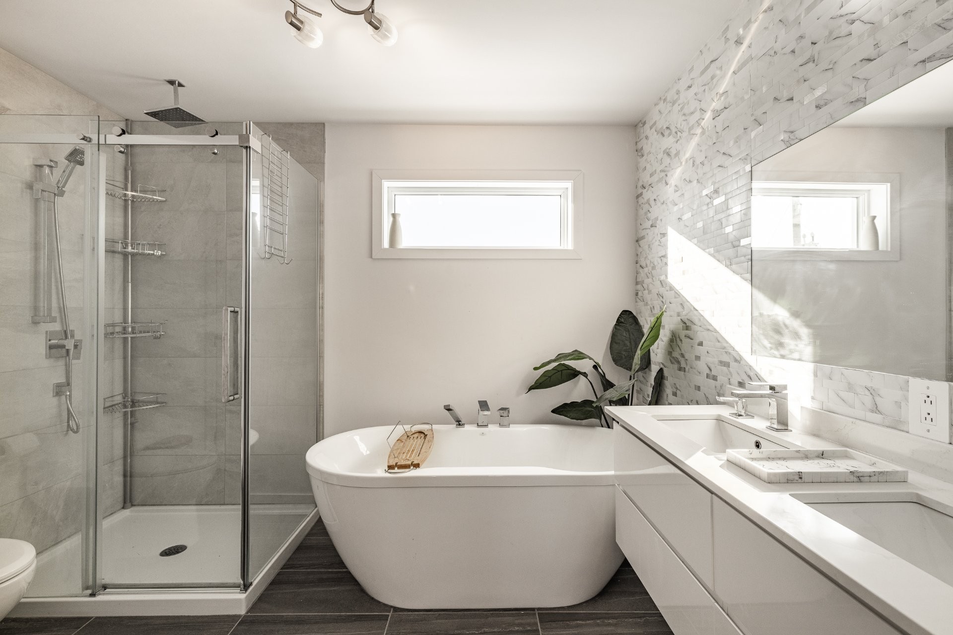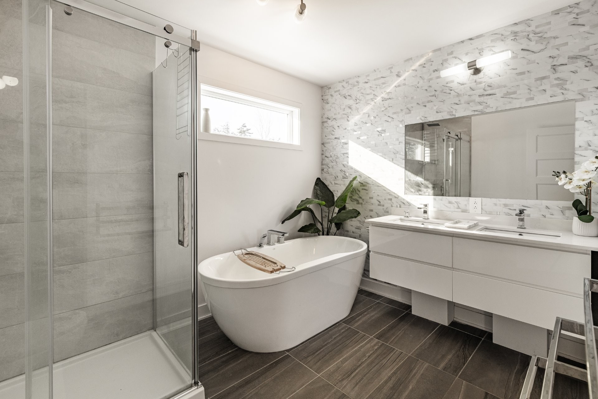The ensuite bathroom includes a glass and ceramic shower as well as a freestanding bathtub, combining style and comfort.