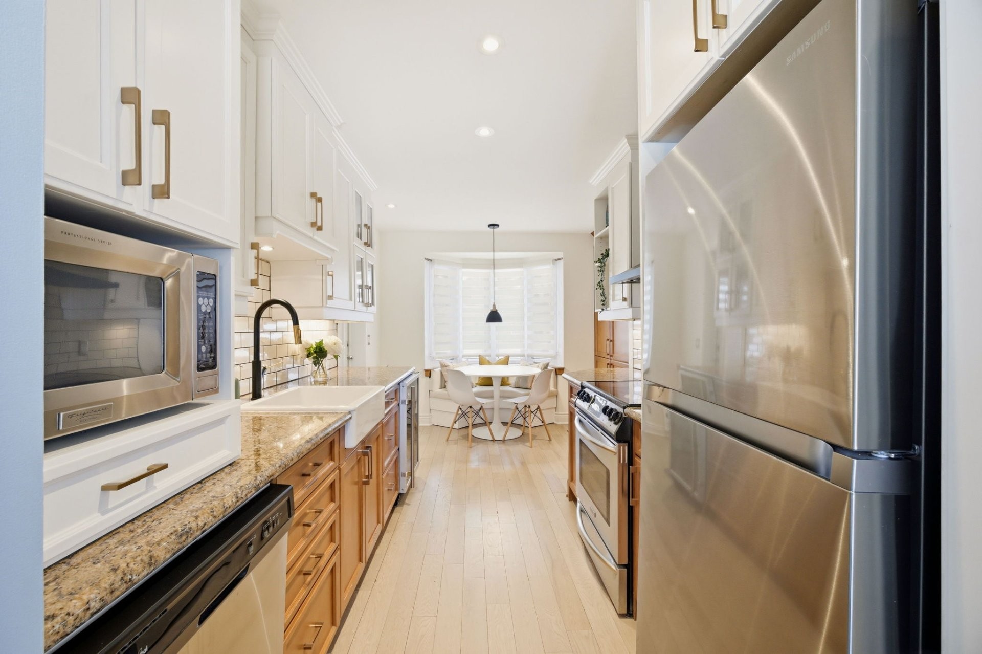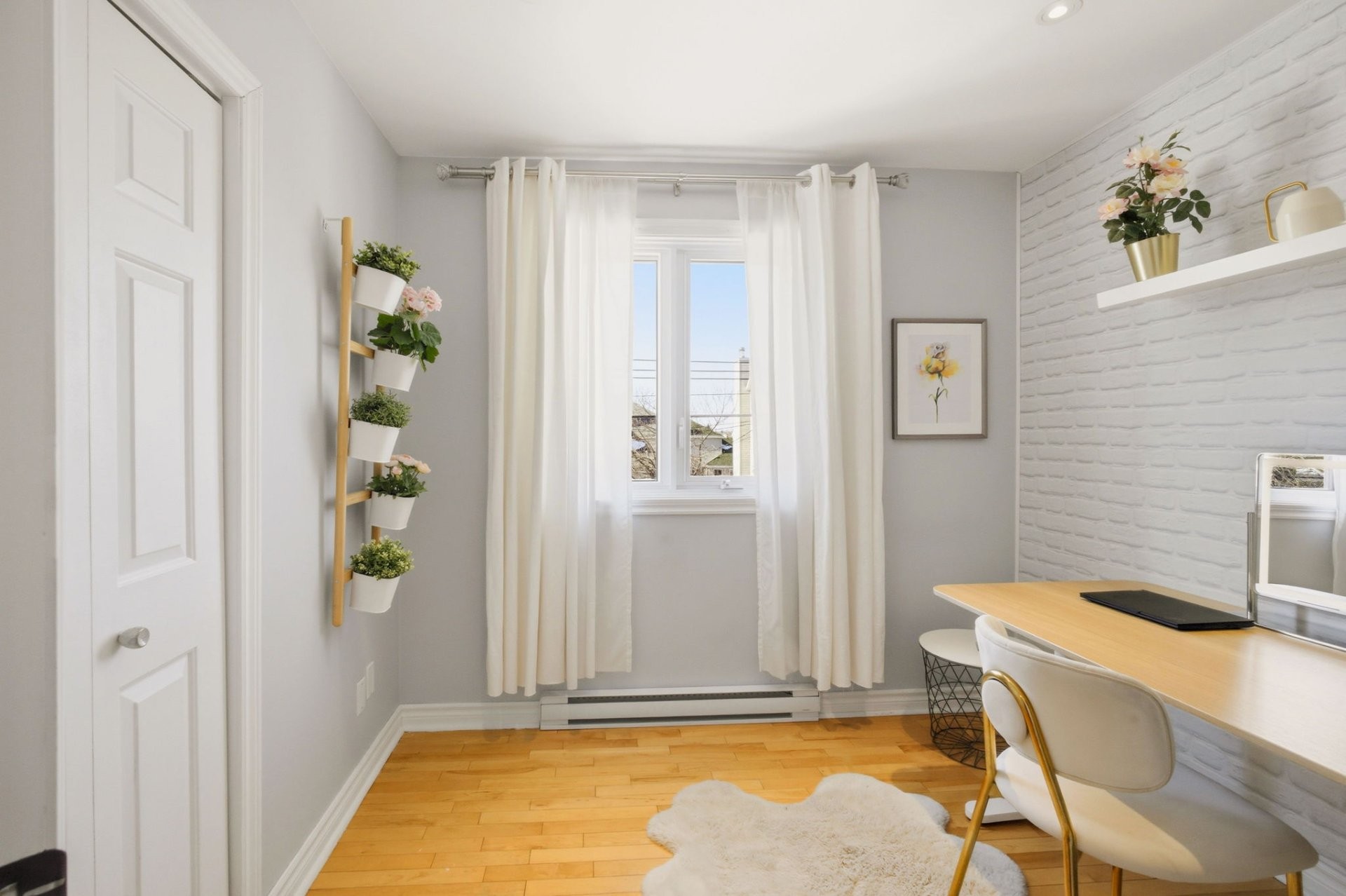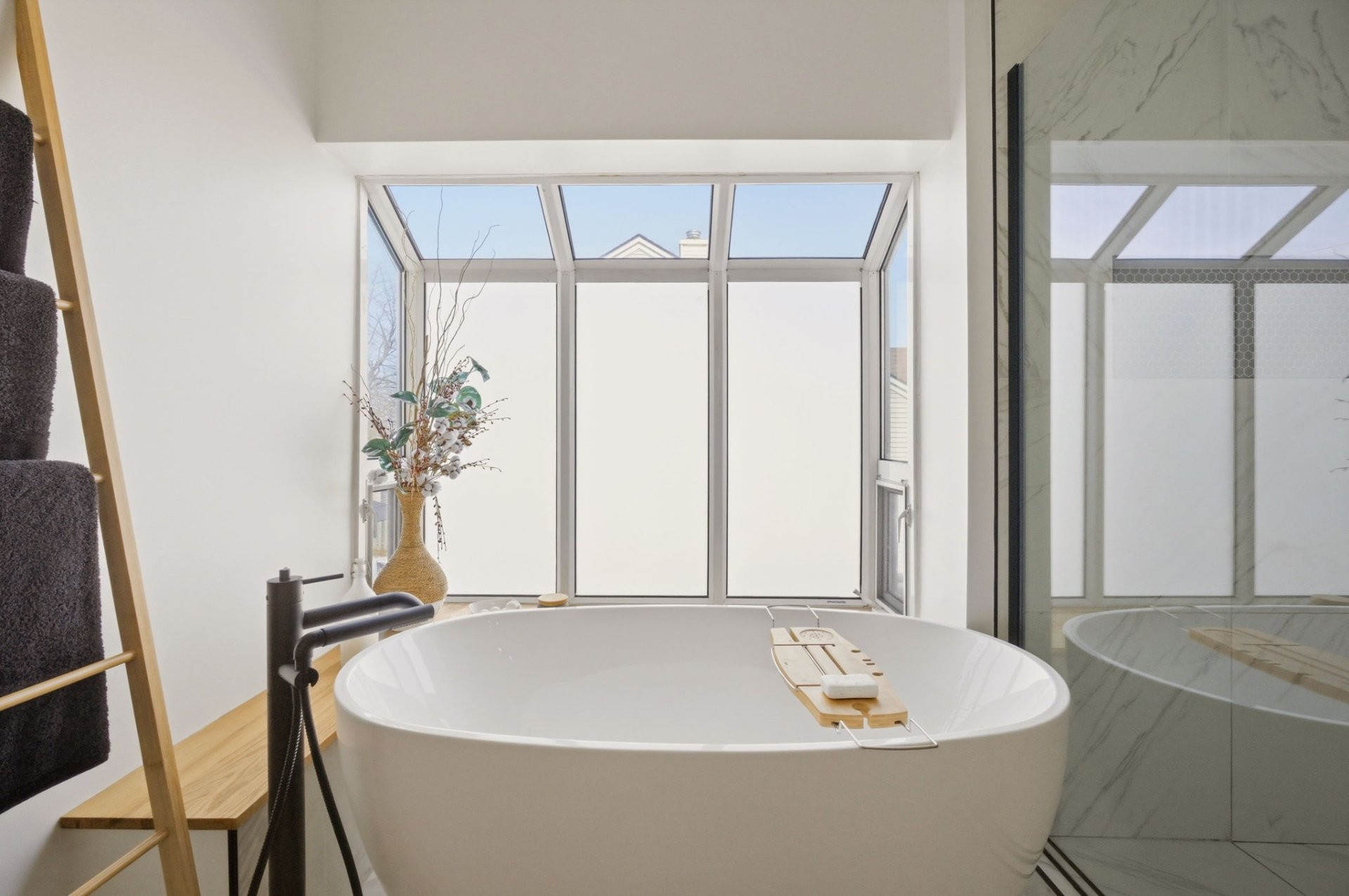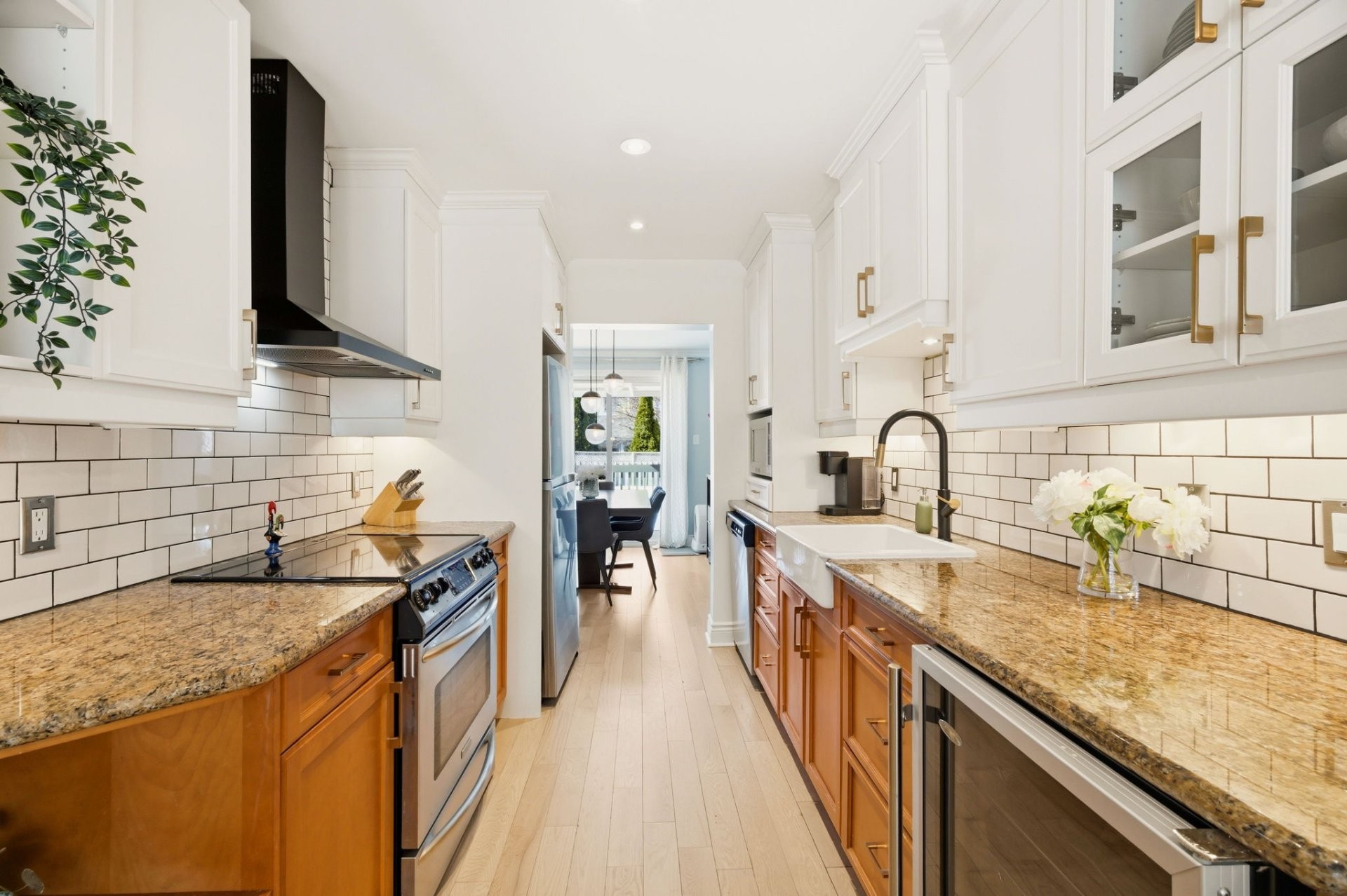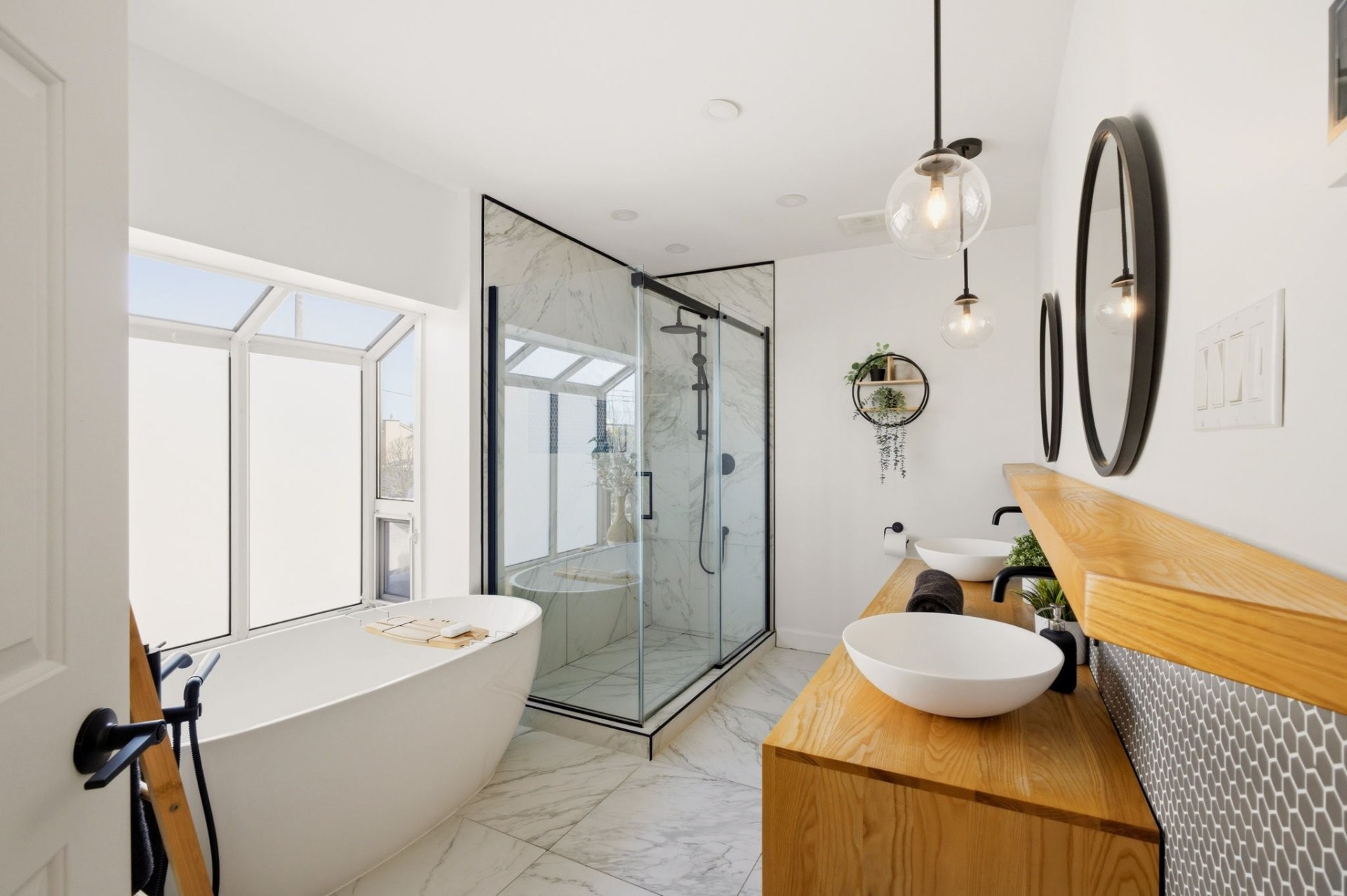 Upstairs, the generous primary bedroom includes a custom-built walk-in closet. The beautifully renovated bathroom features a glass shower, stand-alone tub, heated floors and a large window that fills the space with natural light. Two additional well-sized bedrooms complete this level.