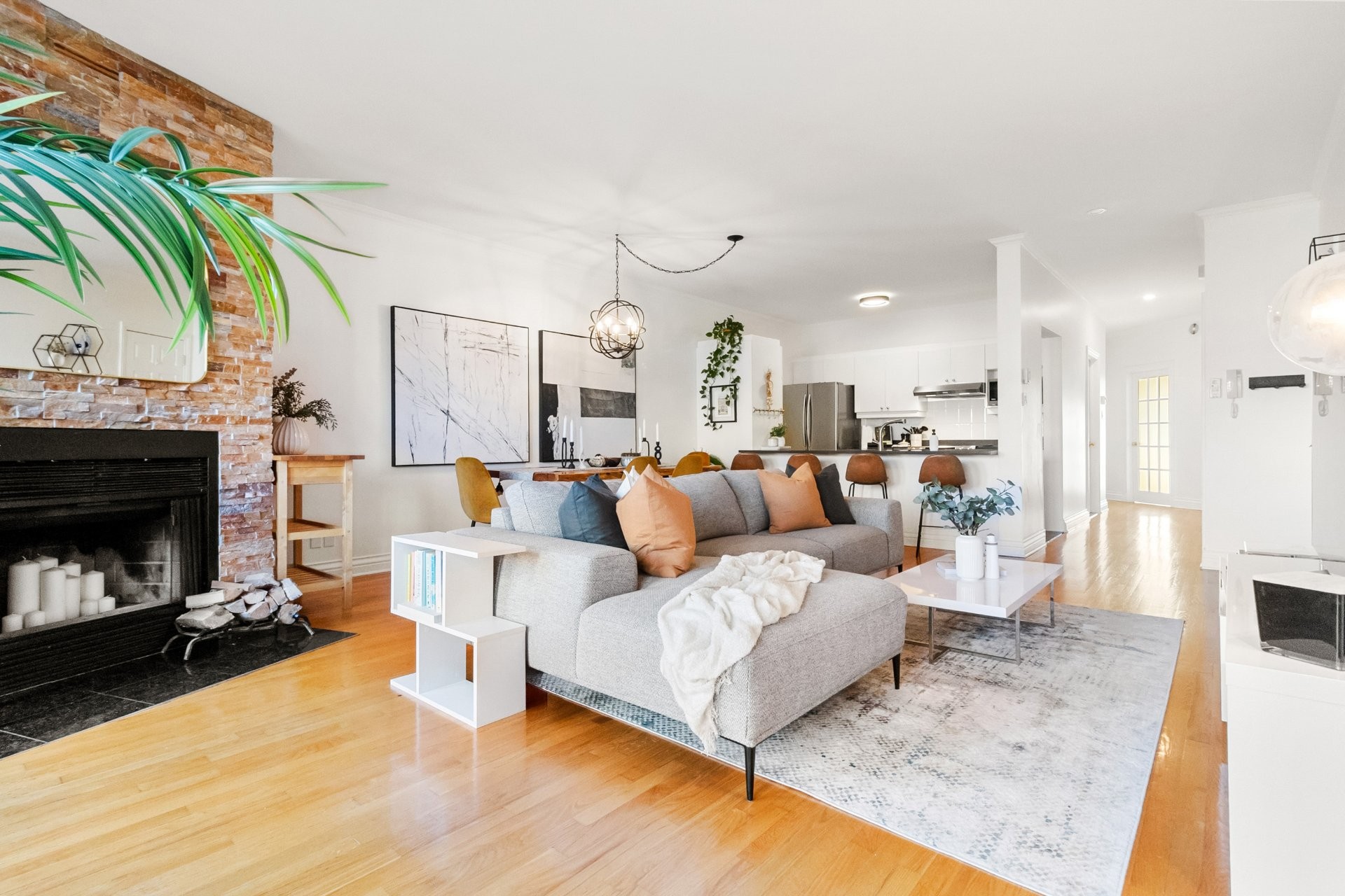 The open-concept layout seamlessly connects the living room, dining area, and kitchen, creating the perfect space for entertaining family and friends. The kitchen features quartz countertops and a functional design that's both stylish and practical. The unit also offers two generously sized bedrooms, a bathroom with a separate shower, and an independent laundry room. Elegant hardwood floors flow throughout.